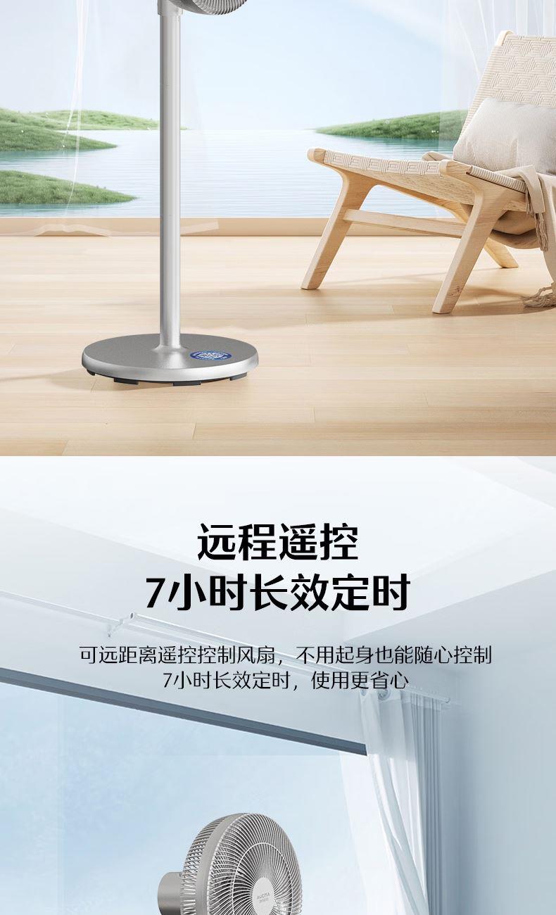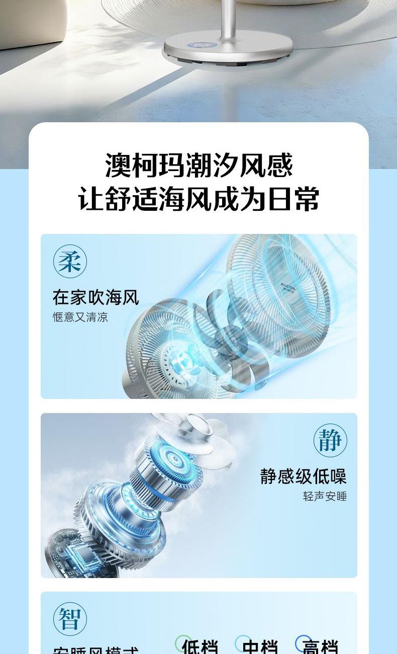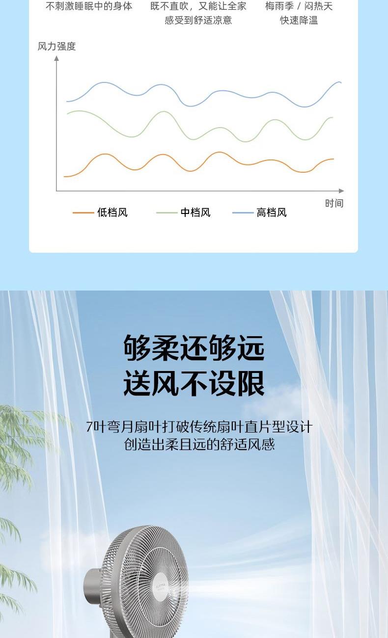 网罩:350mm 扇叶:300mm 7叶弯月扇叶 电机:66-14六系高效电机 立柱:27cm两节ABS 台地立一机三用 包装尺寸:500*210*385mm 风速:5.5m/s 档位:三档 喷漆工艺,质感星空灰配色 模拟潮汐海风 丝丝凉风铺面而来;复刻潮汐清凉海风,体验风的秘密。 产品上下手动摇头,左右自动摇头; 七叶扇叶,风柔音轻,凉爽惬意 安静陪伴,贴身呵护,清凉工作 柔风细腻强而不硬。