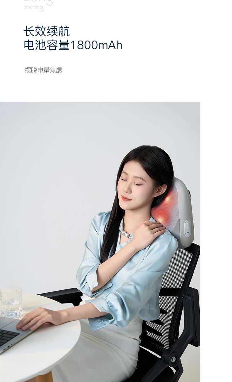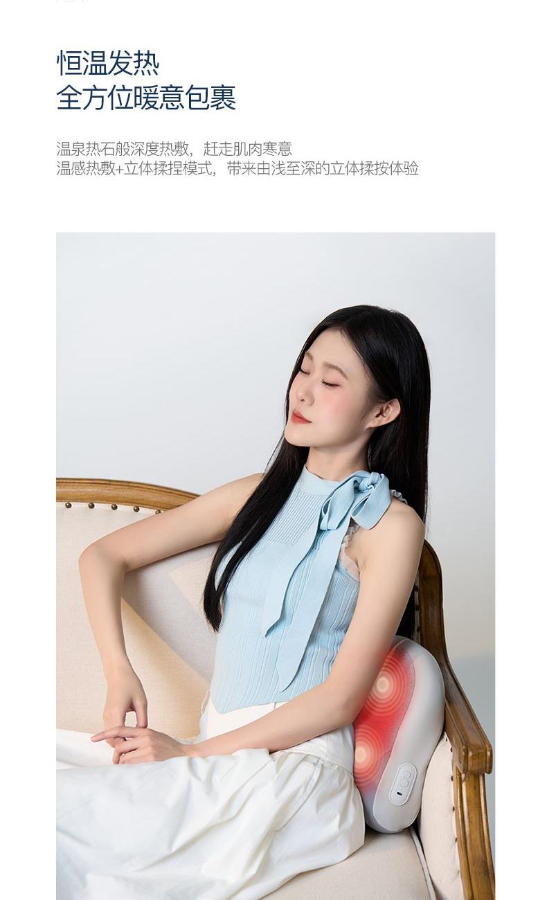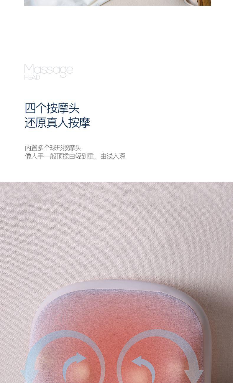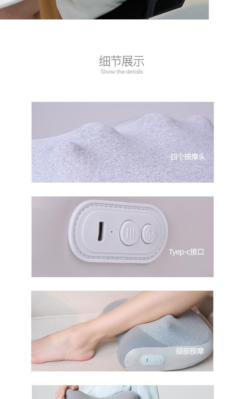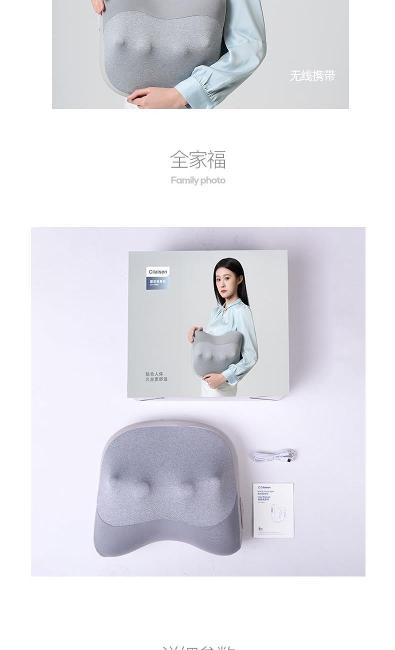 颜色:灰色 额定电压:7.4V;额定功率:9W 产品尺寸:300*150*280mm 包装尺寸:320*140*280mm 产品毛重:1.5kg 装数量:8PCS 包装清单:主机X1、数据线x1、说明书x1 彩盒+邮购盒 核心卖点: 1. 恒温发热,暖意包裹 2、正反转按摩,还原真人按摩 3、一机多用,按摩不止腰背 4、智能定时10分钟,一键操操作,非常简单