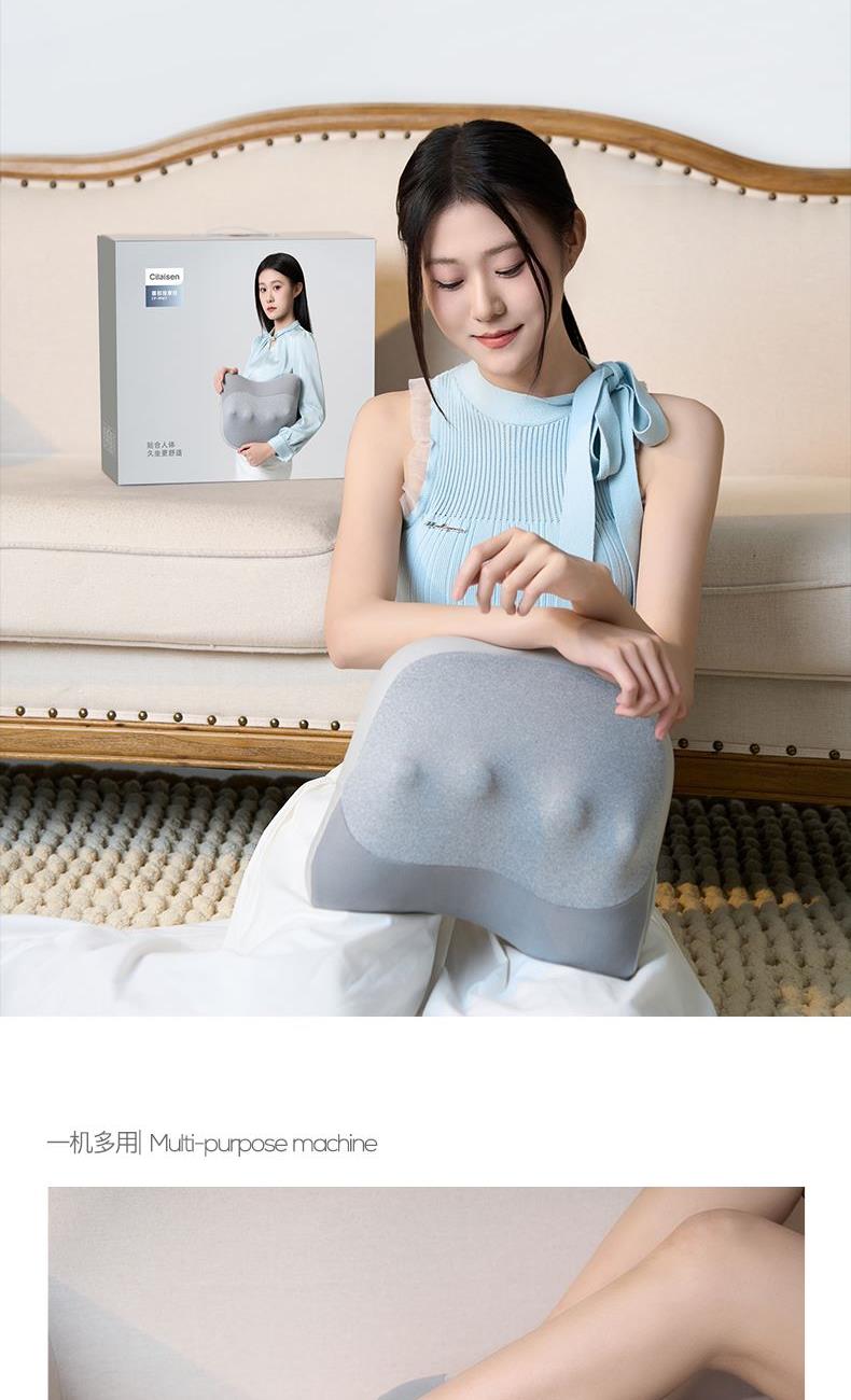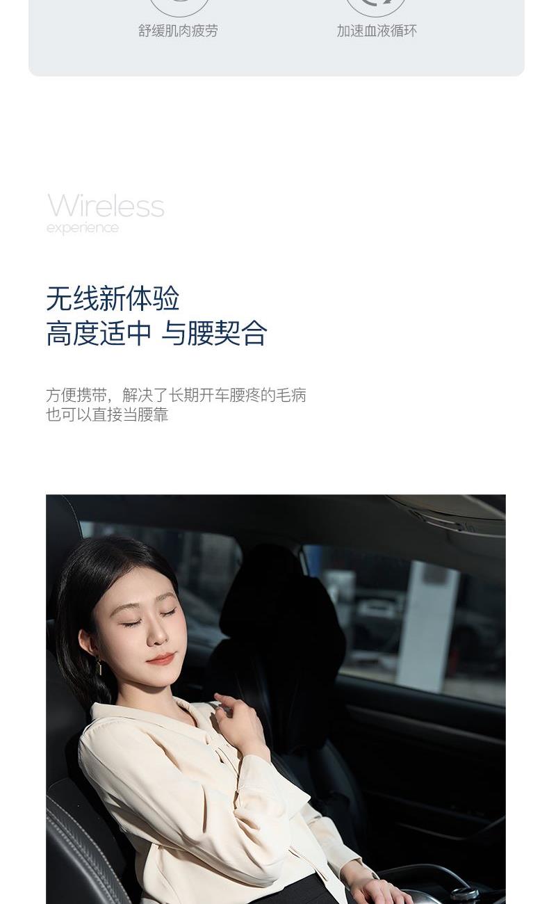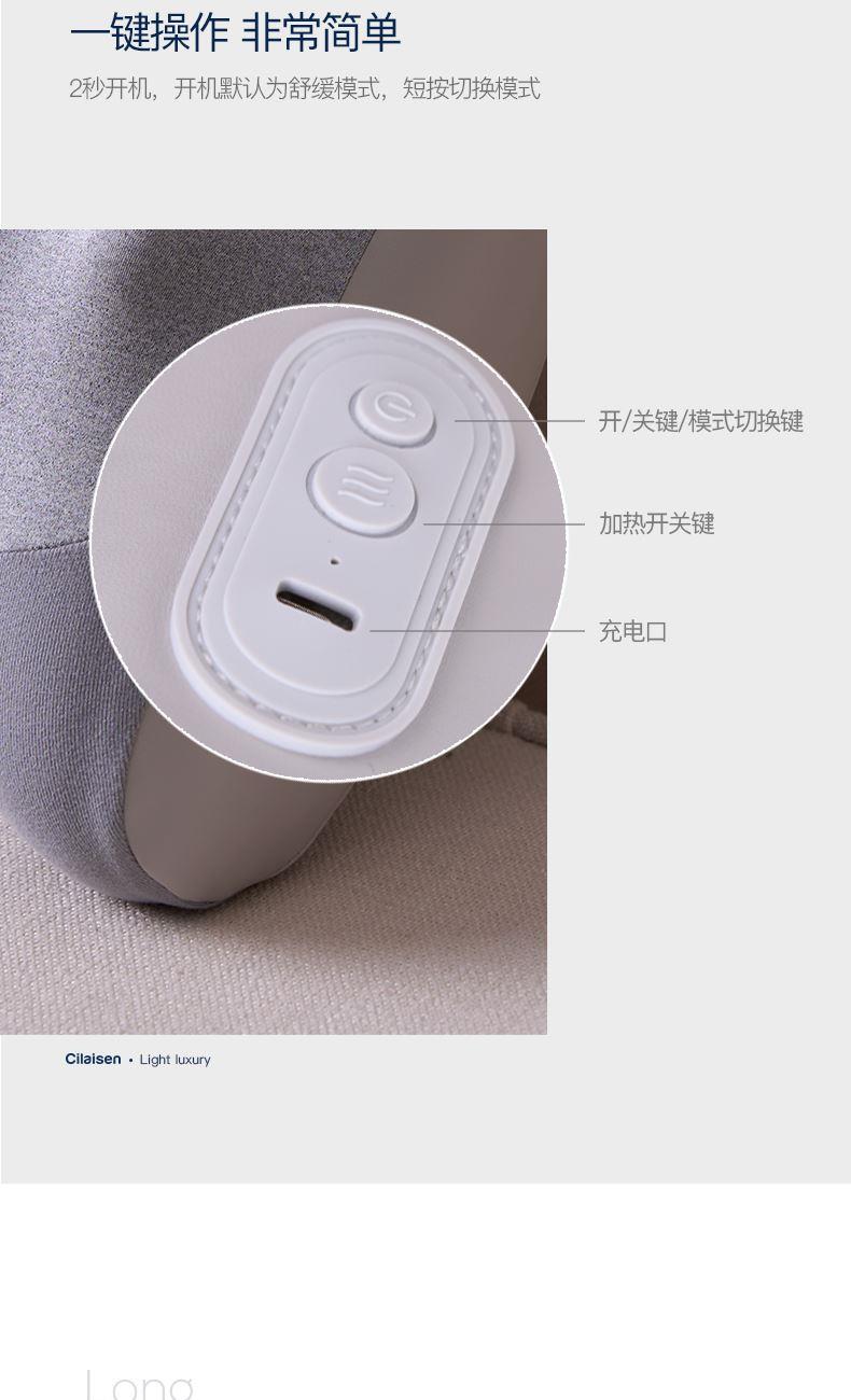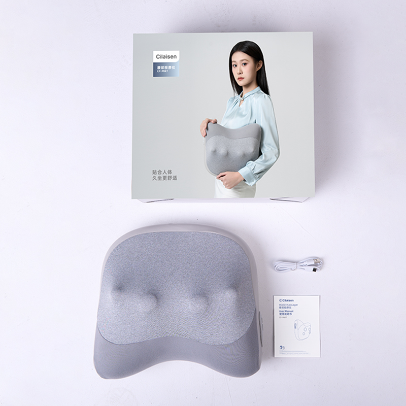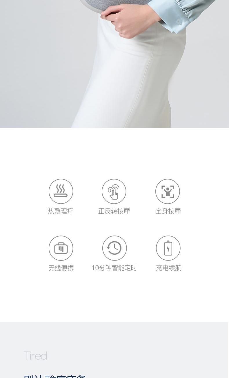 颜色:灰色 额定电压:7.4V;额定功率:9W 产品尺寸:300*150*280mm 包装尺寸:320*140*280mm 产品毛重:1.5kg 装数量:8PCS 包装清单:主机X1、数据线x1、说明书x1 彩盒+邮购盒 核心卖点: 1. 恒温发热,暖意包裹 2、正反转按摩,还原真人按摩 3、一机多用,按摩不止腰背 4、智能定时10分钟,一键操操作,非常简单