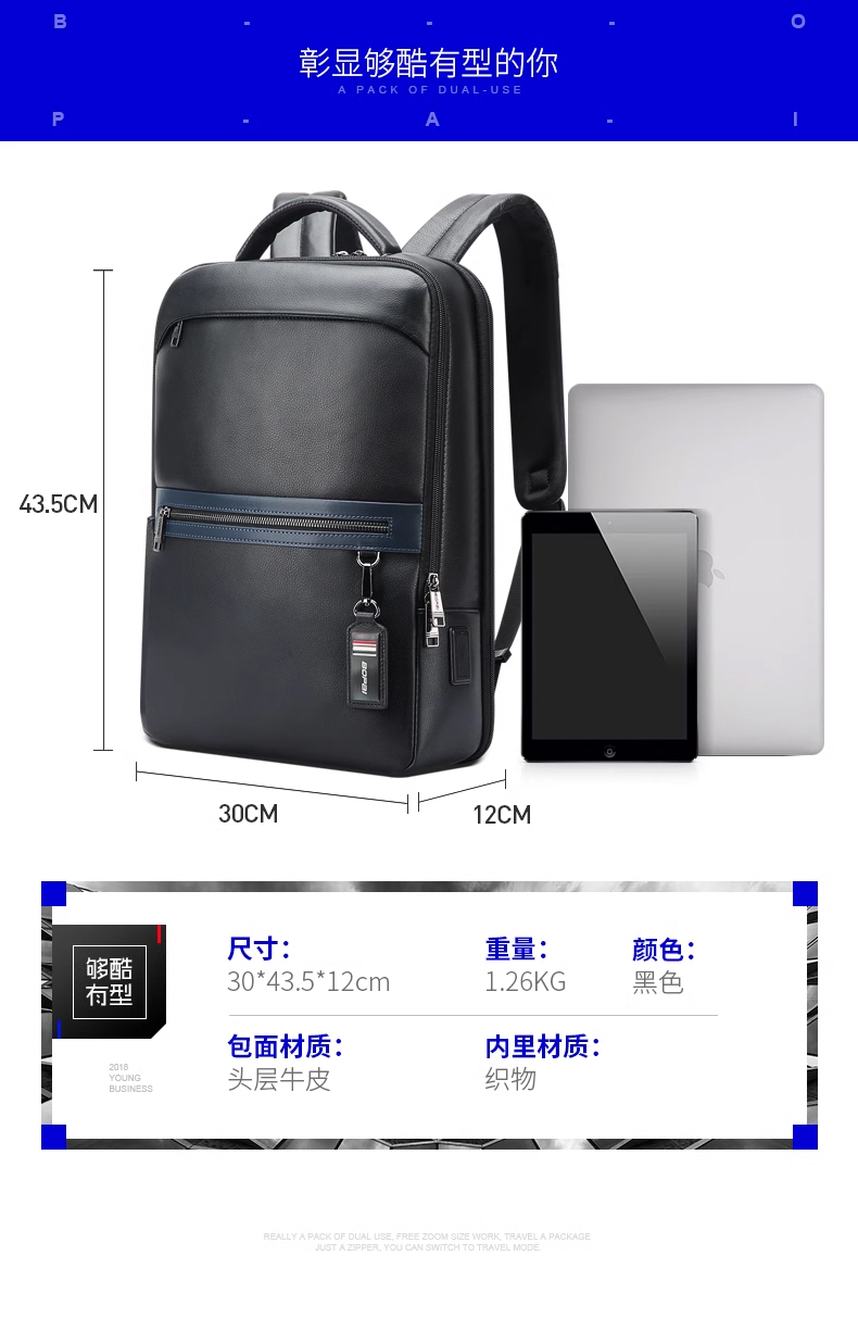 材质:头层牛皮/超纤皮 尺寸:30*12*43.5cm 颜色:黑色