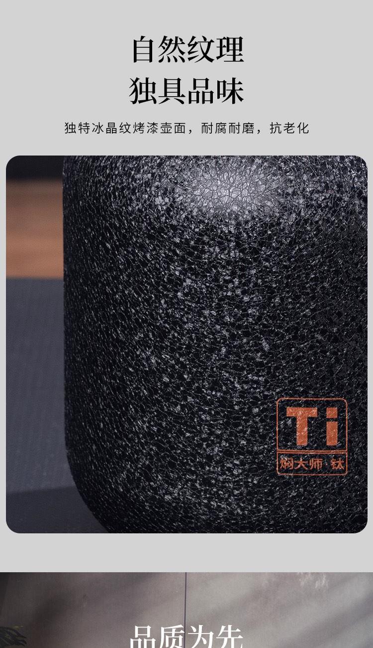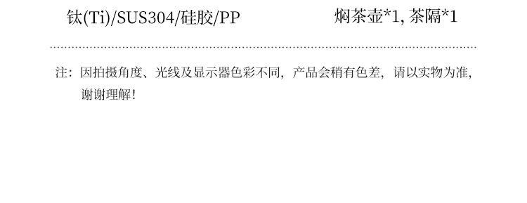 一键开盖,单手掌控 1600毫升,畅享茶香 时尚外观,独具品味 外壳材质:奥氏体型不锈钢06Cr19Ni10(304) 内胆材质:纯钛(Titanium) 茶隔材质:纯钛(Titanium) 塑 件:聚丙烯PP(食品接触用) 密 封 圈:食品接触用硅胶 保温效力:室温25℃条件下95℃满水容量测试12h≥50℃ 配 置:纯钛内胆闷泡壶+纯钛茶隔 包装尺寸:231*173*245mm 装 箱 数:8只/箱