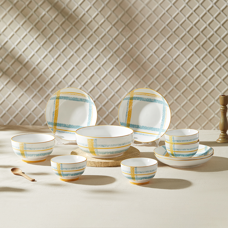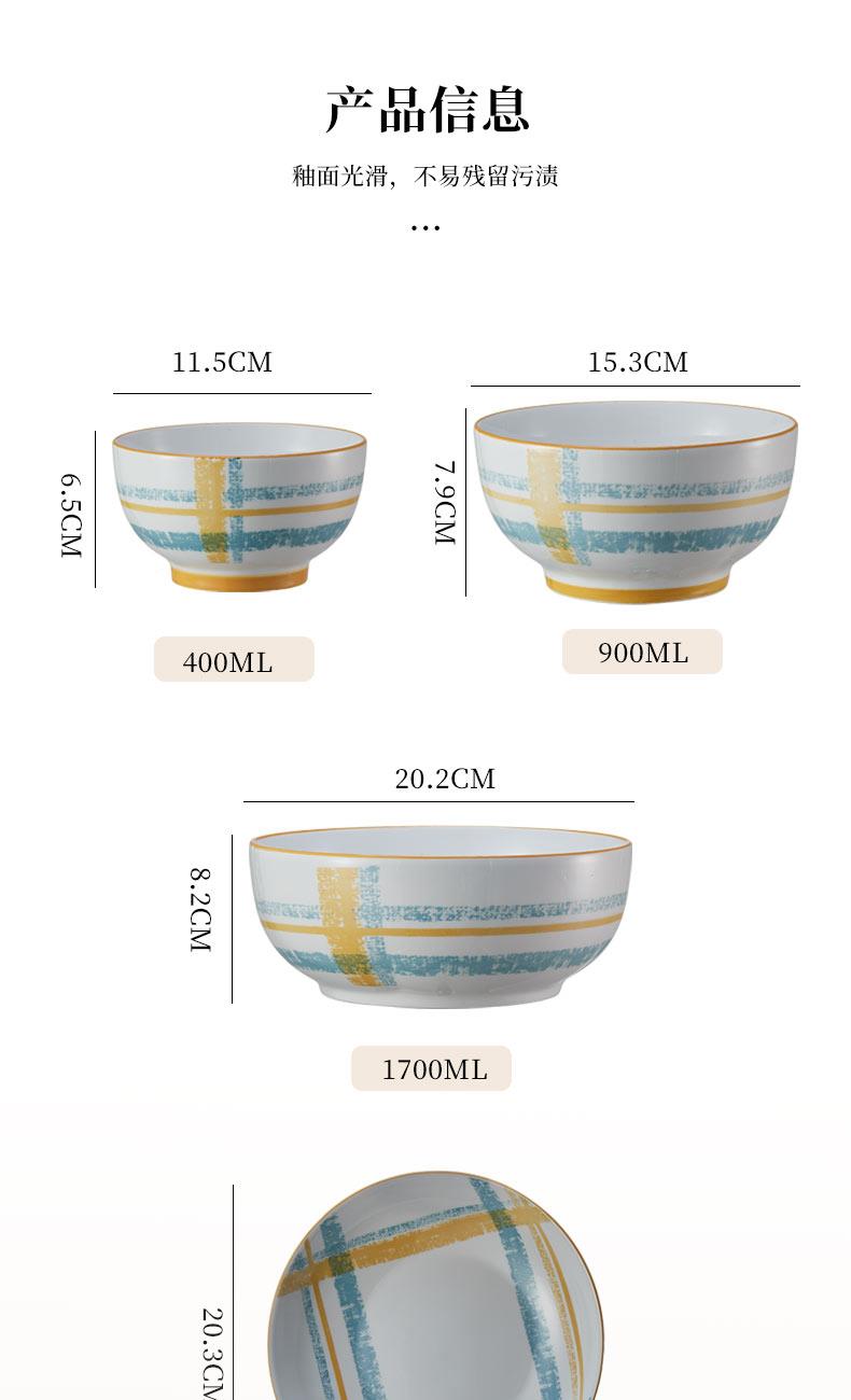 材 质:高温瓷 产品参数:4.5英寸小碗*4、6英寸中碗*1、8英寸盘子*4、 8英寸大碗*1 彩盒尺寸:448*92*439mm 外箱尺寸:46*39*46cm 产品卖点:1.厚实瓷质,隔热防烫,外观色彩清新、光洁透亮、花面细腻。2.适用于洗碗机,消毒碗柜、微波炉、冰箱等。3.釉面光滑细腻,久用不褪色,釉下彩工艺,描边碗沿,田园复古风格,底部不上釉防滑设计,防滑更平稳。4.性价比高,适合福利集采银行保险项目。