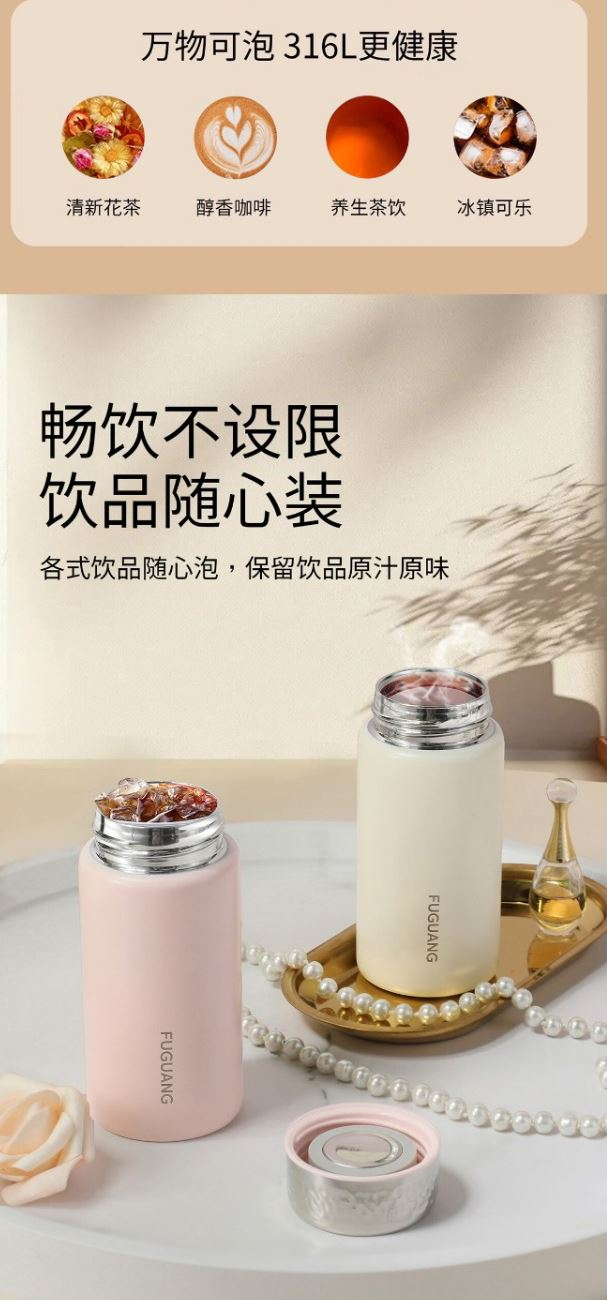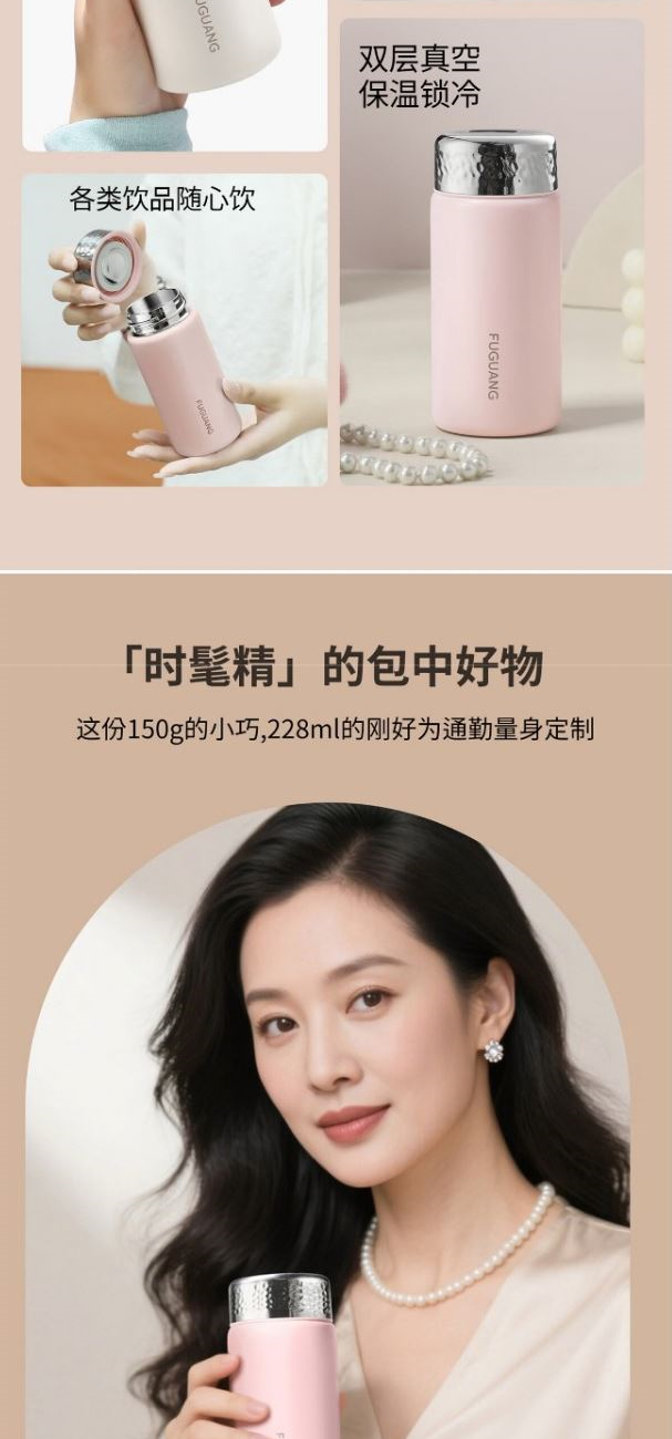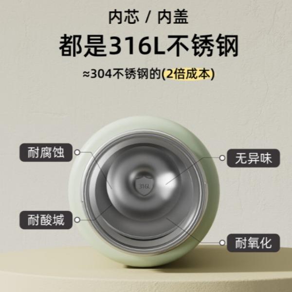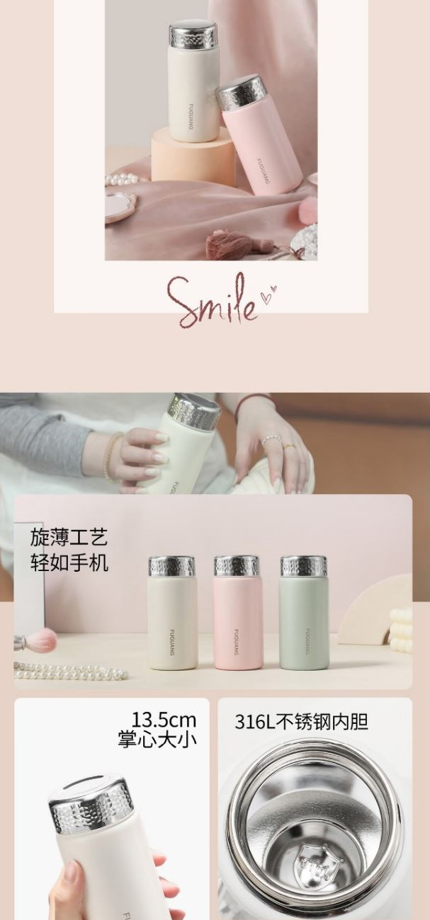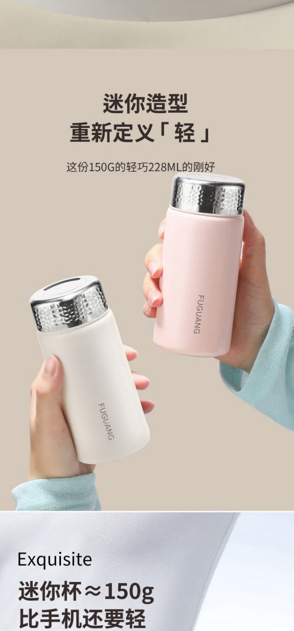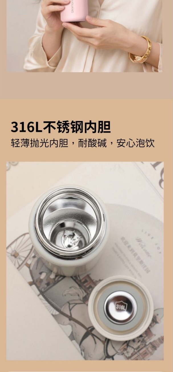 颜色:极简白 烟杏粉 水月绿 容量:228ml 尺寸:58*135mm 材质:316L奥氏体不锈钢内胆,316L不锈钢回流盖。 无尾真空超长保温。 超轻杯身设计,一体成型无缝内胆,随心泡饮,无惧酸碱。 包装:单瓦盒