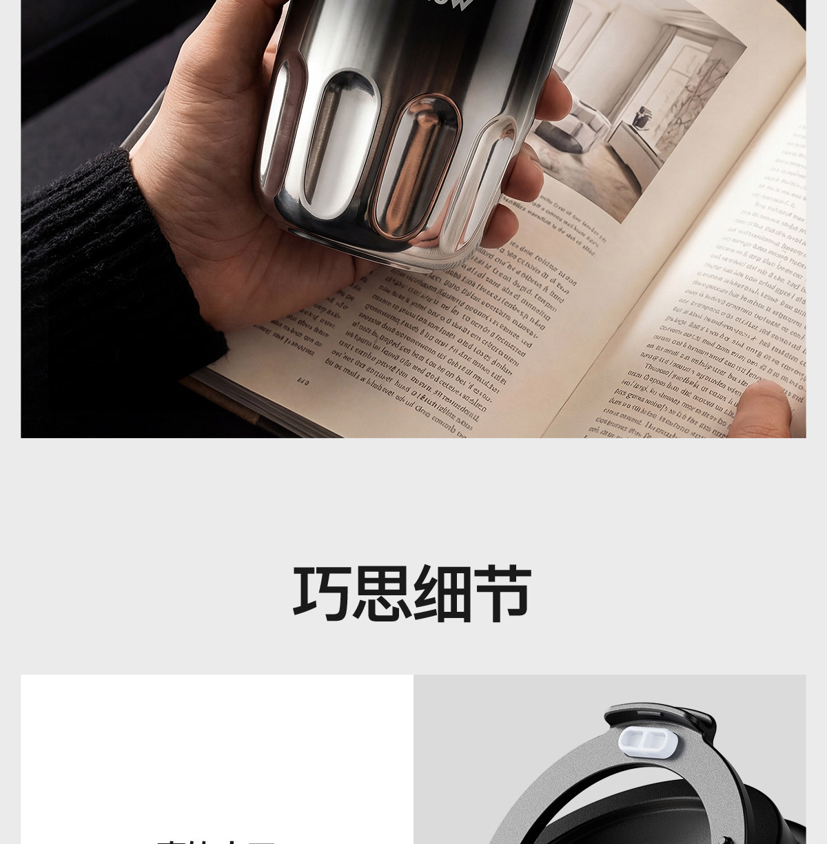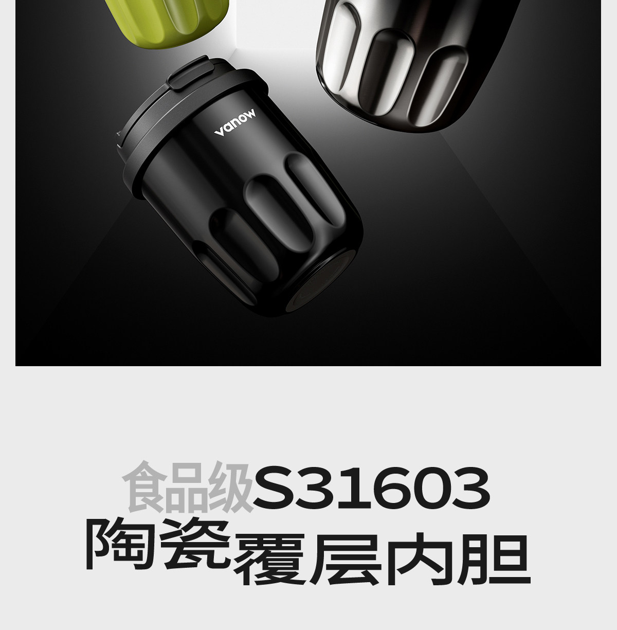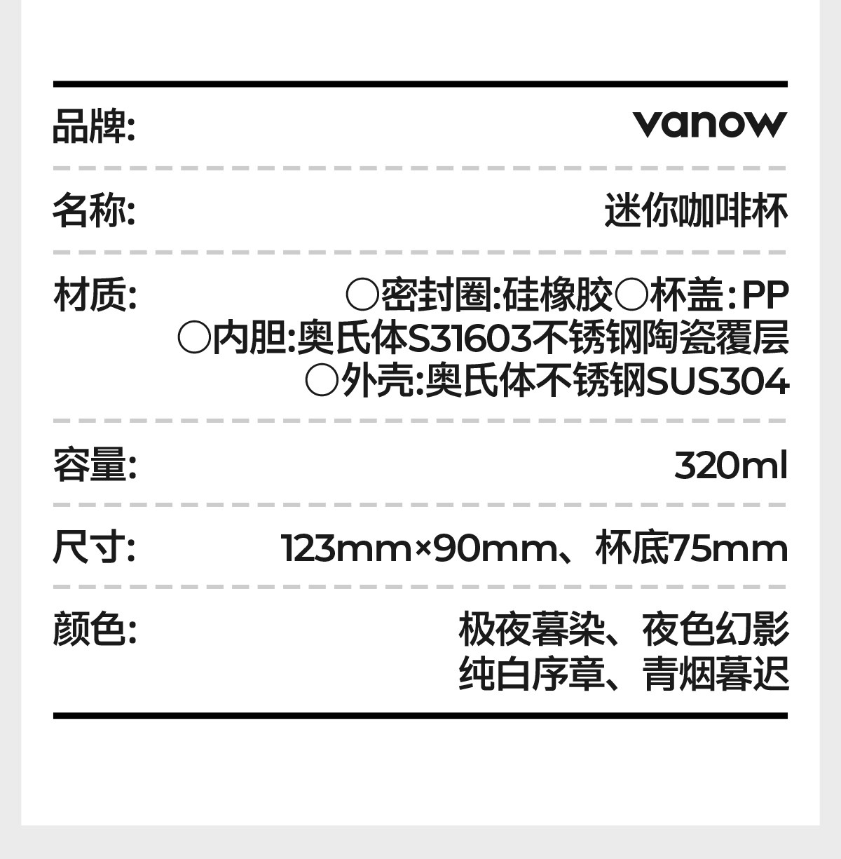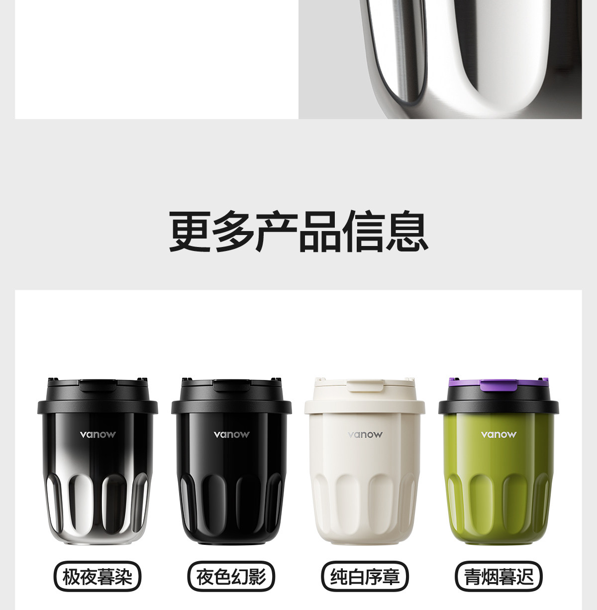 型号:VO-MN32K 颜色:极夜暮染,纯白续章,夜色幻影,青烟暮迟 容量:320ML 尺寸:123*90mm 材质:316不锈钢/食品用pp/硅橡胶 产品卖点:1.长效保温保冷,口感始终在线 2.改变的是日程,不变的是手心温度 3.轻量便携,手握无压力,揣包无负担 4.高颜出街,出行秒变时尚达人 5.翻盖卡扣设计,直饮不碰鼻