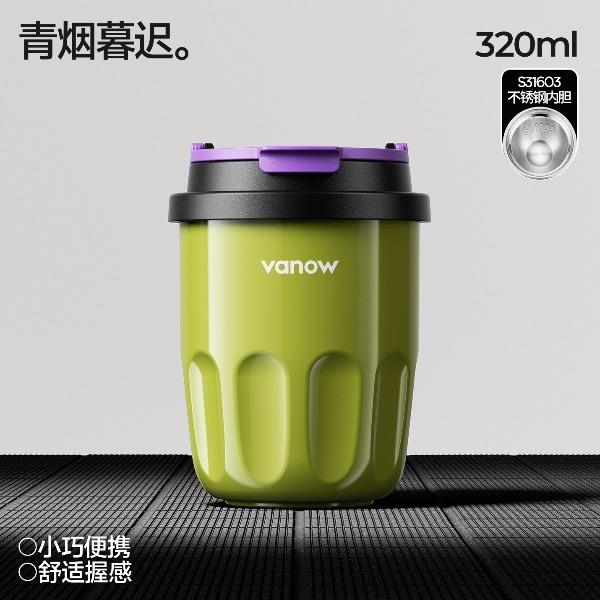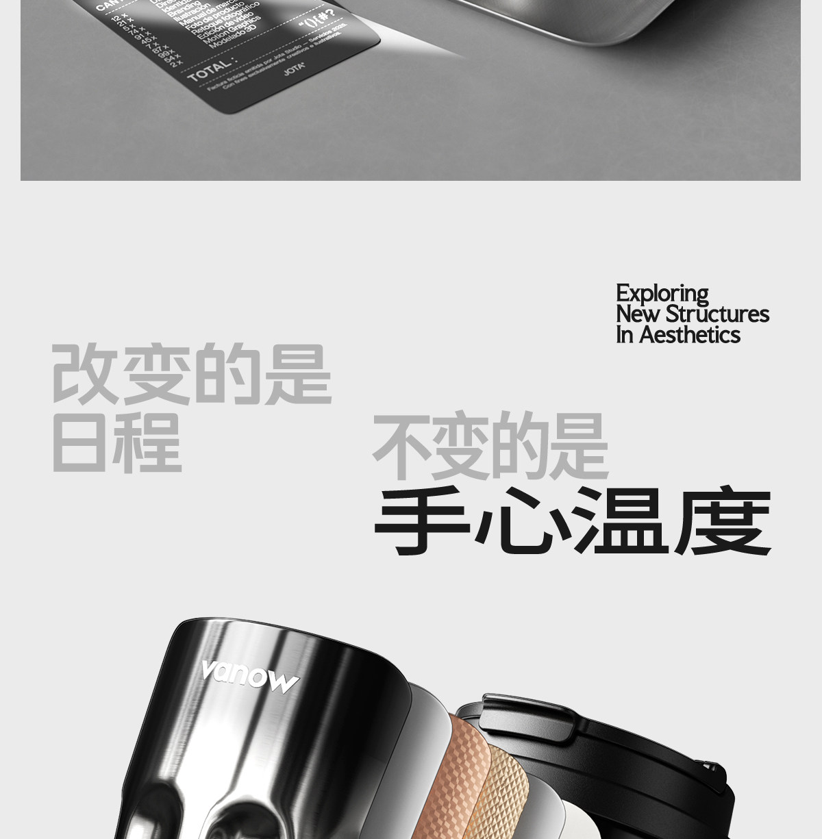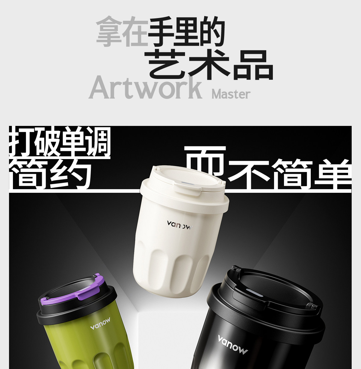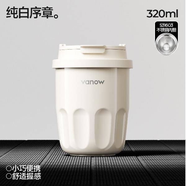 型号:VO-MN32K 颜色:极夜暮染,纯白续章,夜色幻影,青烟暮迟 容量:320ML 尺寸:123*90mm 材质:316不锈钢/食品用pp/硅橡胶 产品卖点:1.长效保温保冷,口感始终在线 2.改变的是日程,不变的是手心温度 3.轻量便携,手握无压力,揣包无负担 4.高颜出街,出行秒变时尚达人 5.翻盖卡扣设计,直饮不碰鼻