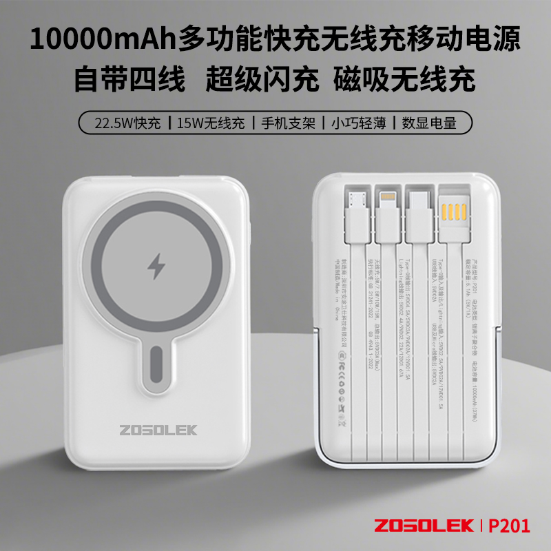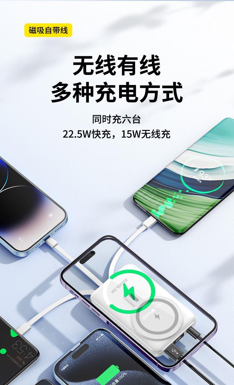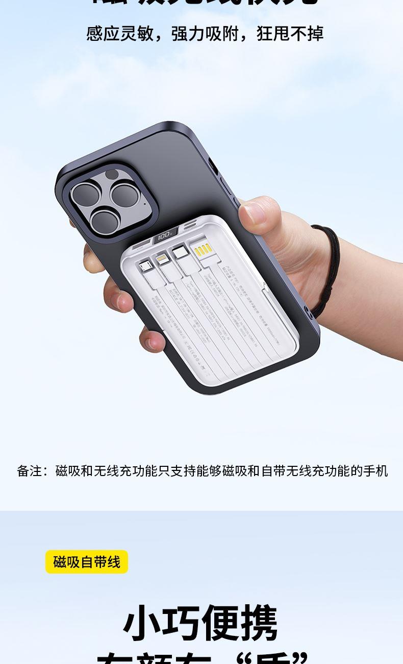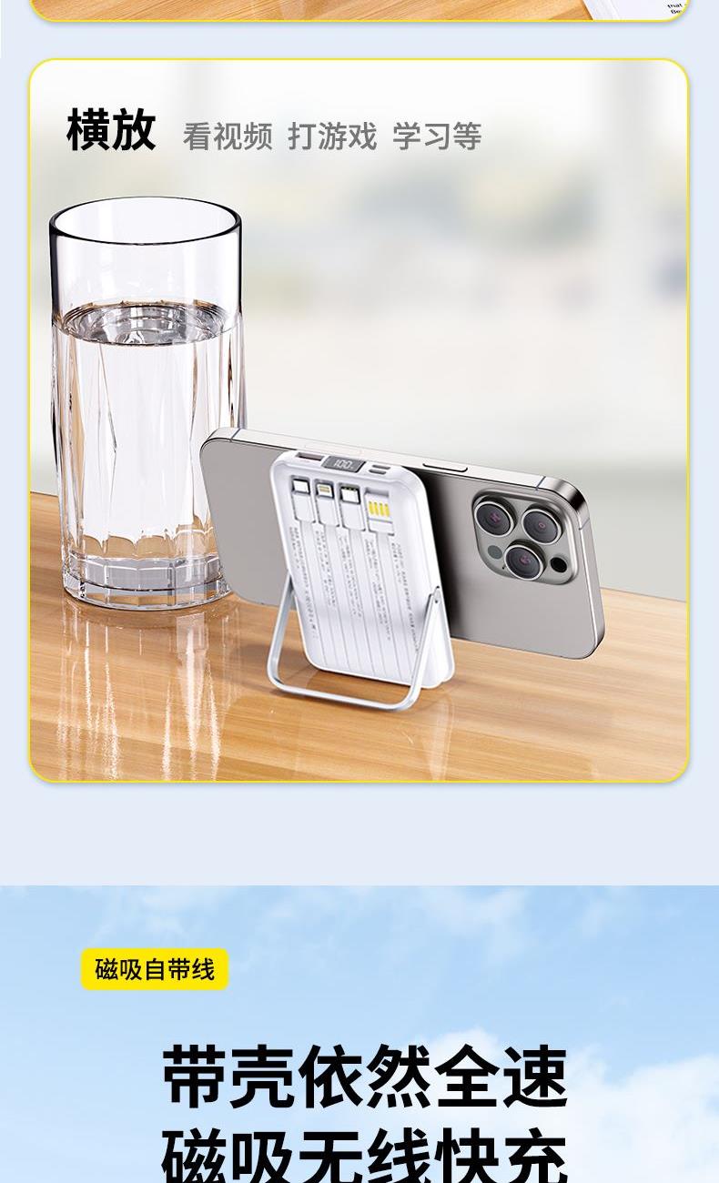 产品特点:1、多功能一体化设计,小巧轻薄,携带方便;2、通过中国强制3C认证,符合中国安全标准;3、实标10000mAh容量,不玩虚假;4、自带四线,出门无需带线,可以输入给自己充电,也可以同时输出充多台设备;5、自带3种输入方式、5种有线输出方式及无线充输出;6、支持22.5W超级闪充及PD快充协议,快速充电;7、15W磁吸无线充,支持无线快充;8、自带手机支架,横竖可放;9、充电范围更广,支持绝大部分数码充电设备;10、数显电量,电量由您掌控;11、彩盒包装,支持各类定制需求。