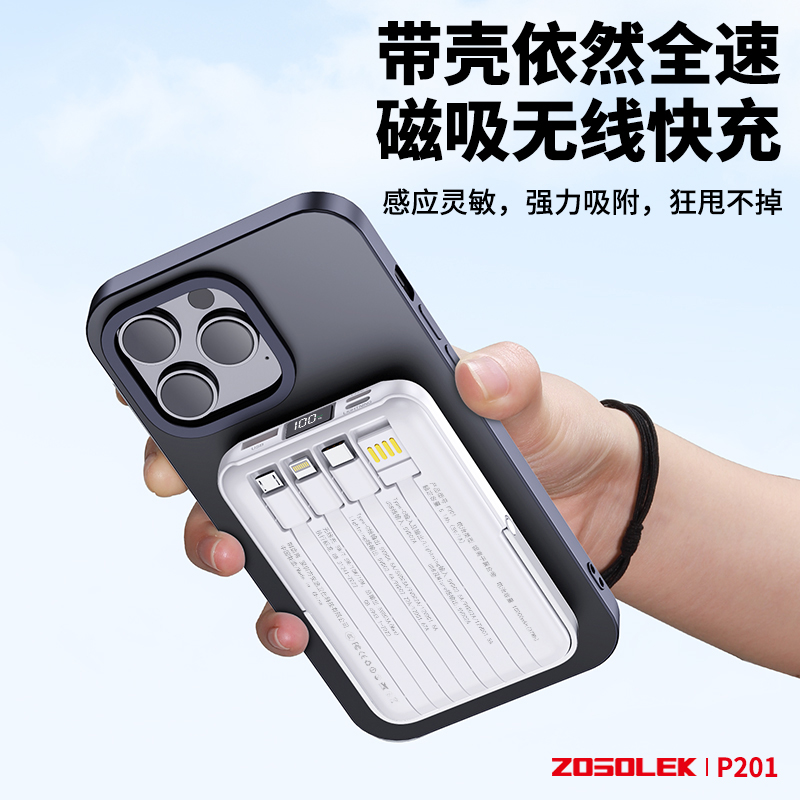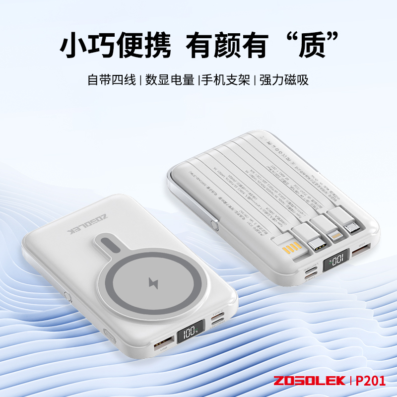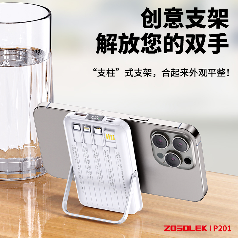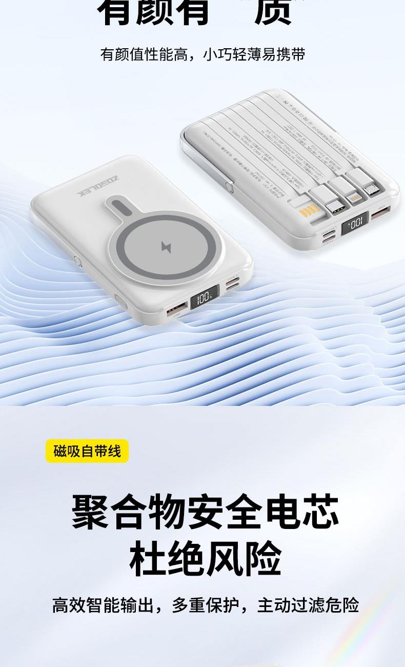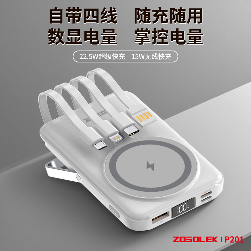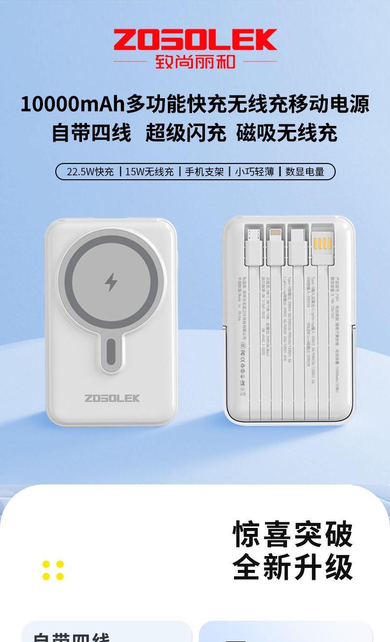 产品特点:1、多功能一体化设计,小巧轻薄,携带方便;2、通过中国强制3C认证,符合中国安全标准;3、实标10000mAh容量,不玩虚假;4、自带四线,出门无需带线,可以输入给自己充电,也可以同时输出充多台设备;5、自带3种输入方式、5种有线输出方式及无线充输出;6、支持22.5W超级闪充及PD快充协议,快速充电;7、15W磁吸无线充,支持无线快充;8、自带手机支架,横竖可放;9、充电范围更广,支持绝大部分数码充电设备;10、数显电量,电量由您掌控;11、彩盒包装,支持各类定制需求。