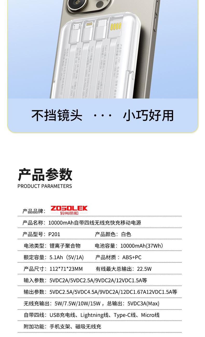 致尚丽和10000mAh自带四线无线充快充移动电源P201