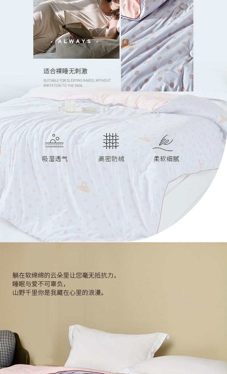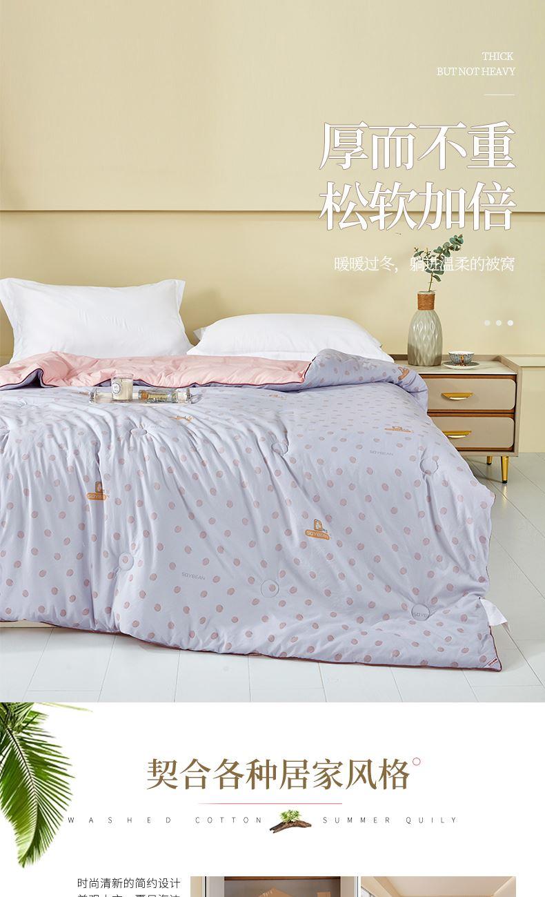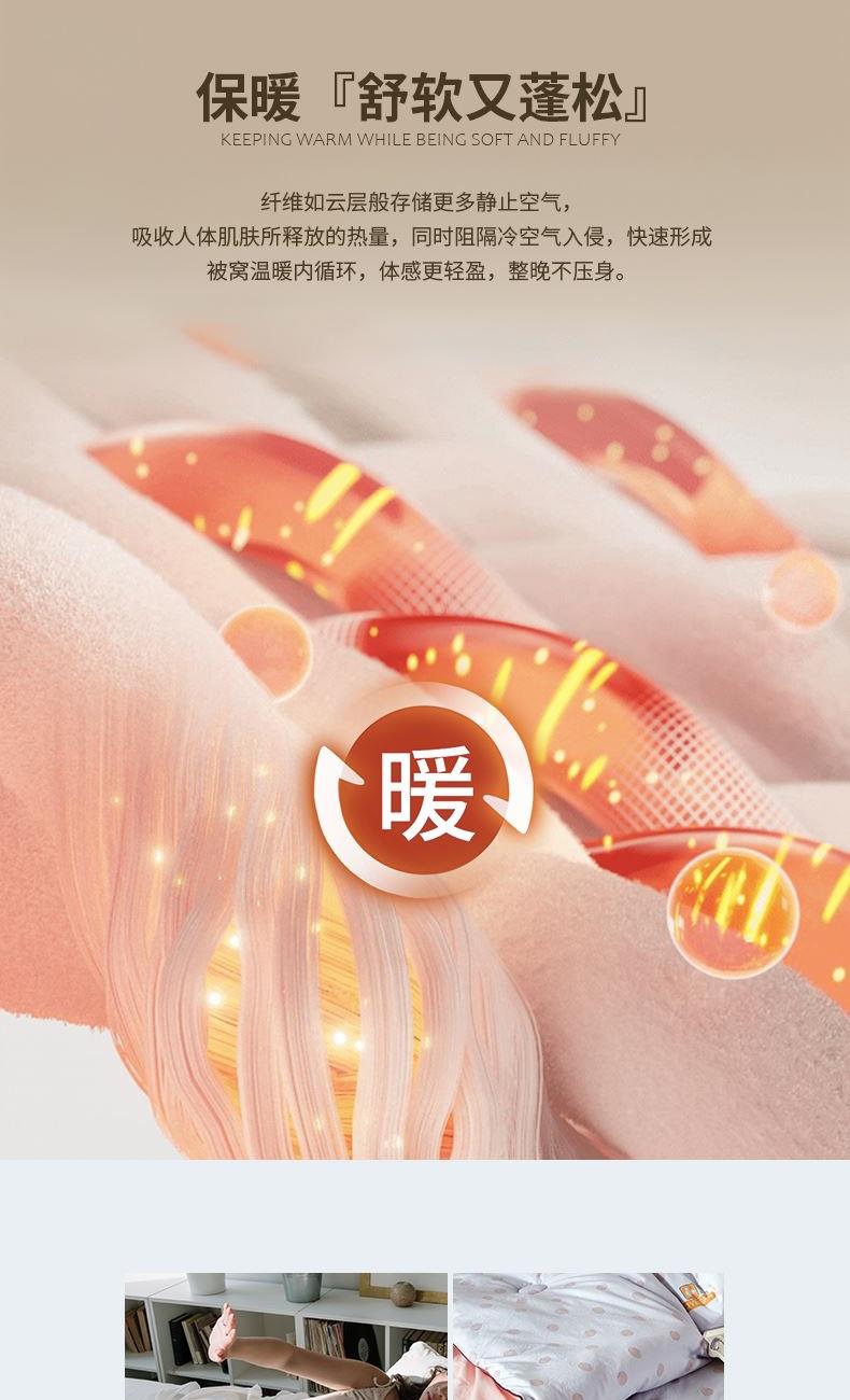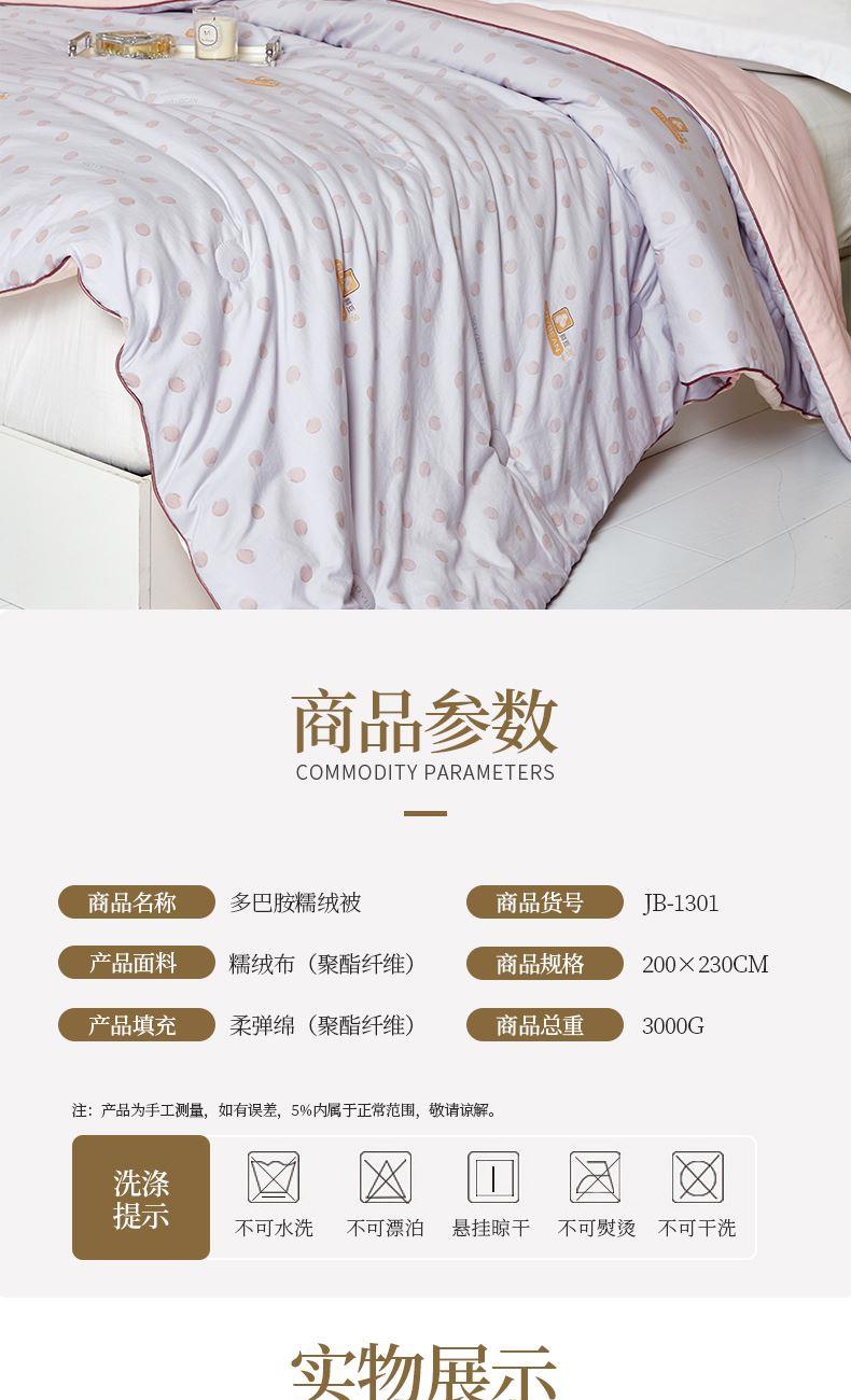 规 格:200x230cm 面 料:糯绒布 填 充:柔弹绵 克 重:3000G 高支高密糯绒棉/鲜豆因子够软够暖,亲肤贴身,沾被即睡,沉浸式睡眠体验、保暖更透气。 合理科学配比,健康滋养肌肤手感顺滑,排湿透气性好,使被子更加干爽透气,富有弹性。