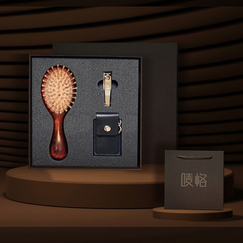主要材质:山羊角、檀木、钢 、牛皮 指甲刀尺寸:70*40(含皮套) 气垫梳尺寸:160*60MM(宽处) 包装盒尺寸:195*130*48MM