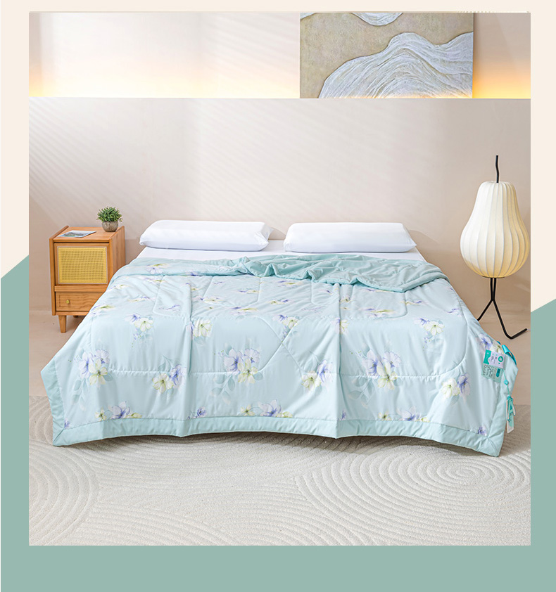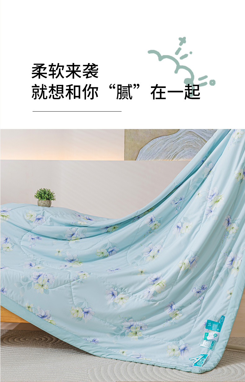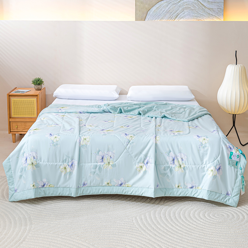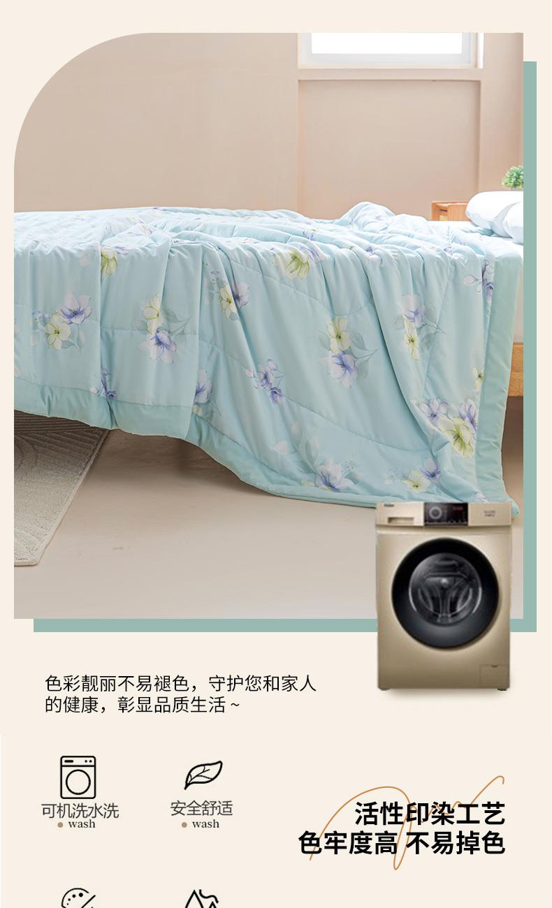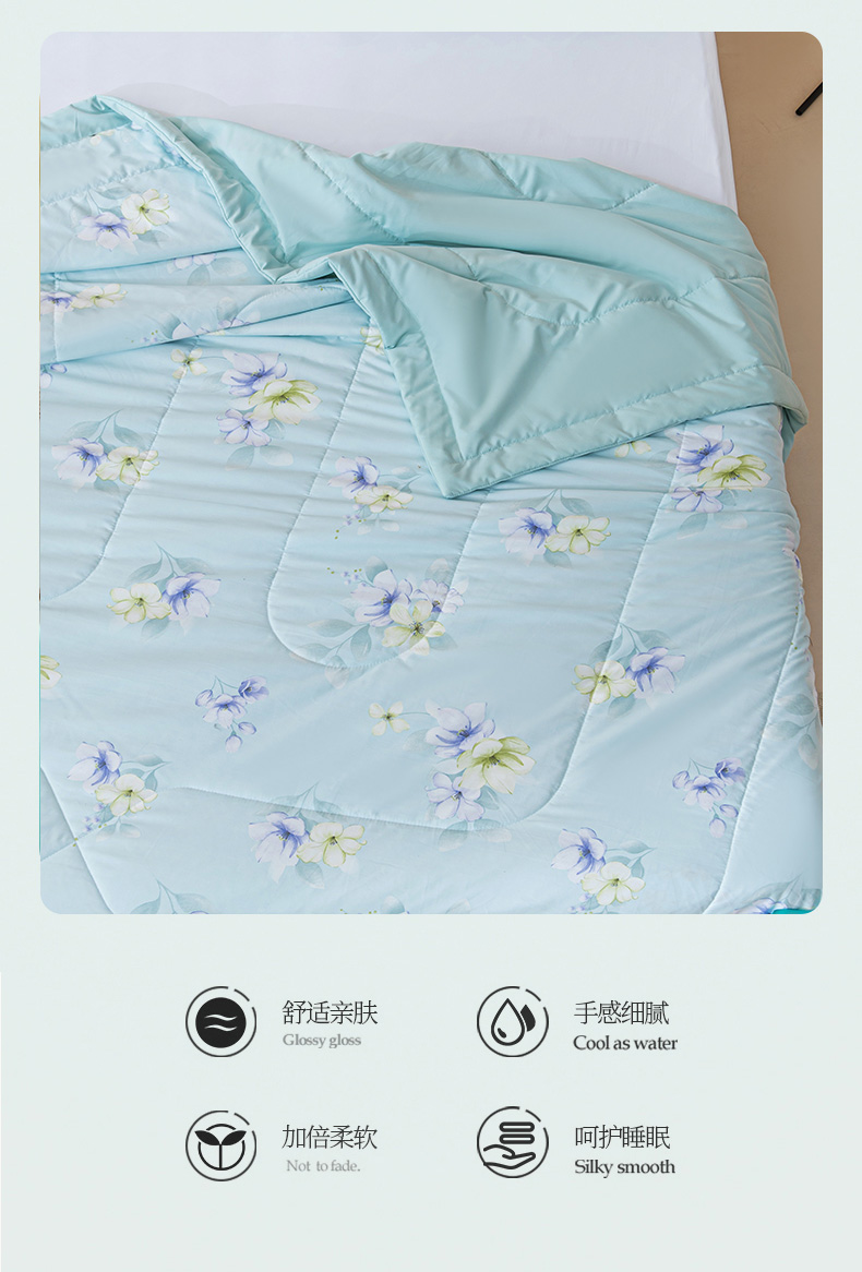 规 格: 200*230cm 花 型:花香丽人、淡雅幽香粉、淡雅幽香兰、花园兔-蓝、花园兔-粉 面 料: 莱卡天丝(聚酯纤维) 填充物:整张羽丝绒棉(聚酯纤维) 工 艺: 定位绗缝/手工包边 采用莱卡天丝面料制作,顺滑舒适清凉,入手冰冰凉凉, 整张羽丝绒棉填充,贴身使用,无需套被套,直接贴身使用,机洗手洗均可,活色印染,久洗如新。定位绗缝工艺,宽包边固定填充内芯不移位,洗后不结团,吸湿透气性好。