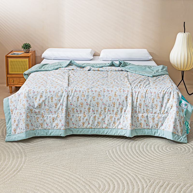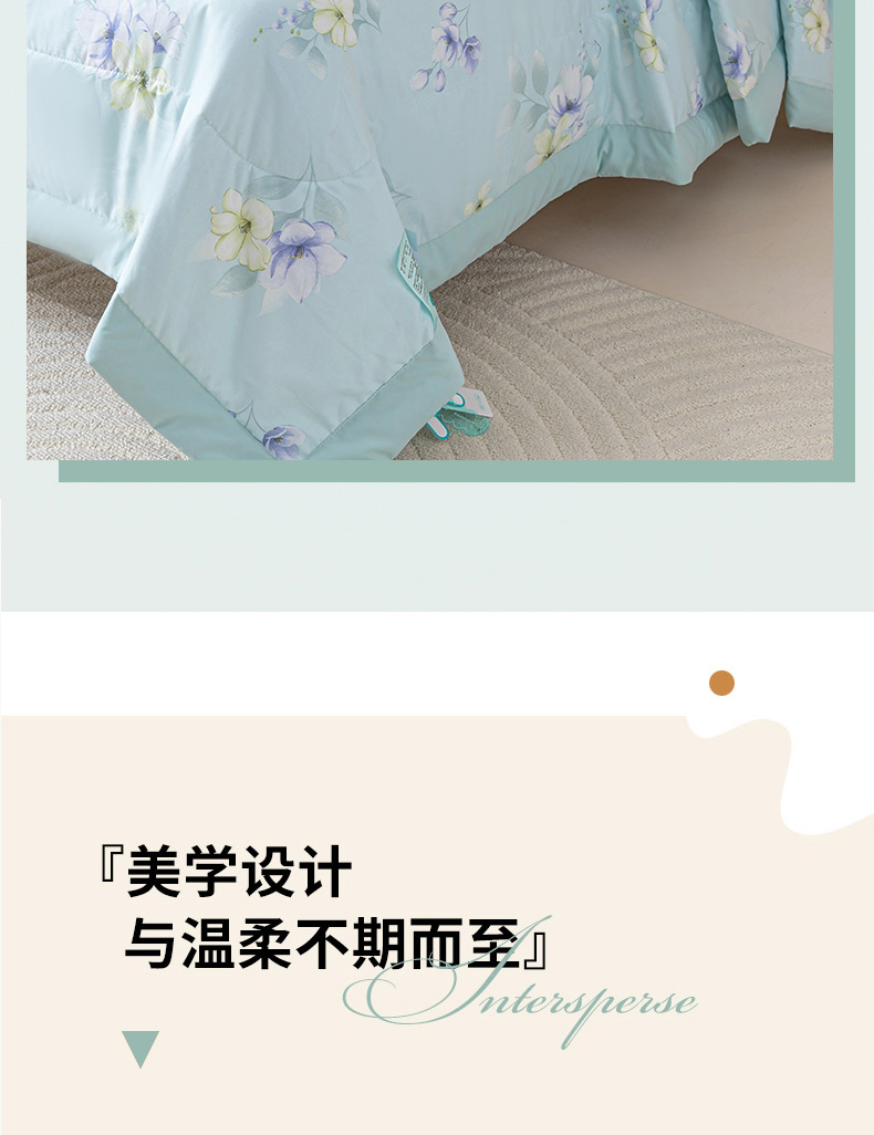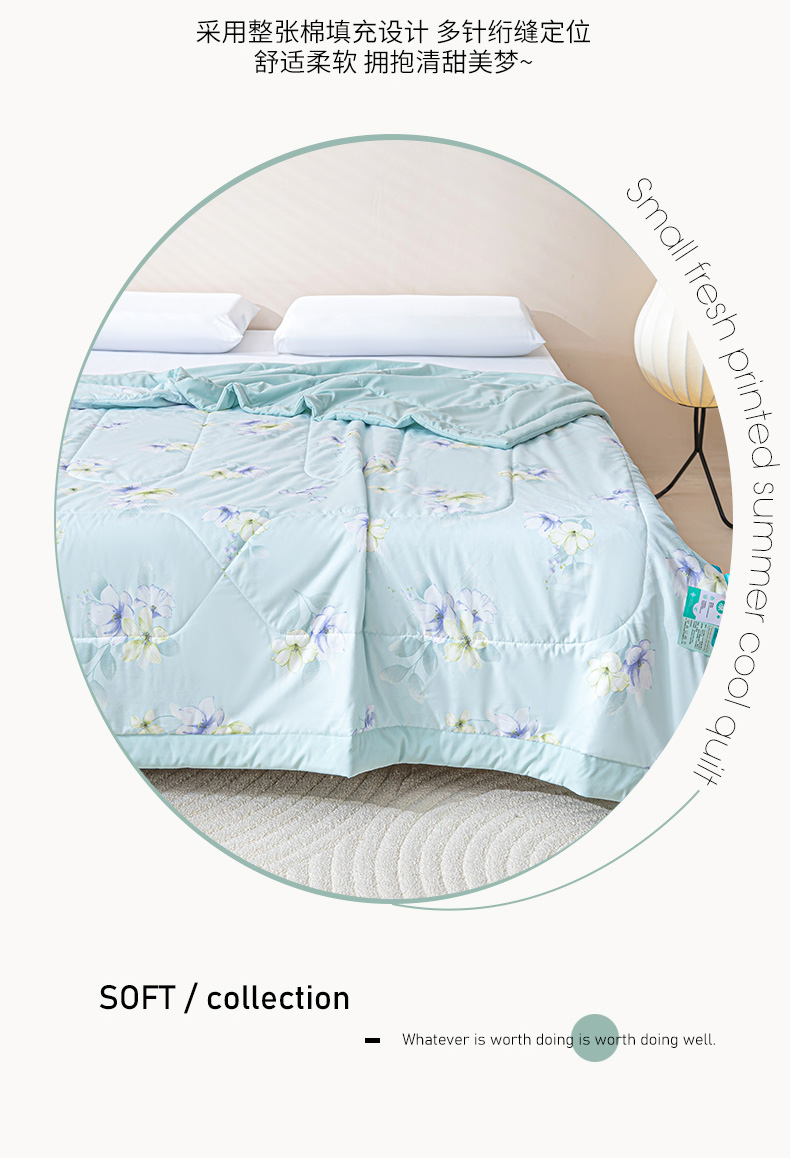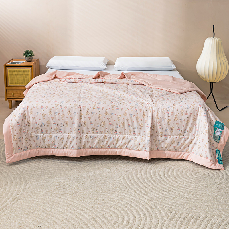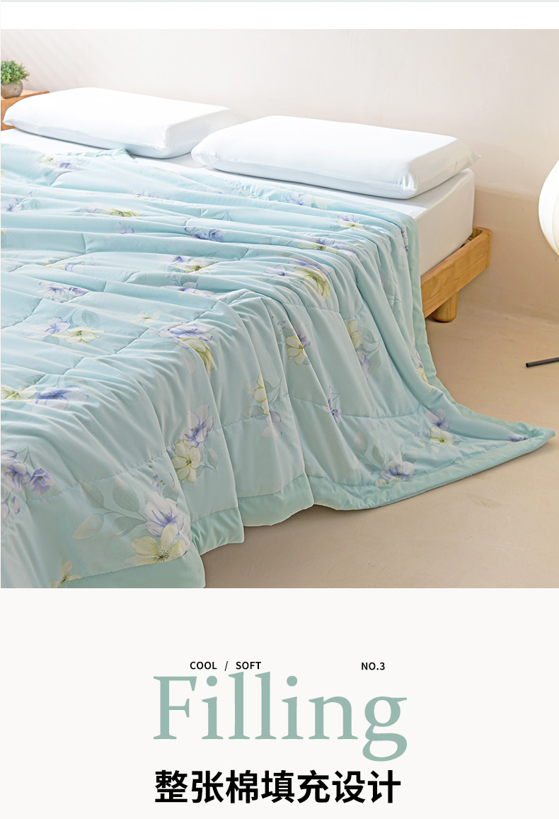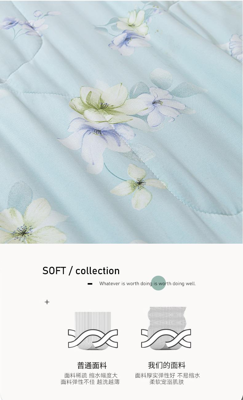 规 格: 200*230cm 花 型:花香丽人、淡雅幽香粉、淡雅幽香兰、花园兔-蓝、花园兔-粉 面 料: 莱卡天丝(聚酯纤维) 填充物:整张羽丝绒棉(聚酯纤维) 工 艺: 定位绗缝/手工包边 采用莱卡天丝面料制作,顺滑舒适清凉,入手冰冰凉凉, 整张羽丝绒棉填充,贴身使用,无需套被套,直接贴身使用,机洗手洗均可,活色印染,久洗如新。定位绗缝工艺,宽包边固定填充内芯不移位,洗后不结团,吸湿透气性好。