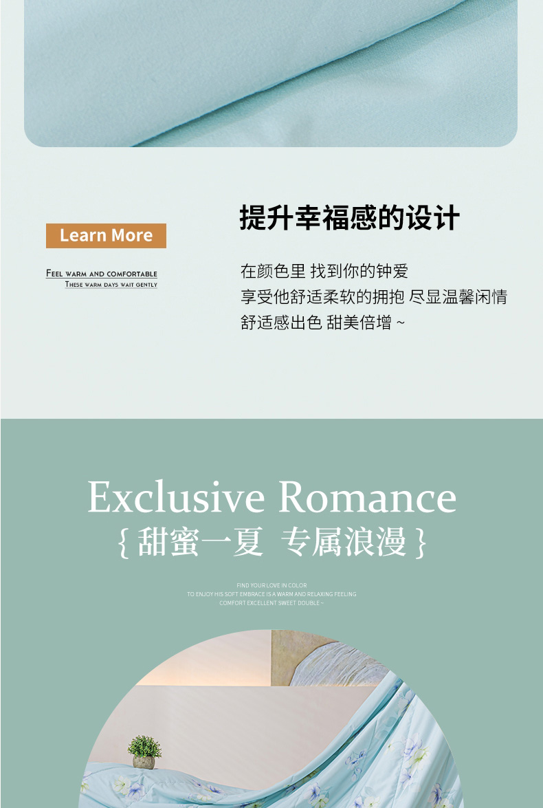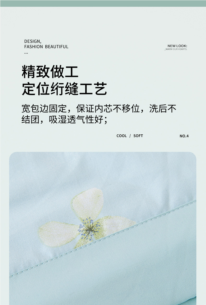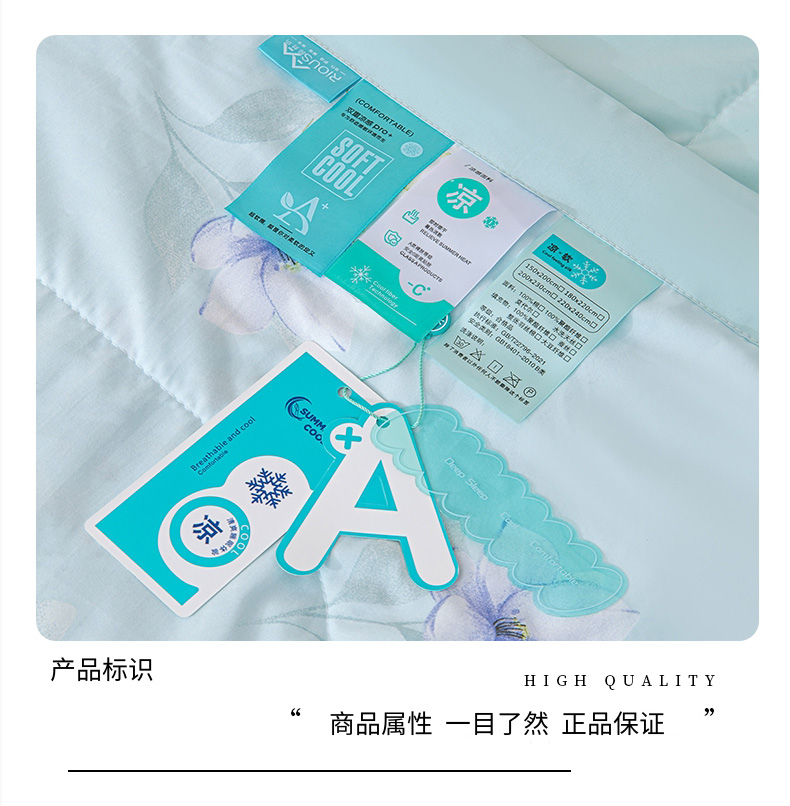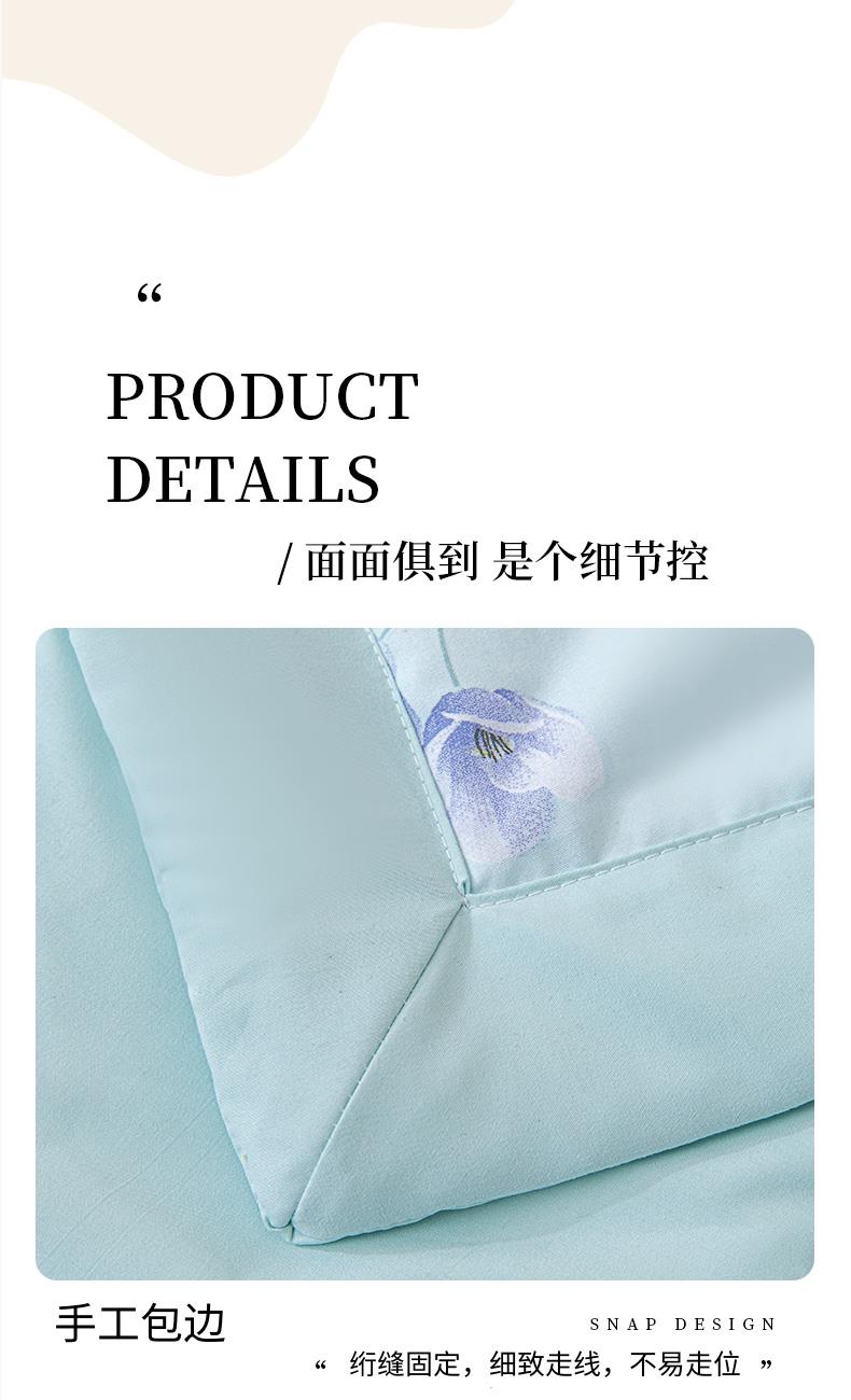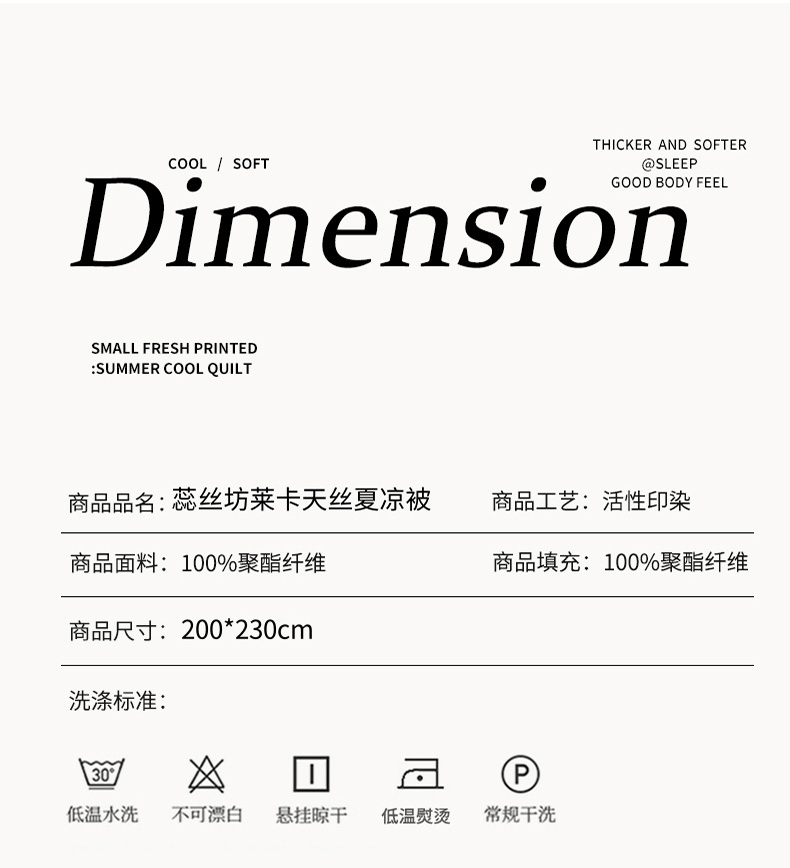 规 格: 200*230cm 花 型:花香丽人、淡雅幽香粉、淡雅幽香兰、花园兔-蓝、花园兔-粉 面 料: 莱卡天丝(聚酯纤维) 填充物:整张羽丝绒棉(聚酯纤维) 工 艺: 定位绗缝/手工包边 采用莱卡天丝面料制作,顺滑舒适清凉,入手冰冰凉凉, 整张羽丝绒棉填充,贴身使用,无需套被套,直接贴身使用,机洗手洗均可,活色印染,久洗如新。定位绗缝工艺,宽包边固定填充内芯不移位,洗后不结团,吸湿透气性好。