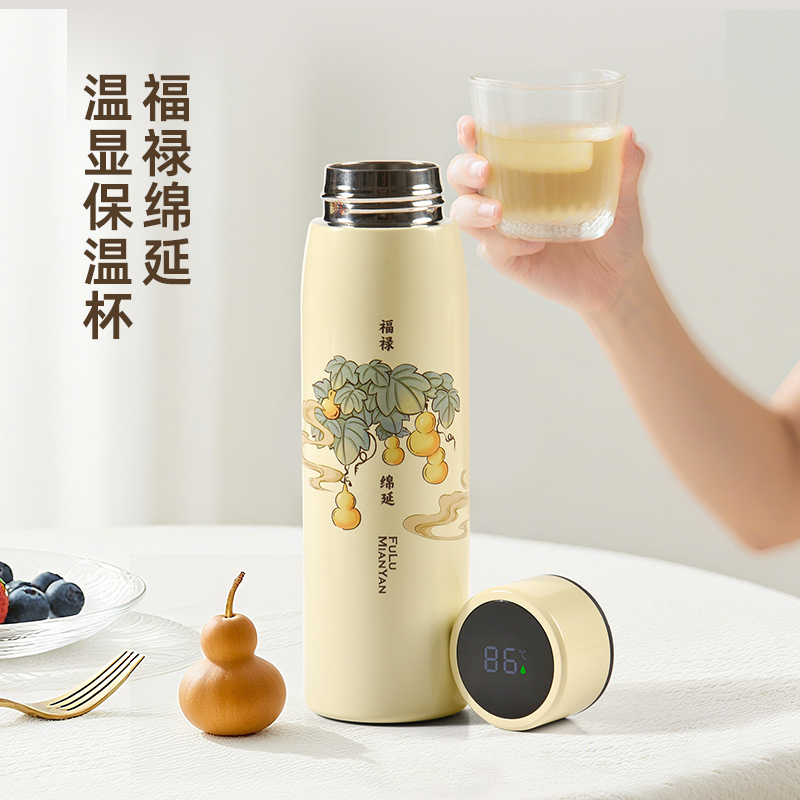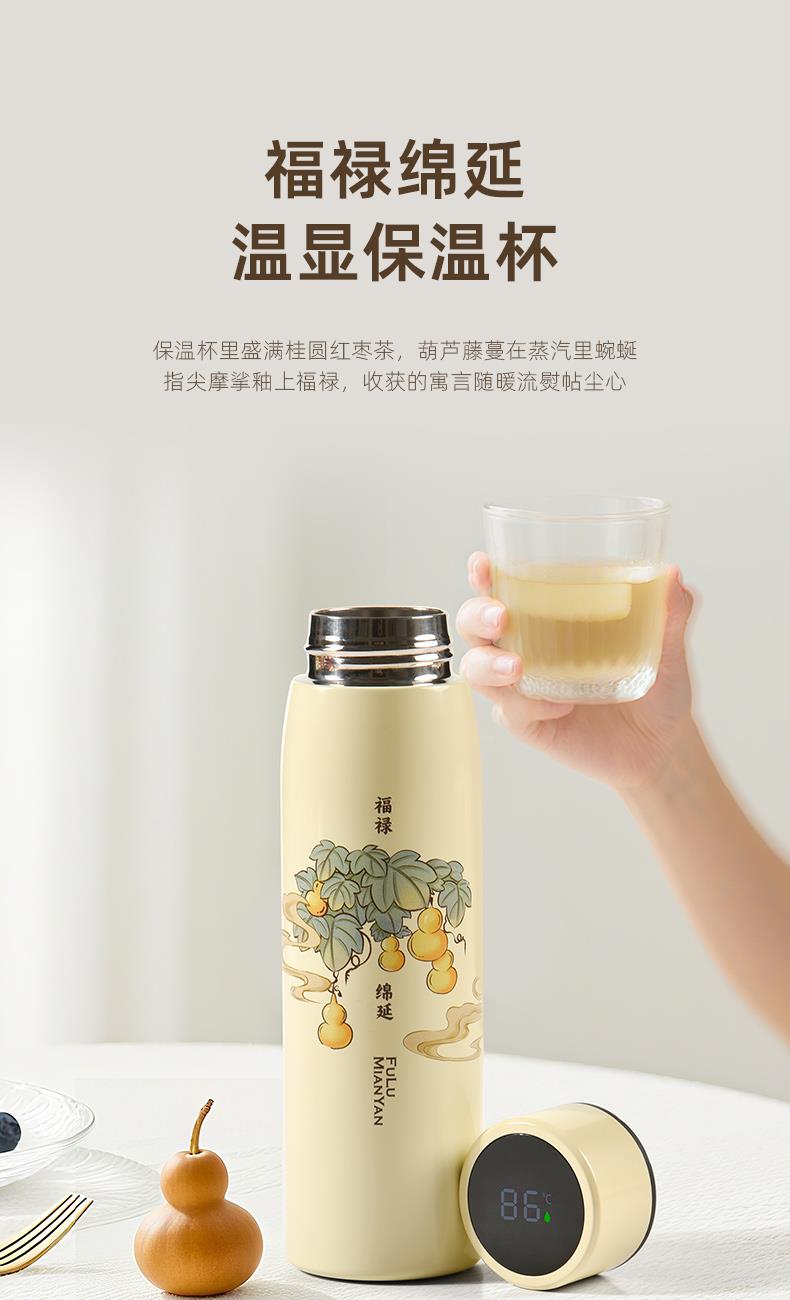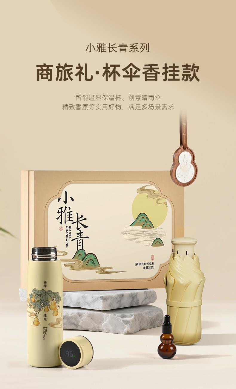 配置 · ① 福禄绵延·温显杯(450ml) ×1个 ② 小雅·晴雨伞×1个 ③ 葫芦·精油(10ml)×1个 ④ 葫芦·石膏香挂×1个 ⑤ 小雅·新中式礼盒手袋×1套