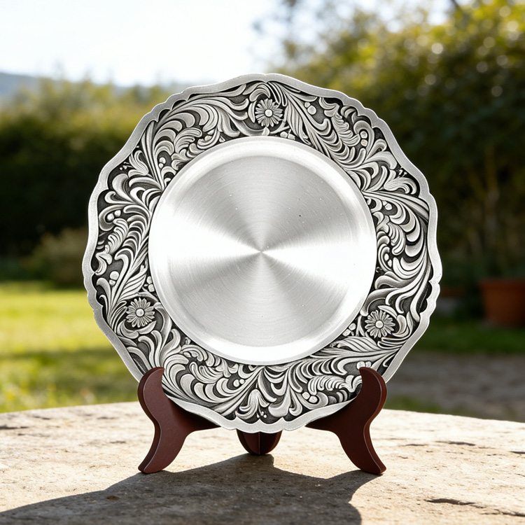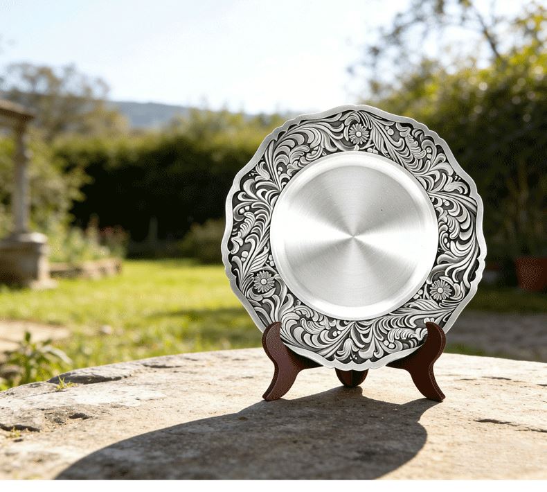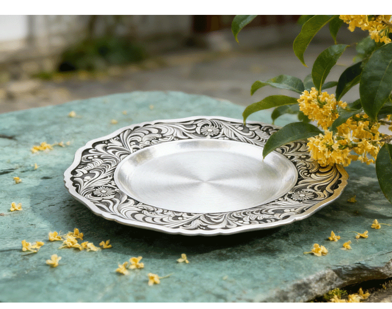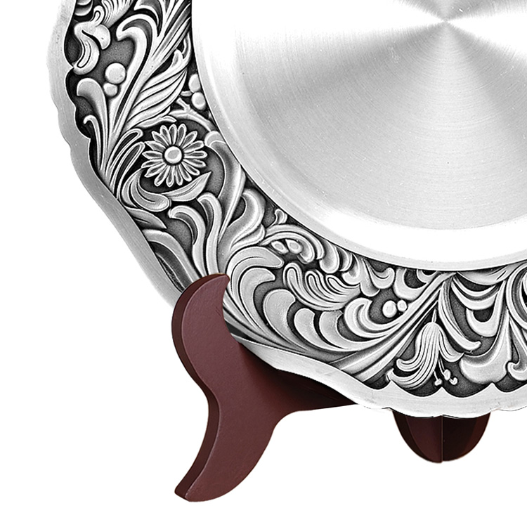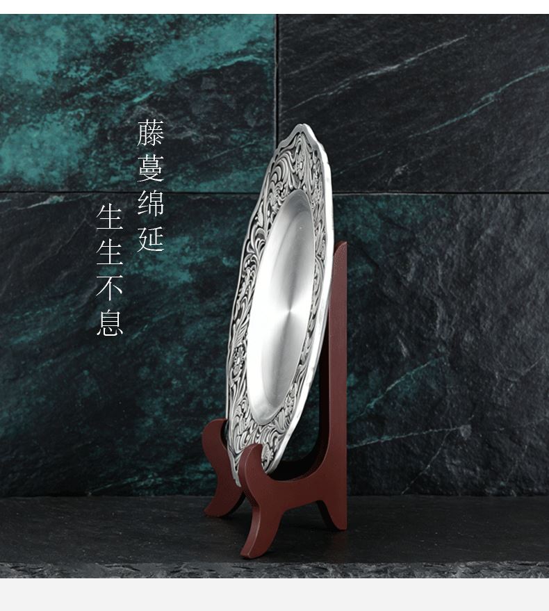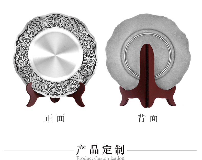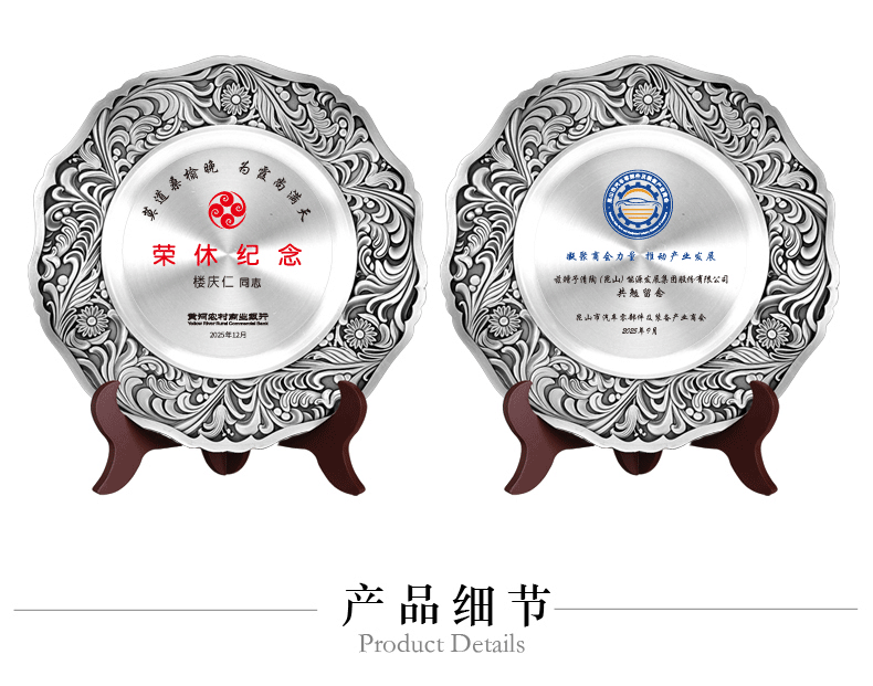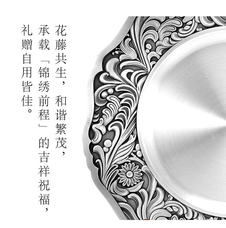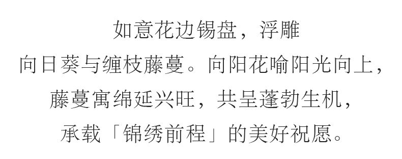 产 品:锦绣前程锡盘-中号 规 格:φ210*10mm-中号 重 量:602g左右-中号 ✅ 吉祥寓意,前程似锦:浮雕向日葵与缠枝藤蔓,向阳而生象征光明向上,藤蔓寓意基业长青,承载 “锦绣前程” 美好祝愿,礼赠满含心意。 ✅ 匠心浮雕,质感温润:手工精雕细腻立体,哑光锡面温润厚重,尽显东方工艺之美,摆放大气有格调。 ✅ 专属定制,心意专属:盘面中心可定制 LOGO、题词、落款,打造独特的专属纪念,商务礼赠更显诚意。 ✅ 礼盒配套,体面呈现:搭配专属礼盒包装,开箱仪式感拉满,自用收藏、商务赠礼、团体留念皆体面有档次。