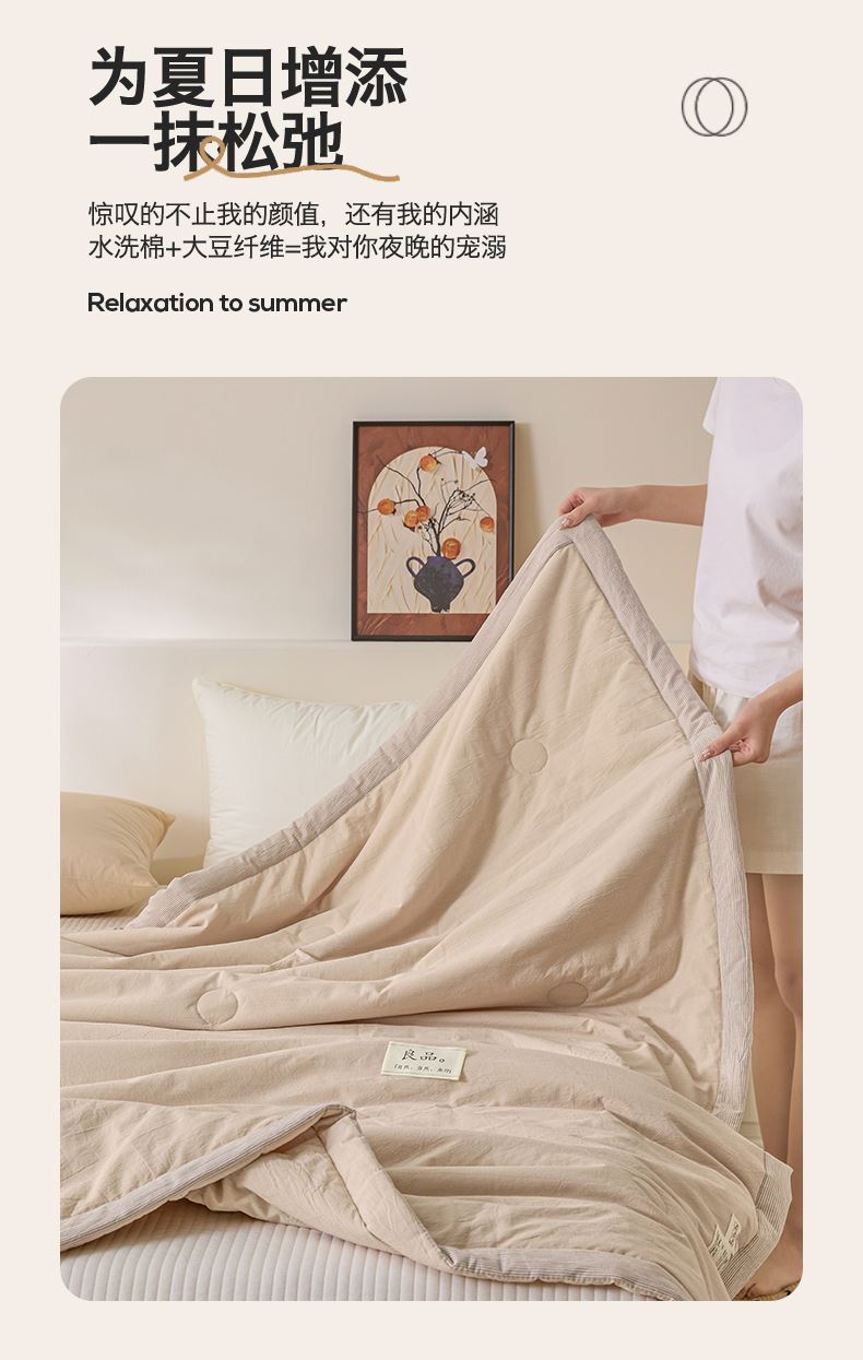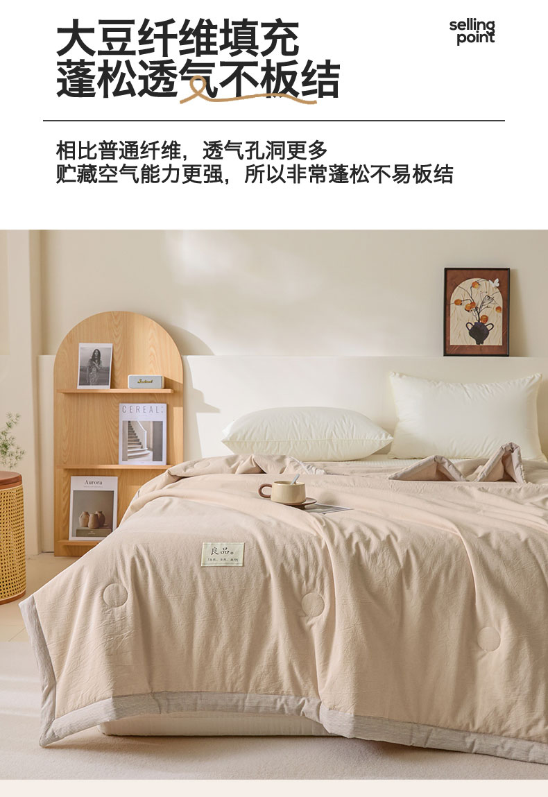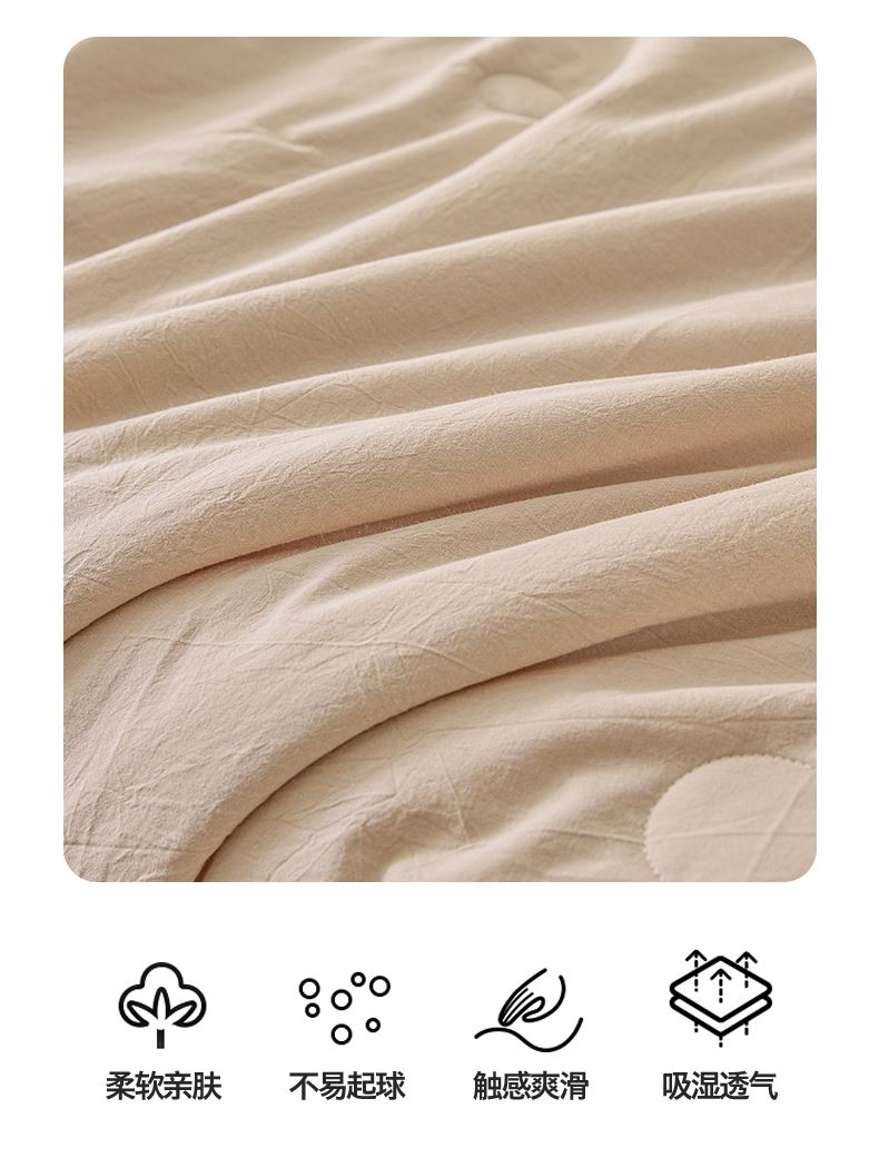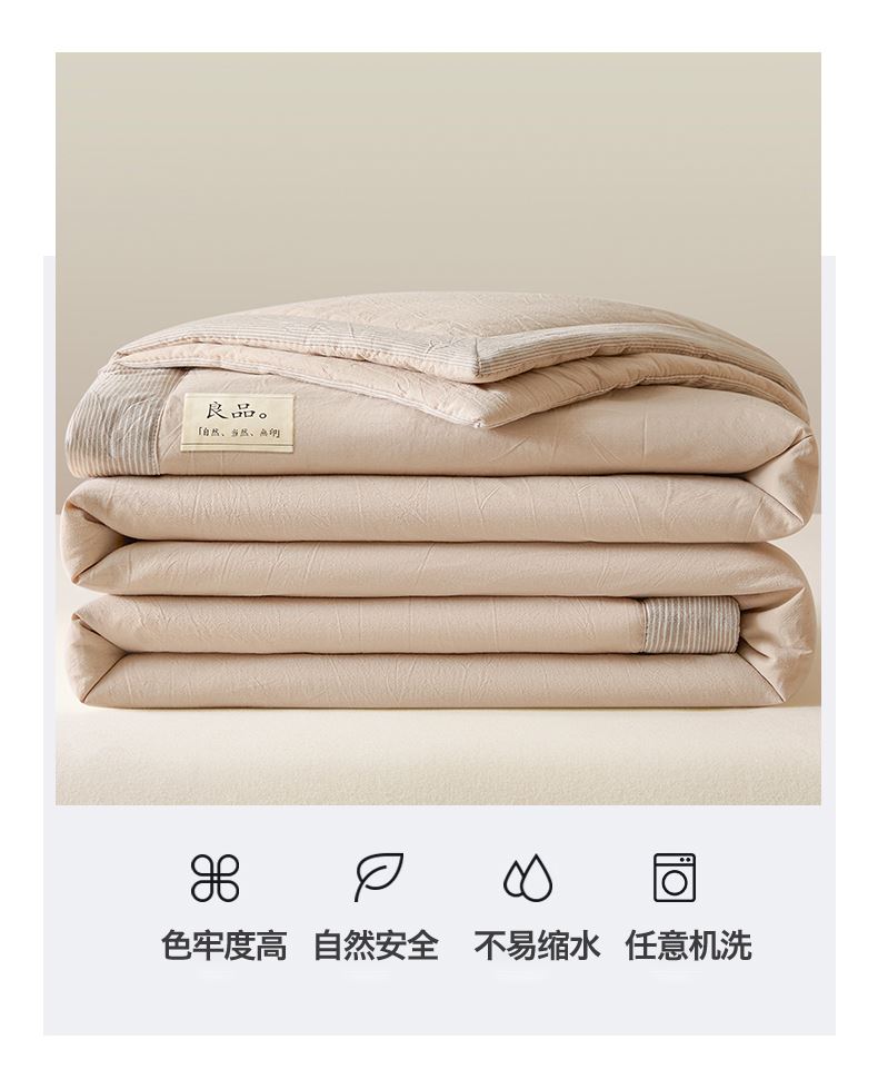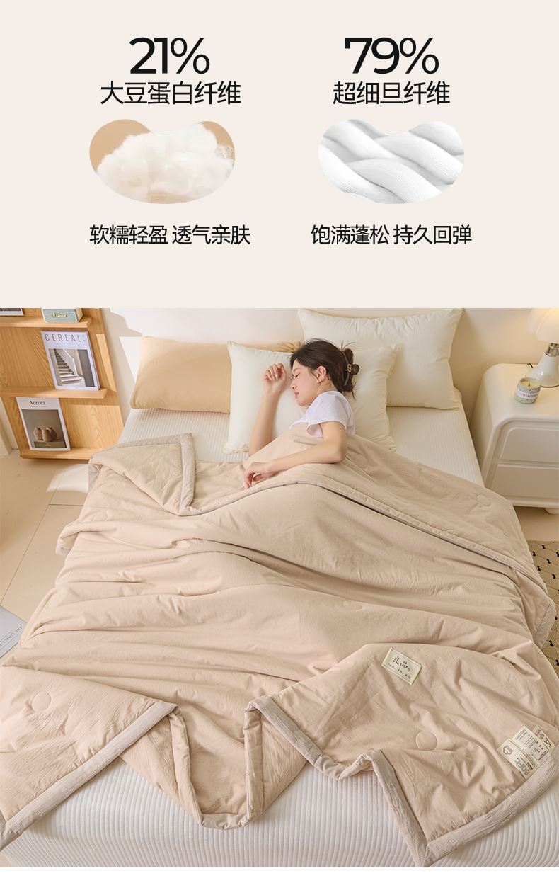 面料:水洗柔肤面料(聚酯纤维) 填充:21%大豆改性纤维+79%聚酯纤维 规格:200cm*230cm 包装:精美软包 无印风亲肤水洗棉裸肤触感,满足肌肤的柔顺触感清爽透气耐磨不伤肤四季皆可用享受舒适睡眠健康舒适纤维,大豆蛋白加工制成媲美羊绒的柔软触感,棉的保暖性,绵软不易结团。