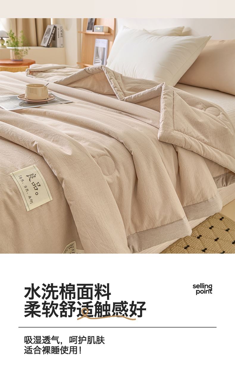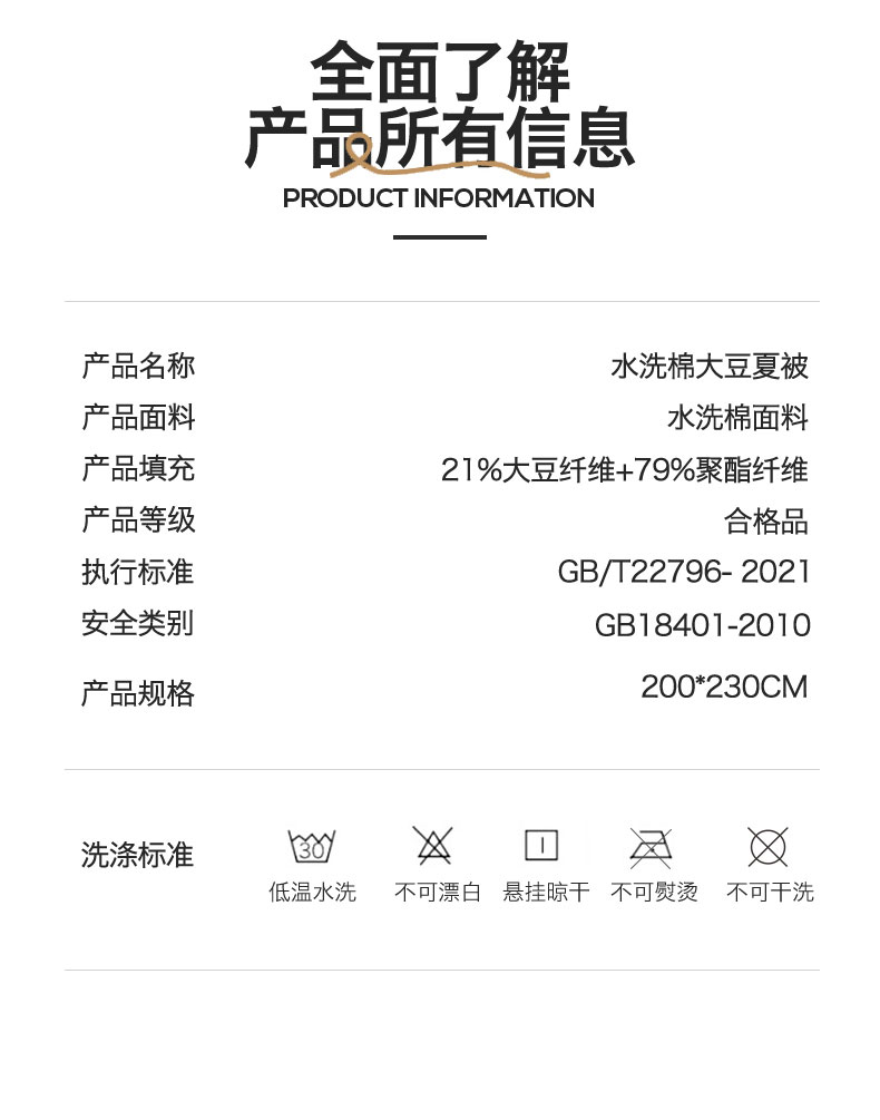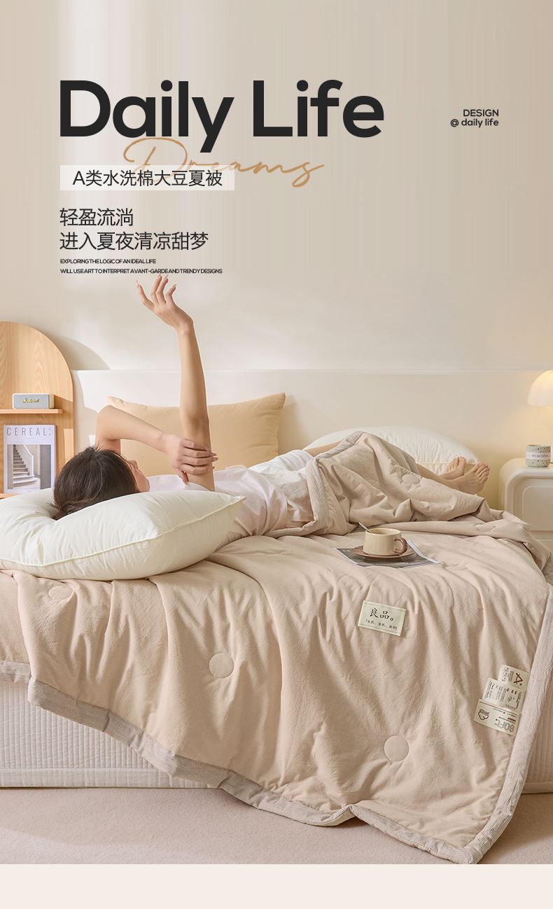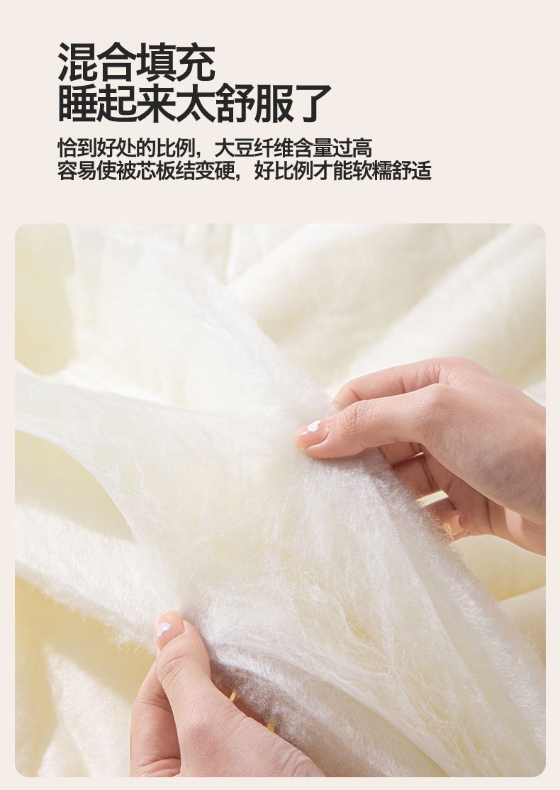 面料:水洗柔肤面料(聚酯纤维) 填充:21%大豆改性纤维+79%聚酯纤维 规格:200cm*230cm 包装:精美软包 无印风亲肤水洗棉裸肤触感,满足肌肤的柔顺触感清爽透气耐磨不伤肤四季皆可用享受舒适睡眠健康舒适纤维,大豆蛋白加工制成媲美羊绒的柔软触感,棉的保暖性,绵软不易结团。