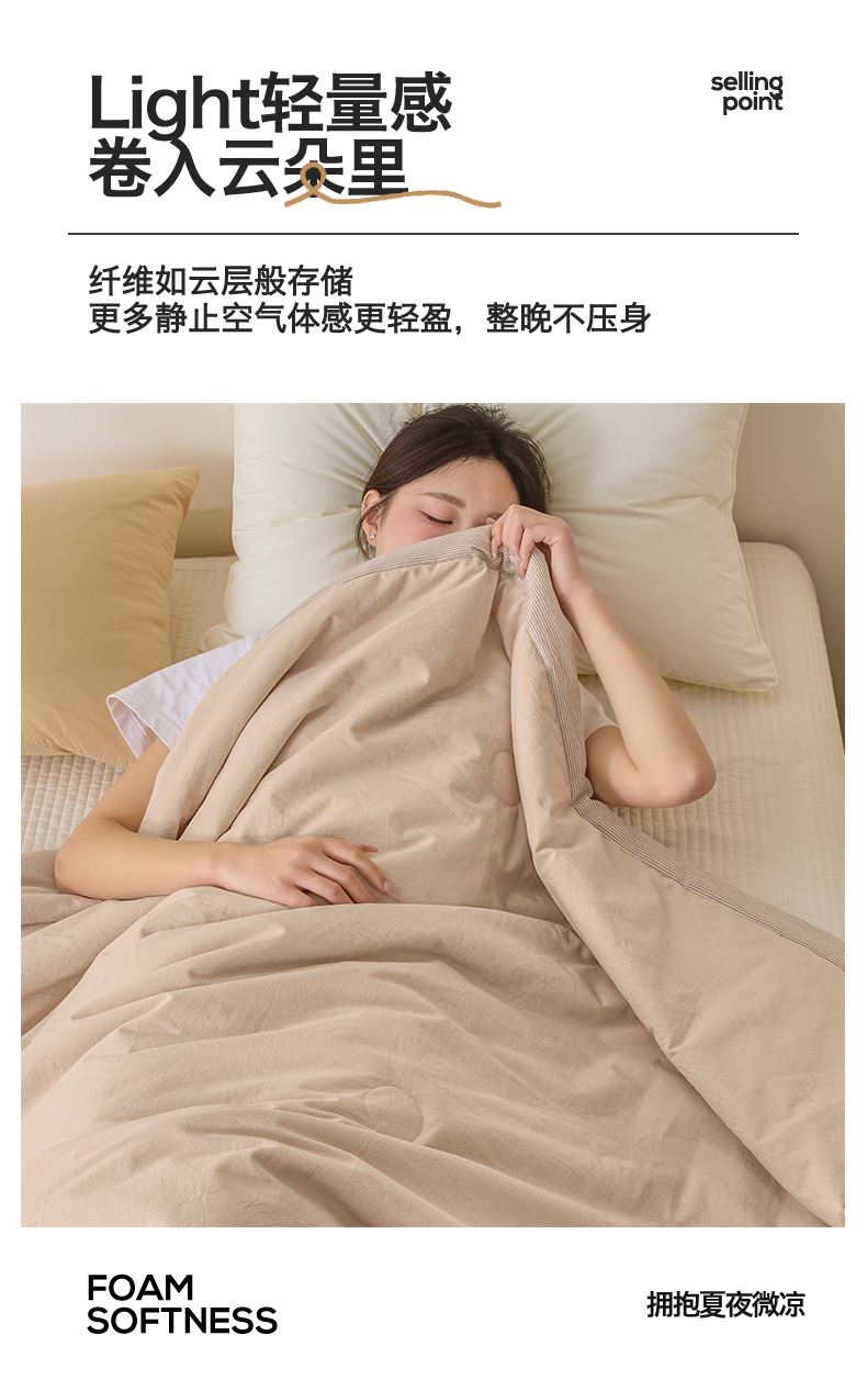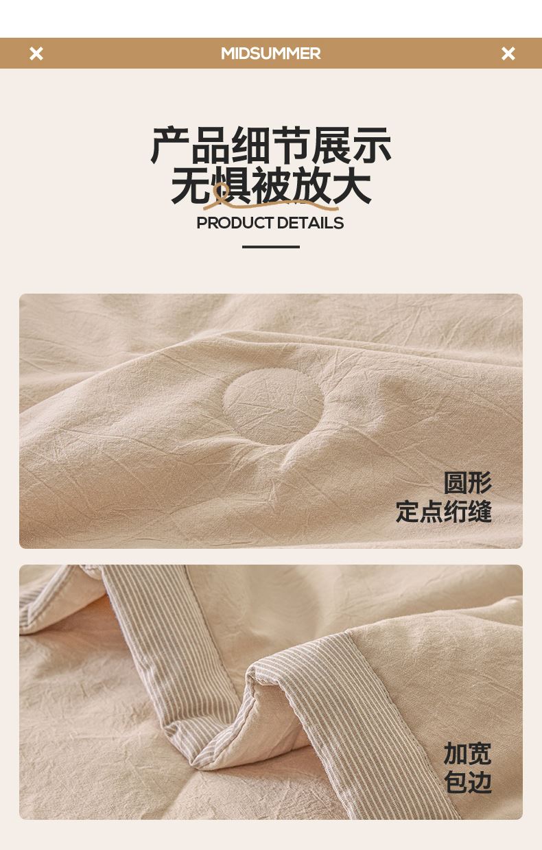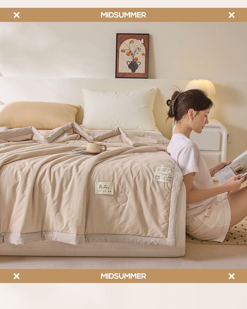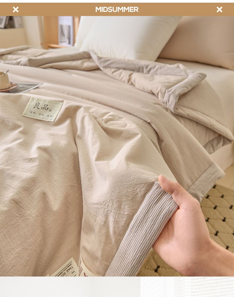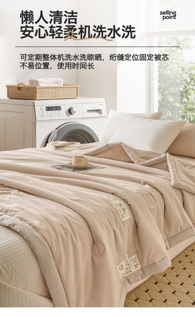 面料:水洗柔肤面料(聚酯纤维) 填充:21%大豆改性纤维+79%聚酯纤维 规格:200cm*230cm 包装:精美软包 无印风亲肤水洗棉裸肤触感,满足肌肤的柔顺触感清爽透气耐磨不伤肤四季皆可用享受舒适睡眠健康舒适纤维,大豆蛋白加工制成媲美羊绒的柔软触感,棉的保暖性,绵软不易结团。