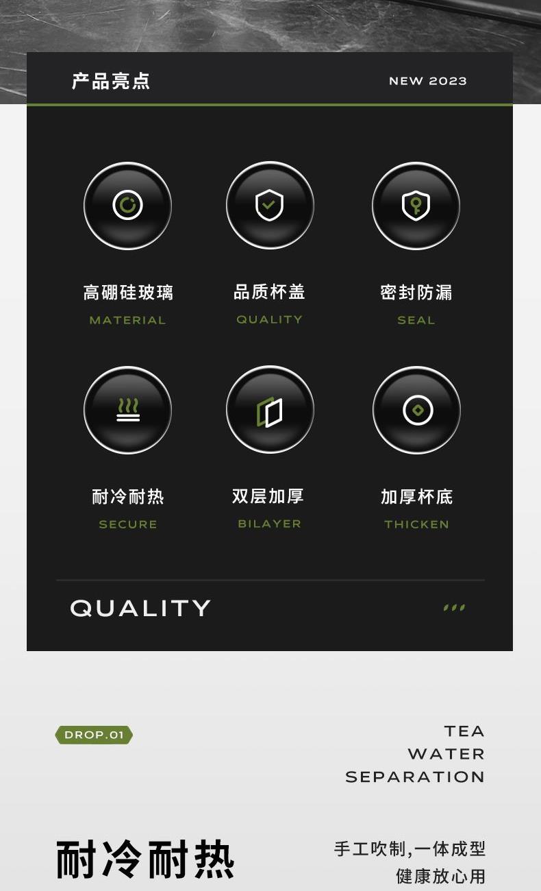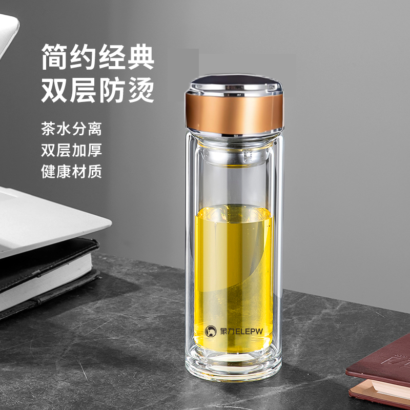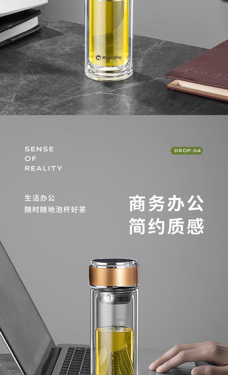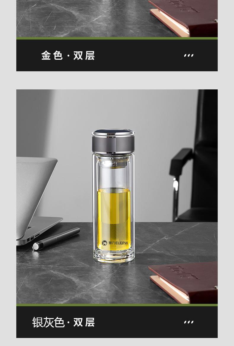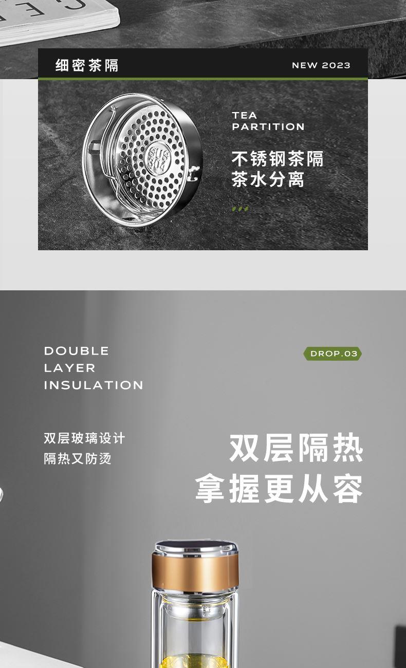 容量:320ml 颜色:金色 灰色 蓝色 材质: 304不锈钢提篮滤网,喝茶不吐叶。 不锈钢杯盖,商务外观,更适合定制。 双层高透亮高硼硅玻璃材质,耐急速瞬间温差。 杯体一体成型,手工加厚烧制,稳重耐用。 包装:单瓦盒