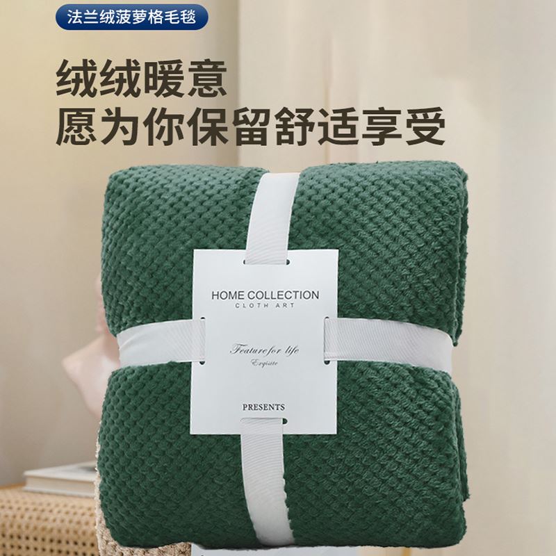 法兰绒菠萝格午睡毯:220克D丝法兰绒,100*150cm重420g,表面覆盖了超柔软的法兰绒绒毛,编织紧密,手感柔顺机洗不掉毛,采用活性印染工艺,更亲肤贴身,卷边工艺,有效固定毛毯边缘,细节满满