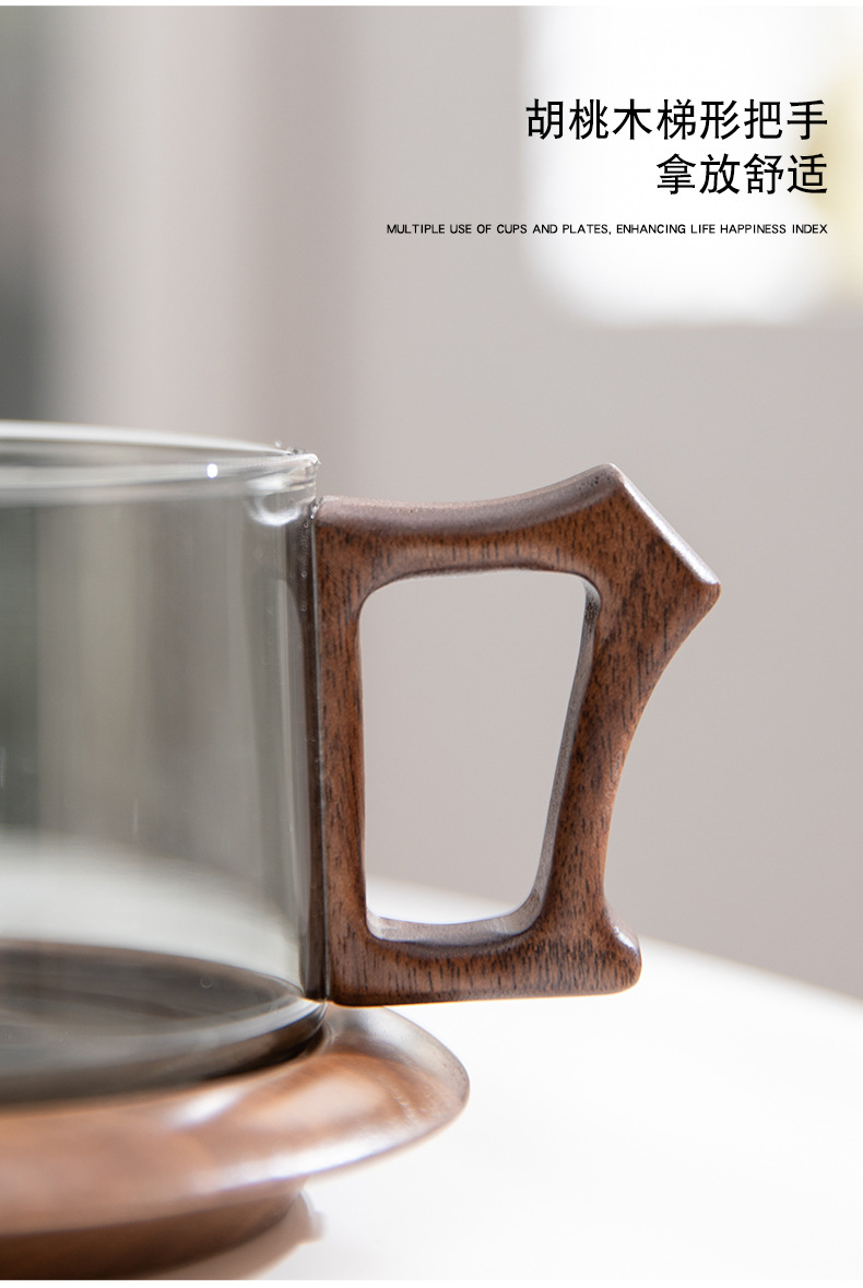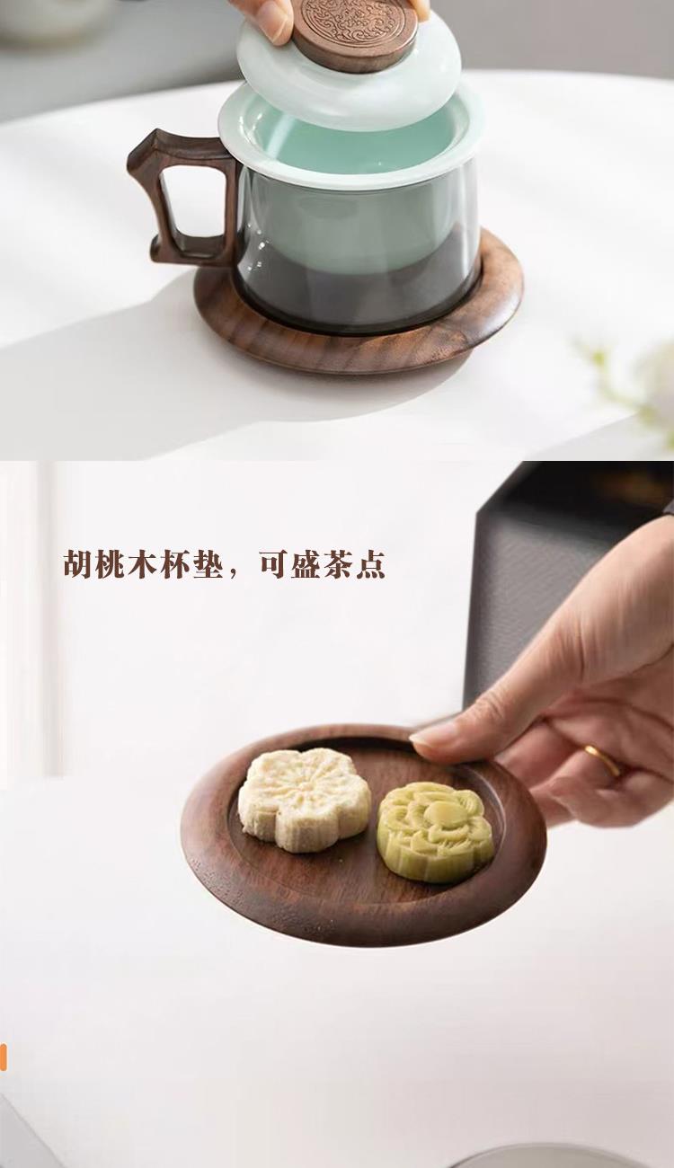 配 制: 1杯 1盖 1茶漏 1木碟 1木勺 1礼盒手提袋 材质:羊脂玉瓷、胡桃木、 高硼硅玻璃 容量:300ml 推荐说明:两用办公杯,既可泡茶、又可做咖啡杯。采用上等天青汝瓷,胡桃木雕刻祥云纹理木盖与杯把、底碟、木勺,底碟中间卡槽设计,防止杯子晃动。食品级高硼硅玻璃,尊享品质。