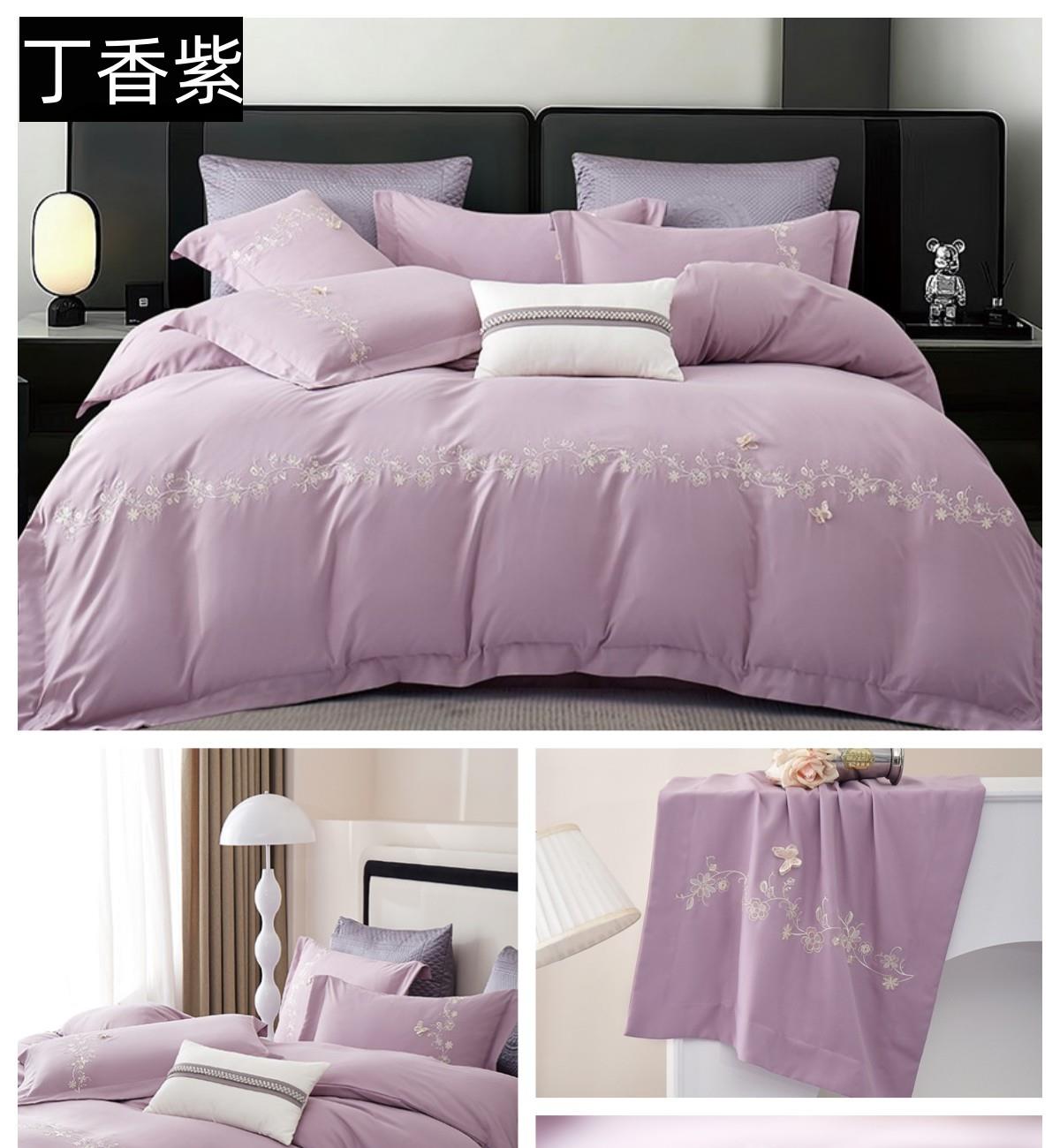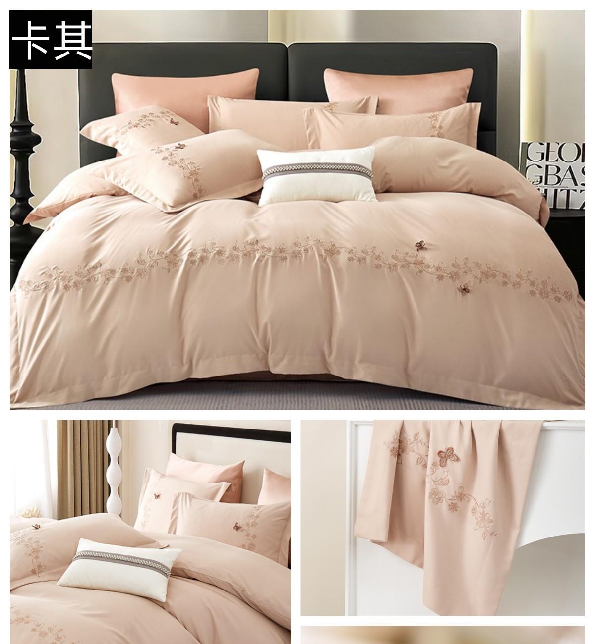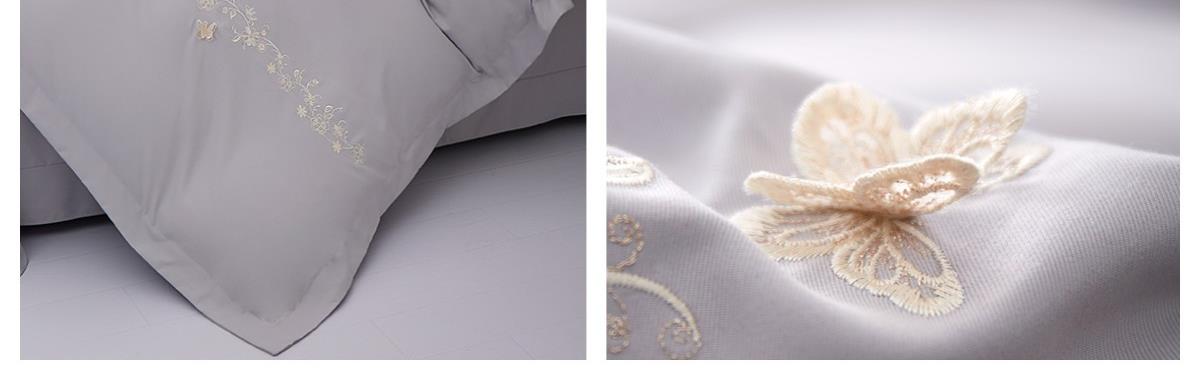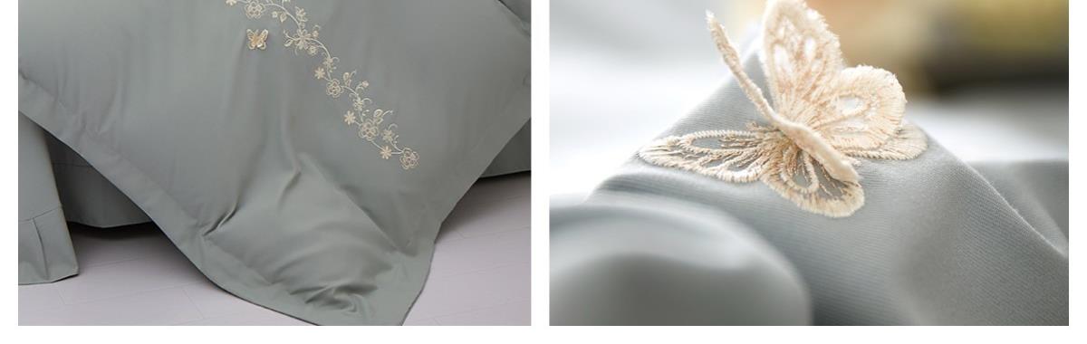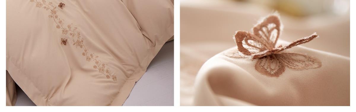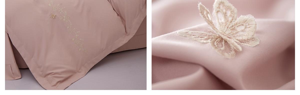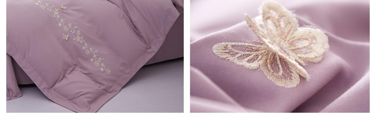 规格:床单250*270*1 被套200*230*1 枕套48*74*2 适用于1.5米/1.8米床 面料:双面加厚羊绒棉(聚酯纤维) 工艺:高精密刺绣 立体蝴蝶、枕套定位、整烫 花色:丁香紫/都市灰/海棠粉/卡其/梅子青/天空蓝 甄选双面羊绒面料,细腻柔软贴近肌肤,具有良好的透气吸湿性,裹上就有不想离开的依赖感。简约精美绣花设计,追求优雅品质,将浪漫尽数收藏。生活中我们要善于做减法,蝶影翩跹,浪漫风情。飞舞的蝴蝶与浪漫融合,仿佛置身于花海之中,与蝶共舞。