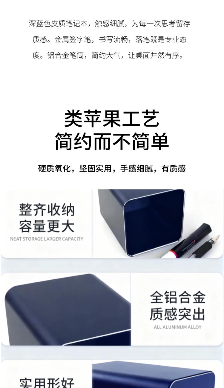 该套装源自“笔墨纵横,自成山河”,寓意方寸笔记本之上,可规划宏图,可描绘未来。【笔记本】是思想的土壤,承载所有奇思妙想;【笔】是行动的延伸,将创意化为现实;【笔筒】则是秩序的基石,让工具各安其位。这套桌面组合,不仅是学习与工作的必需品,更是培养专注、见证您从规划到成就每一步的沉默伙伴。让一切灵感,从此井然有序。