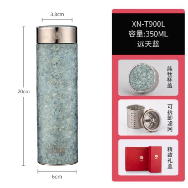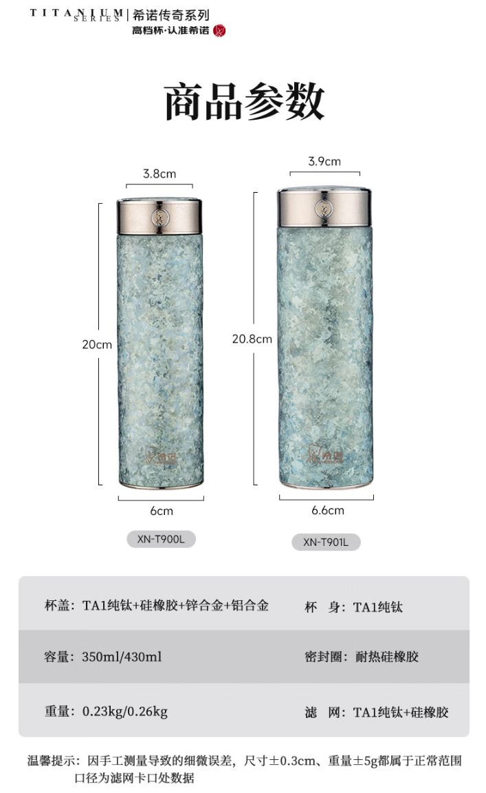 产品规格: 材质: 杯体-纯 钛/杯盖-食品级PP、纯钛TA1、食品级硅胶 规格(mm) XN-T901L:39(杯口直径)x66(直径)x208.3(高度) 颜色: XN-T901L:云海雾凇,纯净冰川,远天蓝,紫罗兰 容量: XN-T901L:430ml 保温效能: XN-T901L:6小时≥55℃