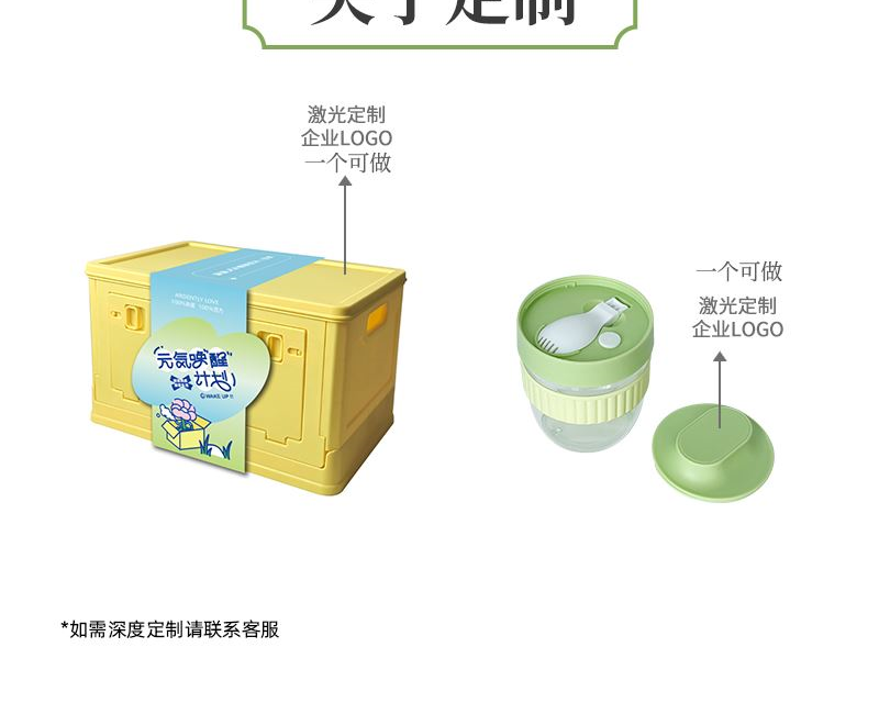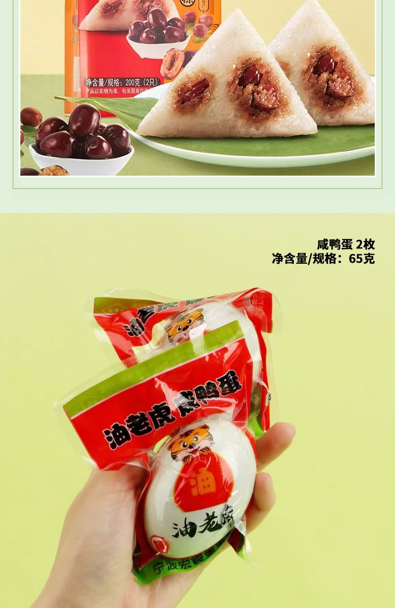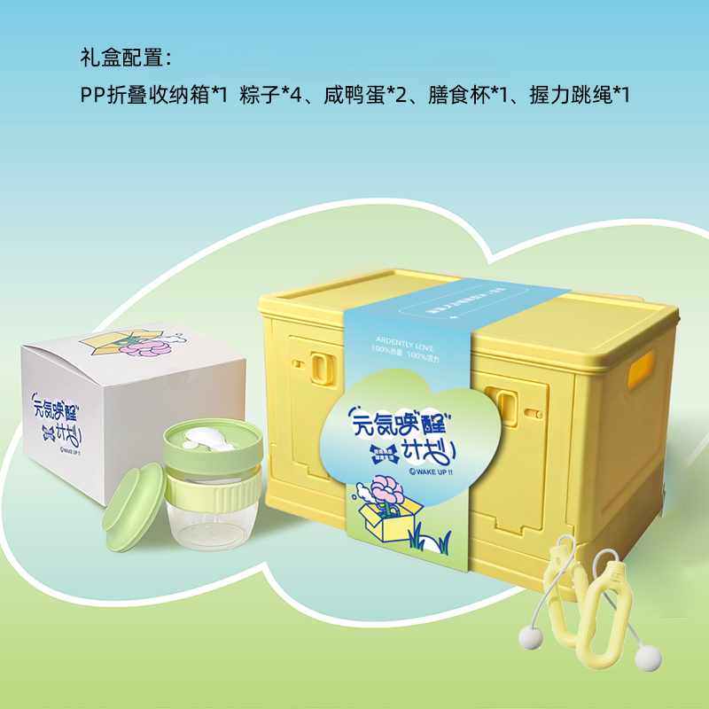 礼盒参数: 礼盒尺寸:23.5*21.5*36cm 套装重量:2190g/套 外箱尺寸:73.1*47.5*44cm 详细介绍: 1. WOW 握力跳绳 握力圈+无绳跳绳 二合一功能 360°万向轴承转动更丝滑 (颜色随机) 2. 膳食杯 容量:480ml 尺寸:12.3*直径9.8cm 材料:PP、PC、硅胶 黄/绿颜色(随机) 3. 咸鸭蛋 数量:2枚 产地:浙江宁波 4.粽子4枚 ◆ 100克鲜肉粽 2个/袋 ◆ 100克红枣粽 2个/袋