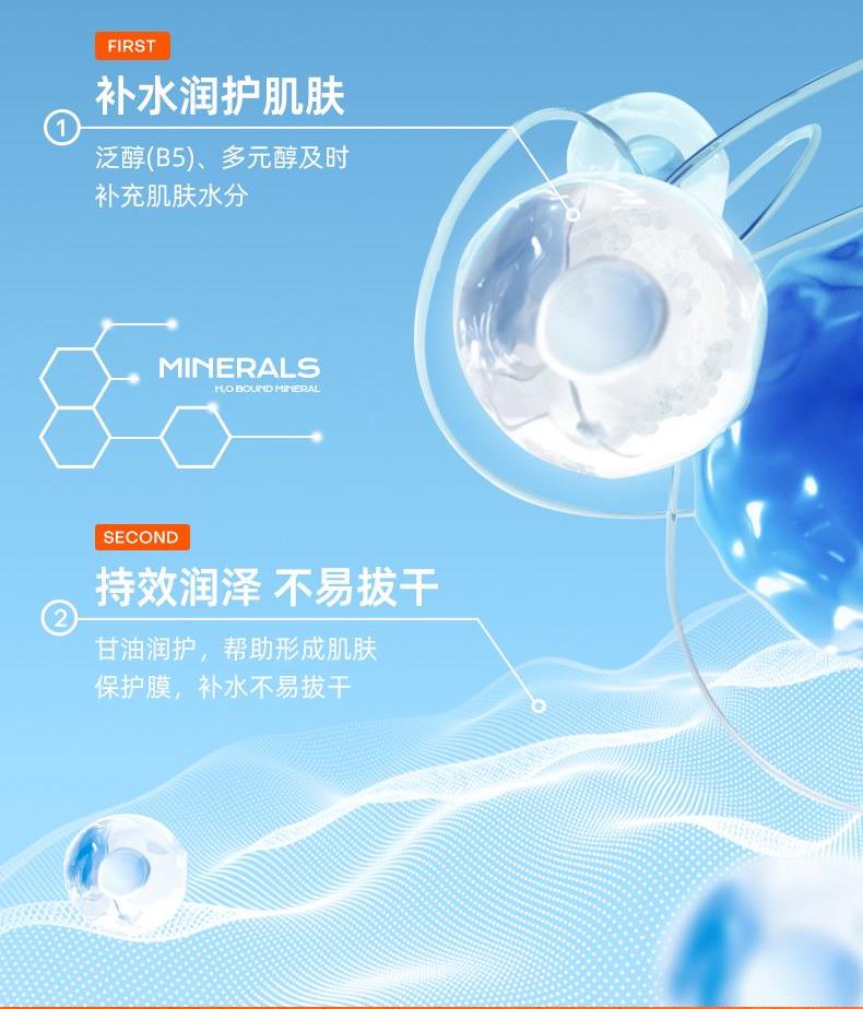 高效补水因子——泛醇+多元醇,瞬时保湿锁水;长效锁水因子——天然甘油,长效水润深润滋养肌肤,去除干纹。8H长效保湿,深润滋养,一瓶=防晒霜+身体乳。
