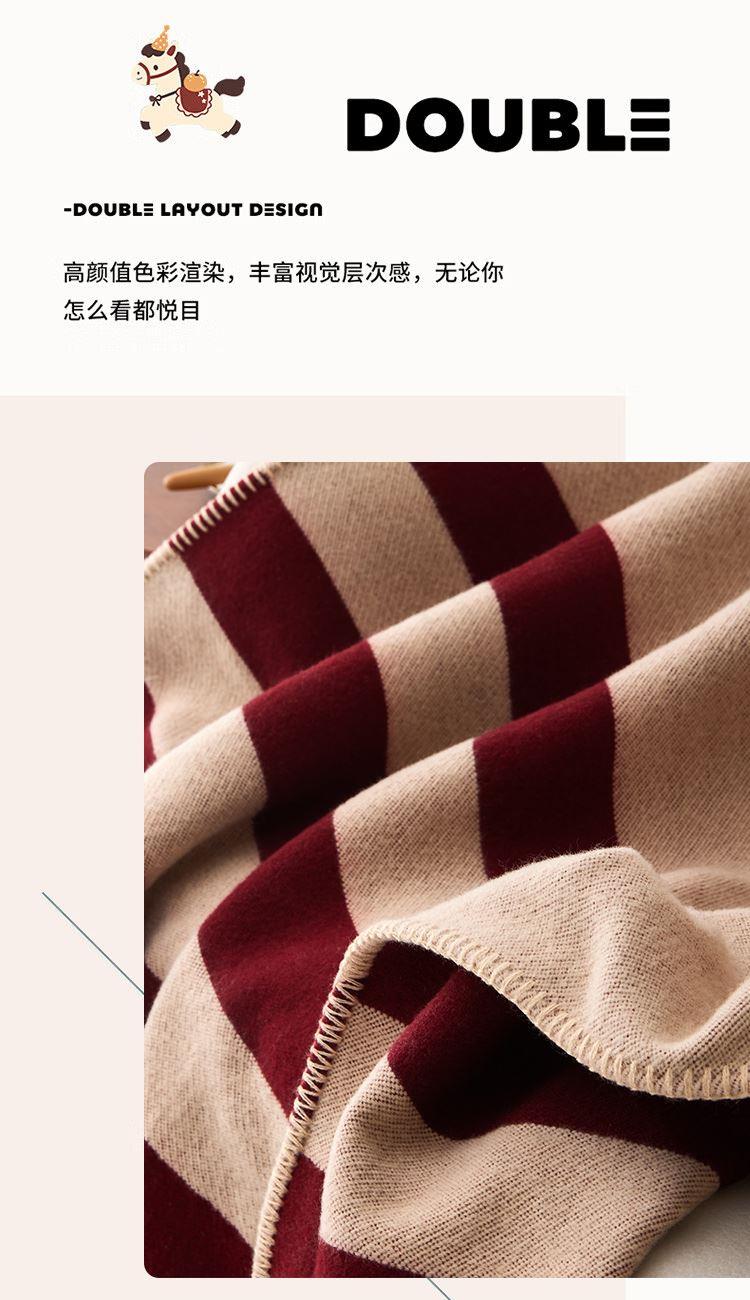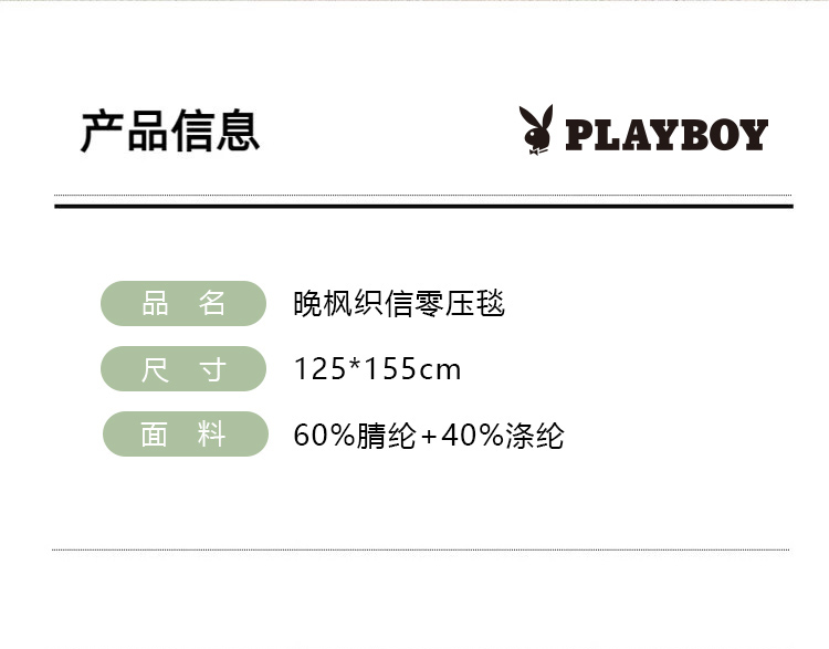格:125*155cm 面料:60%腈纶40%涤纶 重量:900g 执行标准:FZ/T36106-2019 安全类别:GB31602-2019B类 .1.采用60%腈纶40%涤纶面料,具有良好的排湿透气性,绒毛纤长,手感柔软细腻,保暖性好,光泽度高; 2.时尚简约设计,优雅而不失大气,细节感满满。精致的包边工艺,做工精细,针脚细密,不易脱线,牢固耐用。