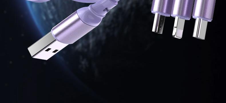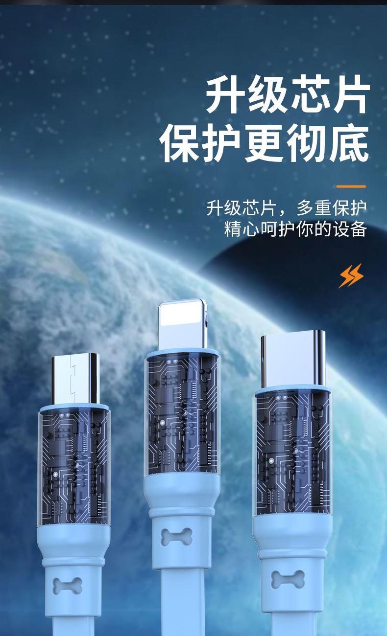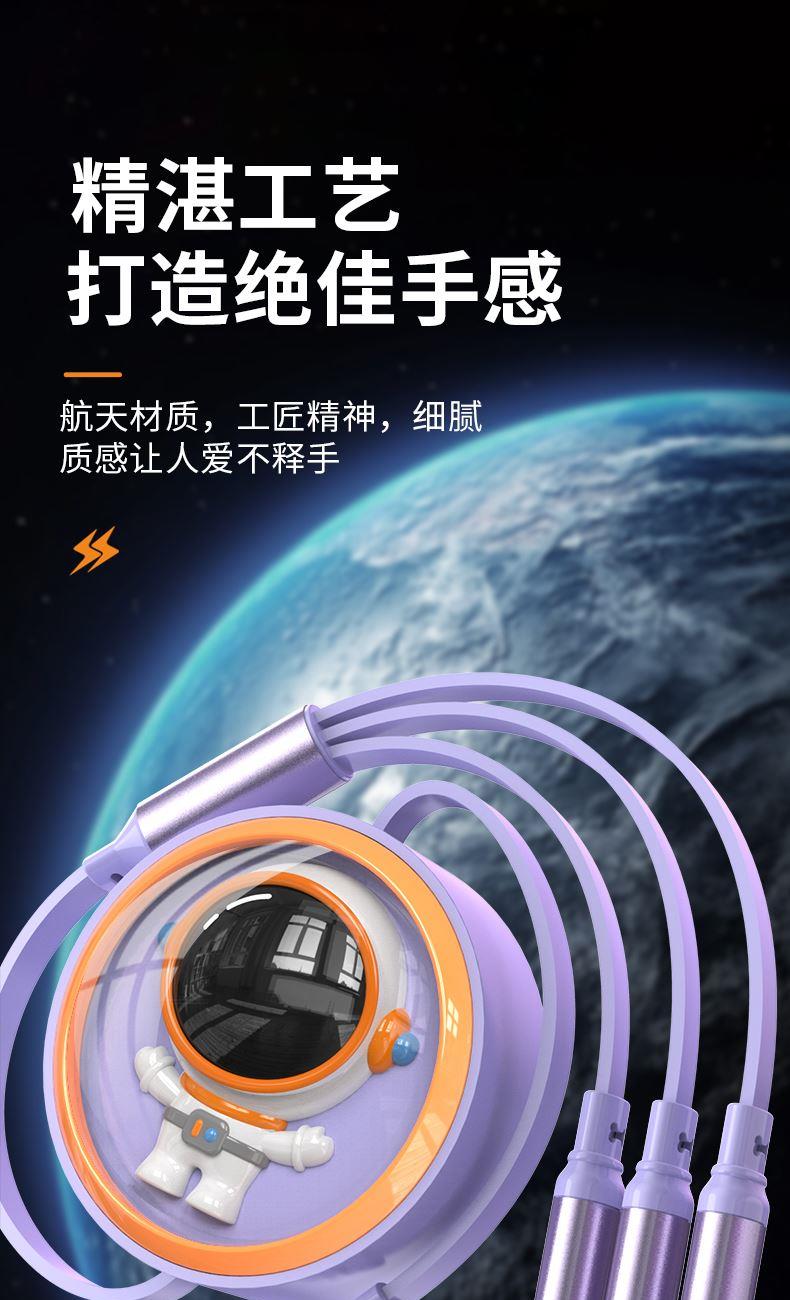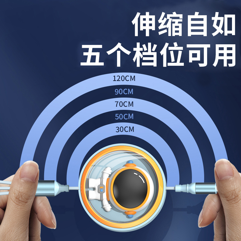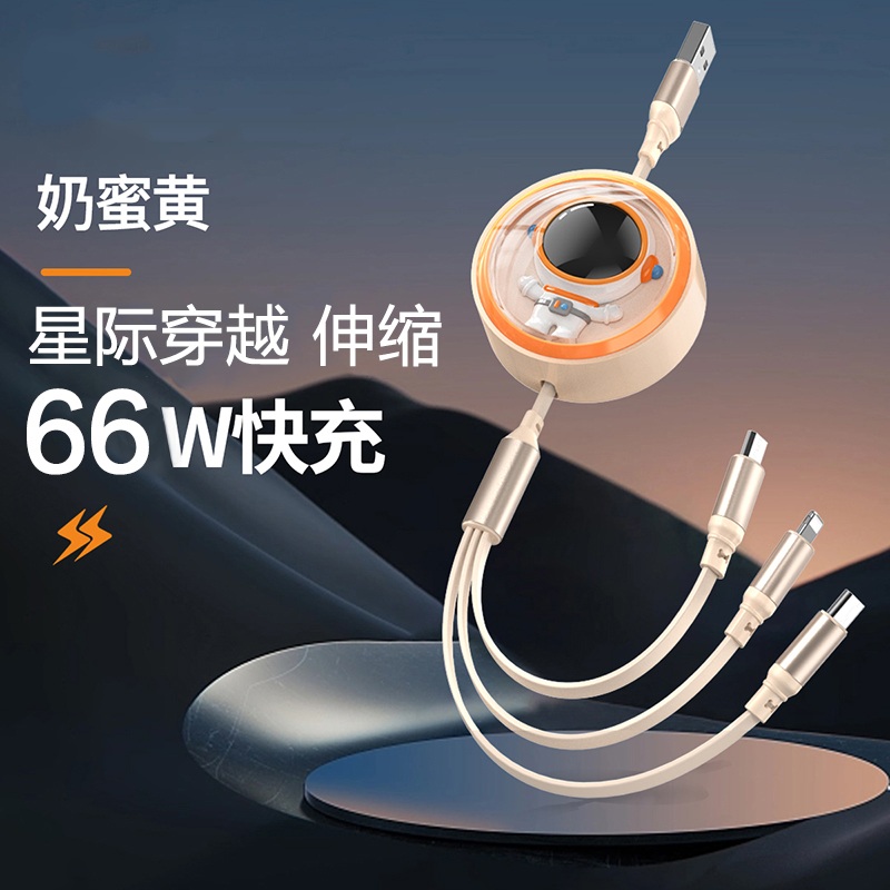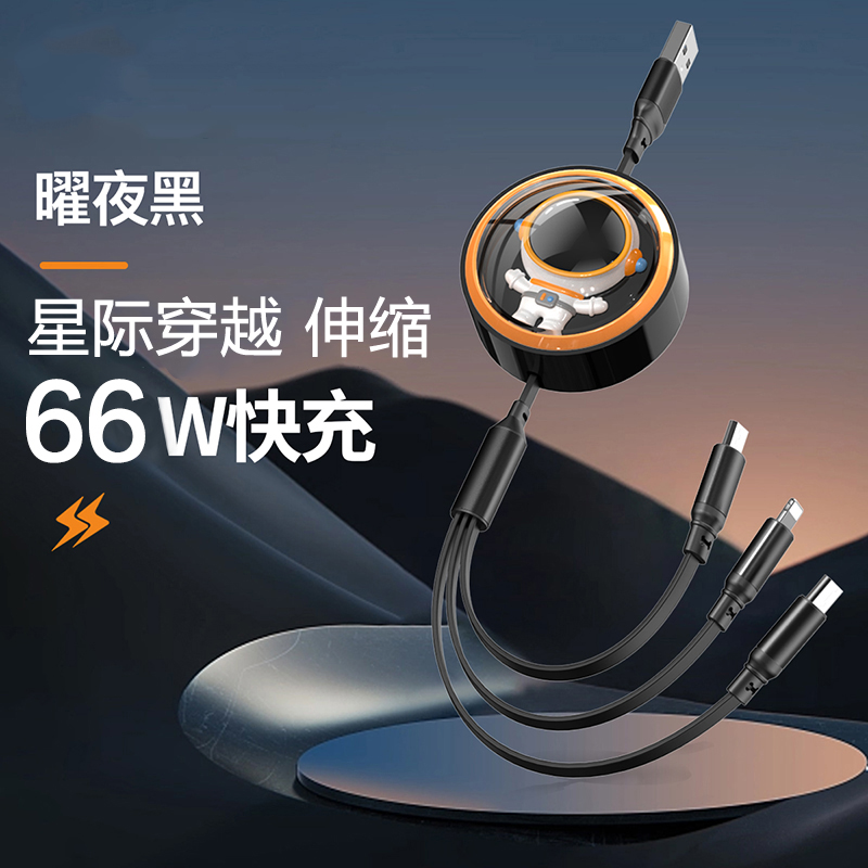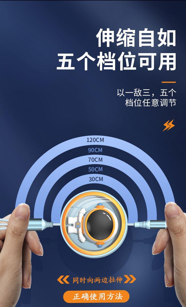 S11星际穿越66W快充伸缩数据线 颜色:米色 黑色 紫色 红色 材质:TPE材质 尺寸:1.2M 包装:彩盒包装 功能特点】: 太空人公仔造型,66W超级快充 三种接口满足各种手机 1.2米长度设计,使用方便 TPE材质耐用,不易折断 五档伸缩调节