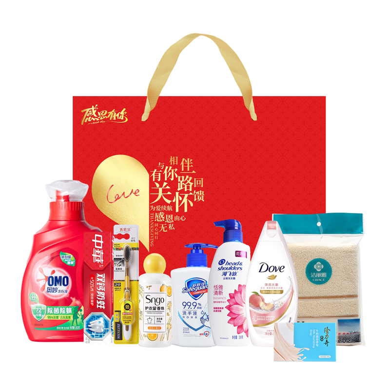 礼盒尺寸:32*8.5*24.5cm 包装尺寸:66*46.5*51CM 产品配置:(香型随机) 海飞丝洗发水300ml 多芬沐浴露300ml 舒肤佳洗手液225ml 奥妙洗衣液950g SHG0留香珠220g 洁丽雅毛巾69*33cm 中华牙膏50g 优思洁牙刷 隆力奇香皂95g