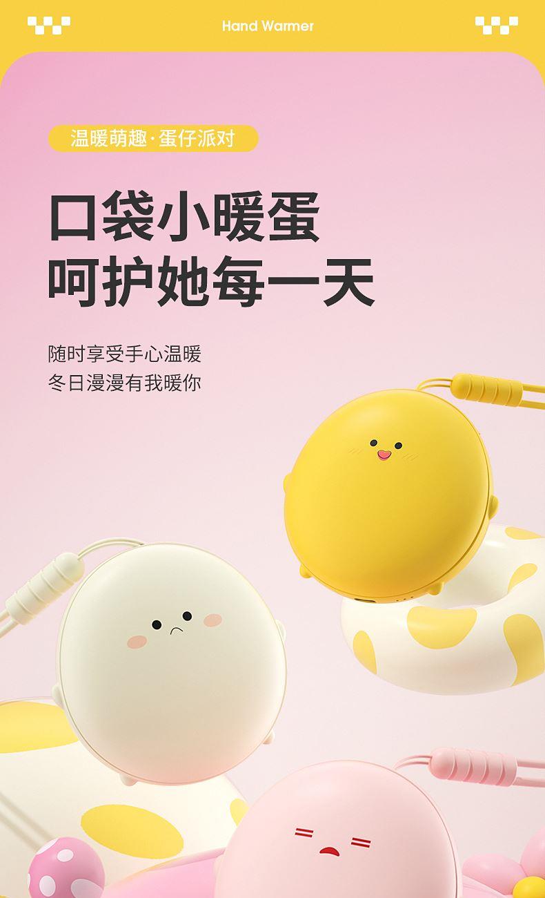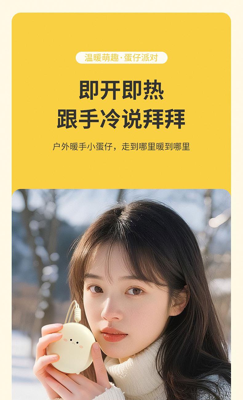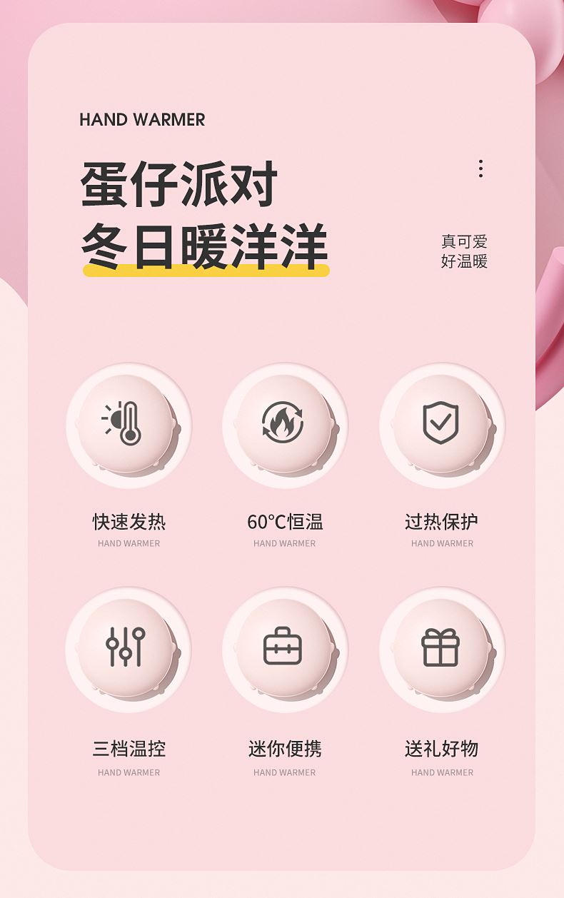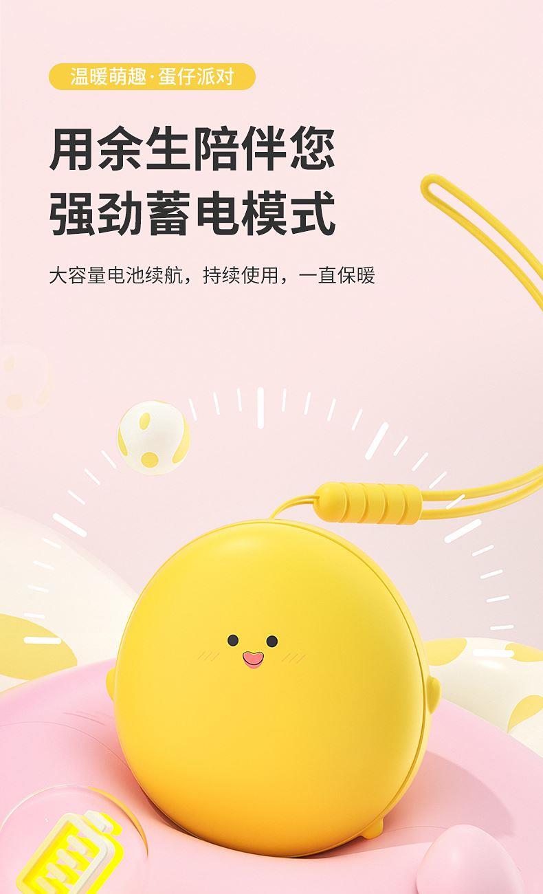蛋仔萌宠,暖心暖手 3600毫安实标容量 60°双面发热,360°温暖 三档温控调节,一键速热 强劲蓄电,持久温暖