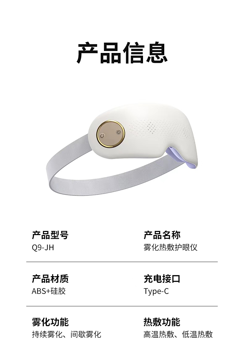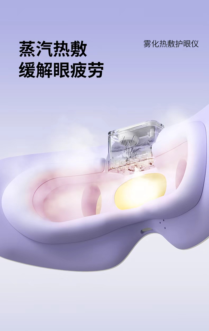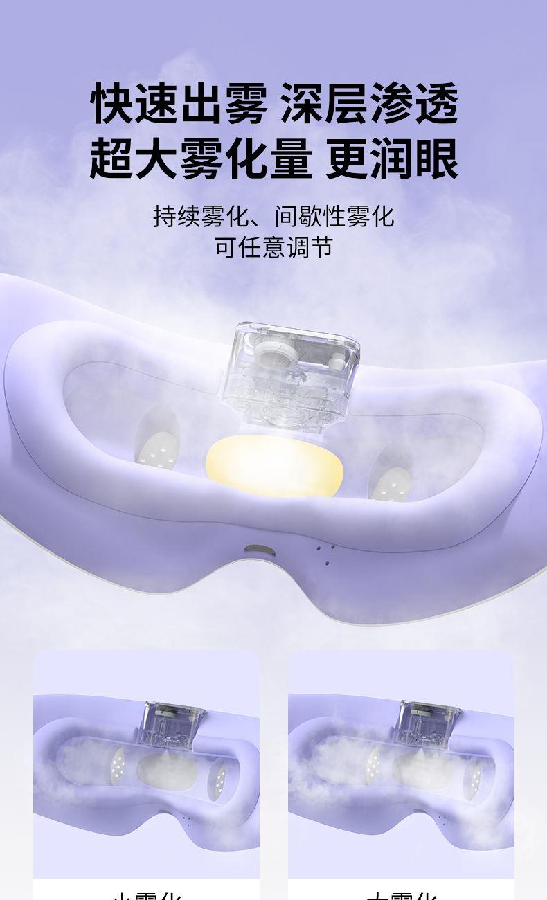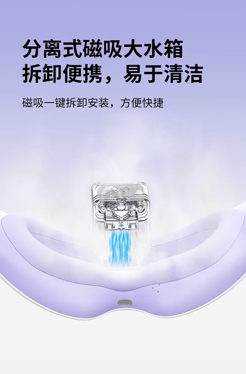 产品材质:ABS+硅胶 雾化功能:持续雾化、间歇雾化 充电接口:Type-C 热敷功能:高温热敷、低温热敷 ✅ 分离式磁吸大水箱,可拆卸易清洗 磁吸快拆设计,加水、清洁超方便,不藏水垢不闷菌,润眼更卫生。 👀 可视化设计,边按摩边用眼 不挡视线,办公、看书、刷手机都能用,解放双眼,放松工作两不误。 ☁️ 热敷 + 雾化双效润眼,疲惫一扫空 温热蒸汽深层渗透,快速缓解眼干、眼涩、酸胀,给眼睛做沉浸式 SPA。