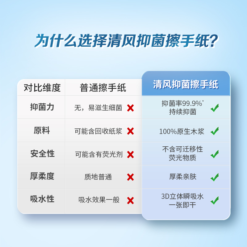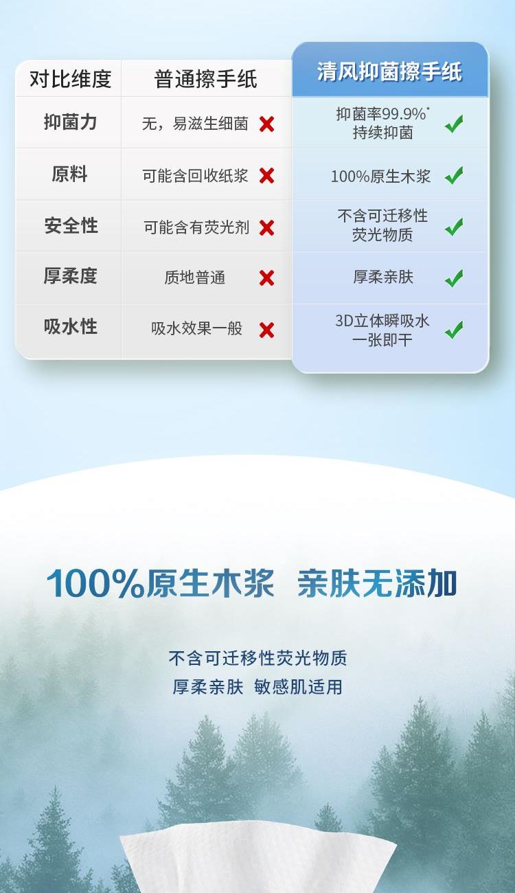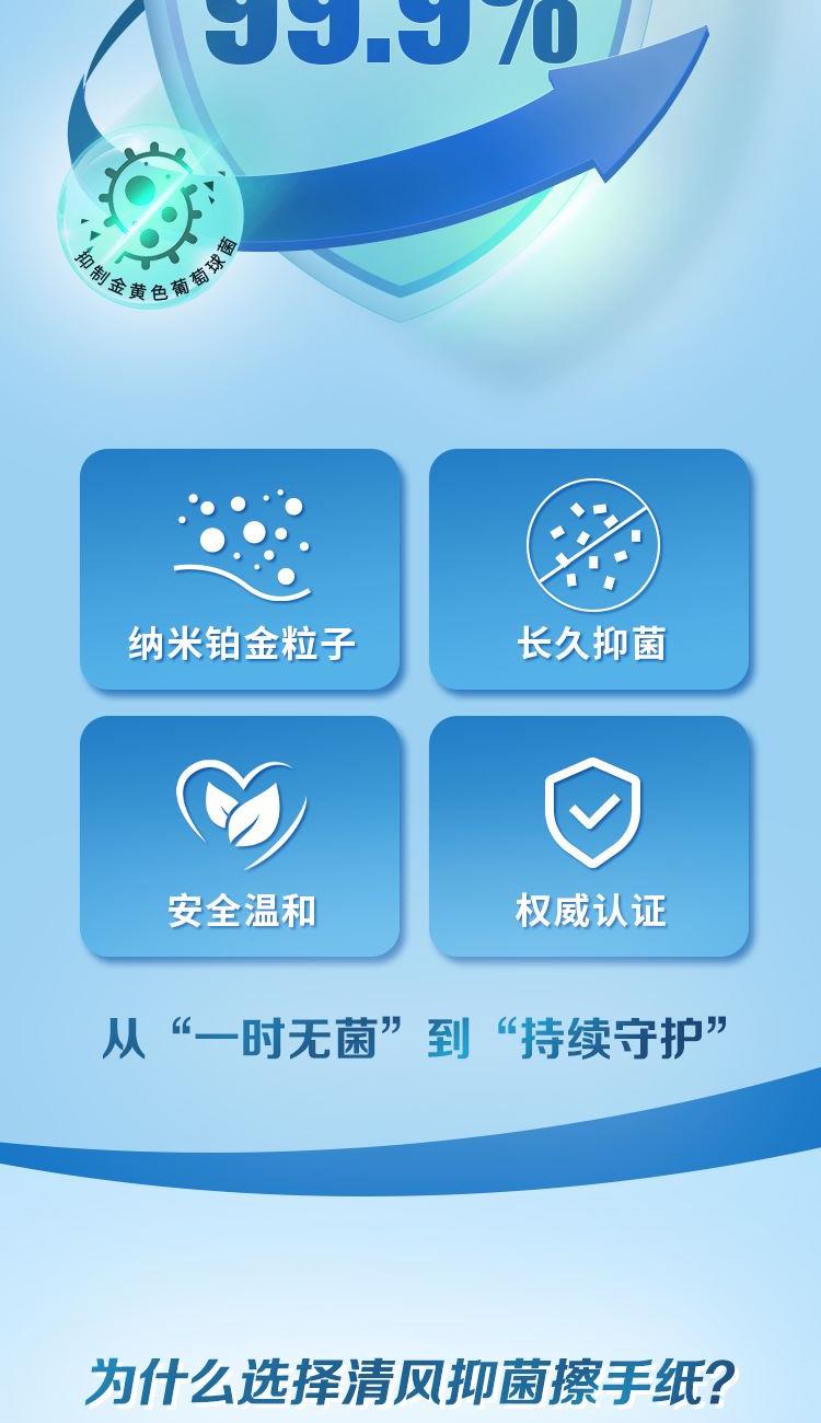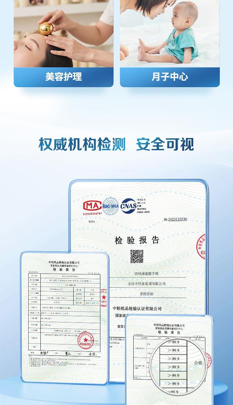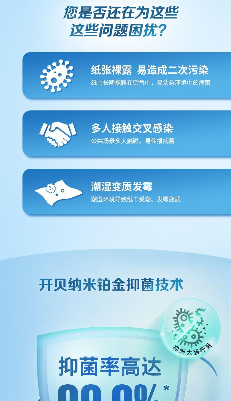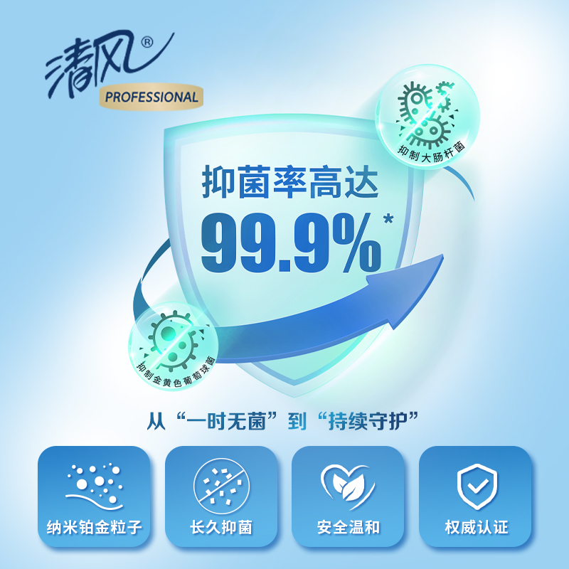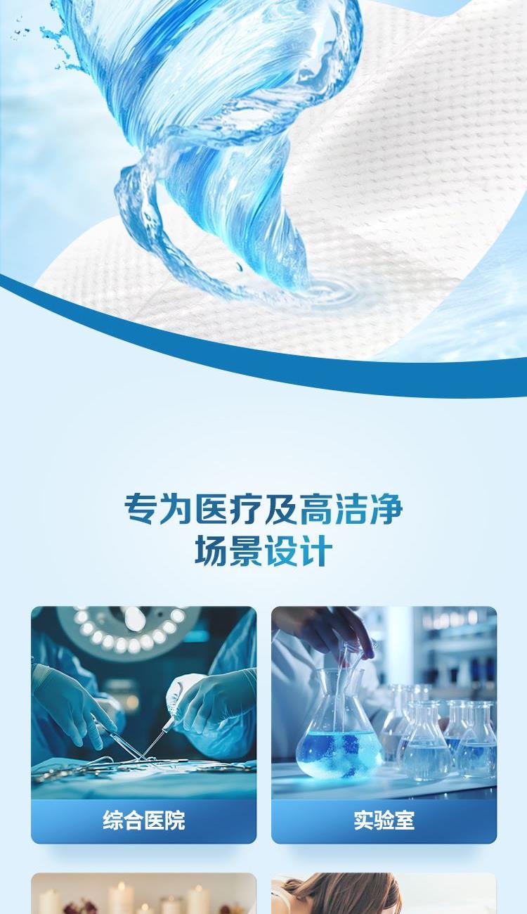 适用于专业卫生环境,纳米铂金粒子,安全温和,权威认证,原生木浆,不含可迁移荧光物质,厚柔亲肤,3D立体瞬吸水一张即可。