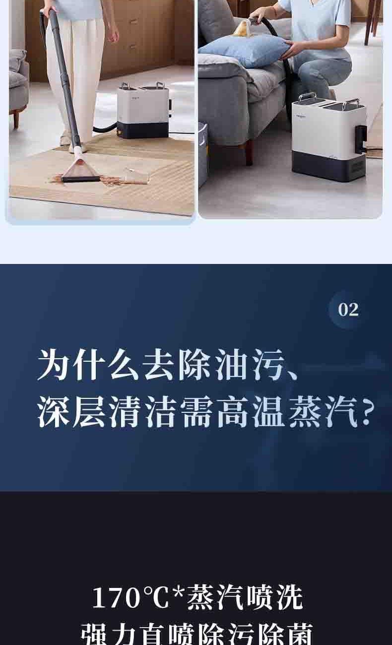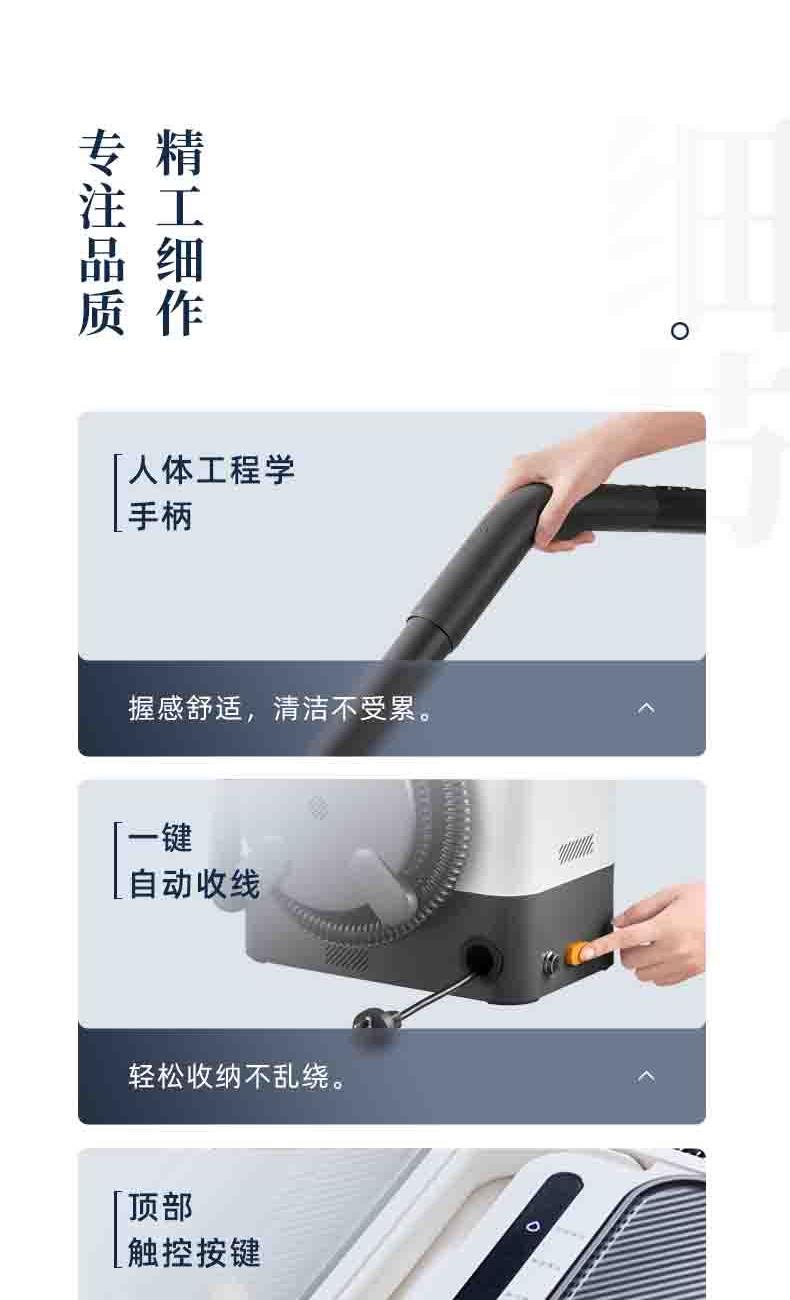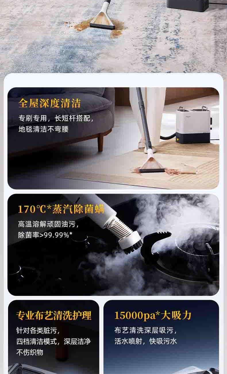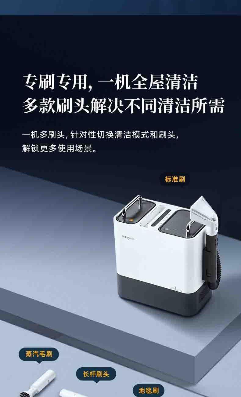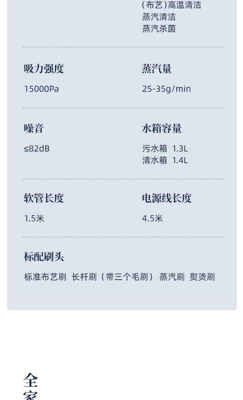 容量:净水箱1.4L、污水箱1.3L 吸力强度:15000PA 功率:2000W 毛重:10.34kg 产品尺寸:374*242*421mm 包装尺寸:455*332*502mm 高温蒸汽强清洁 专刷专用全屋净