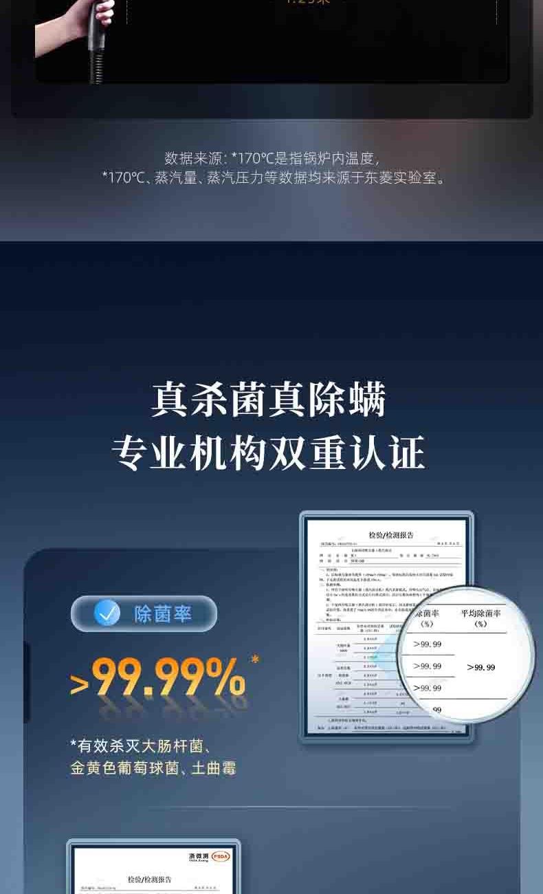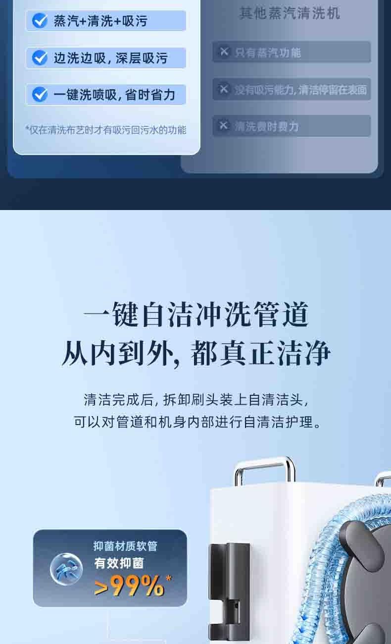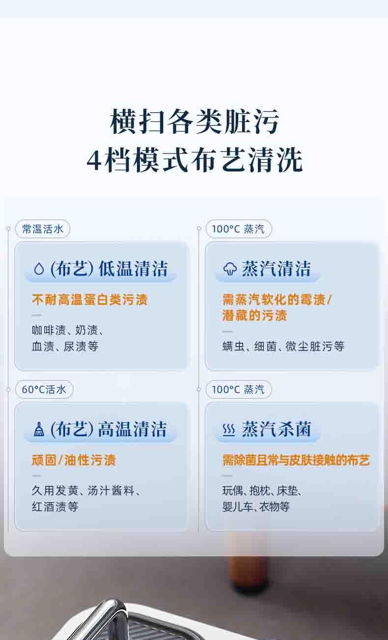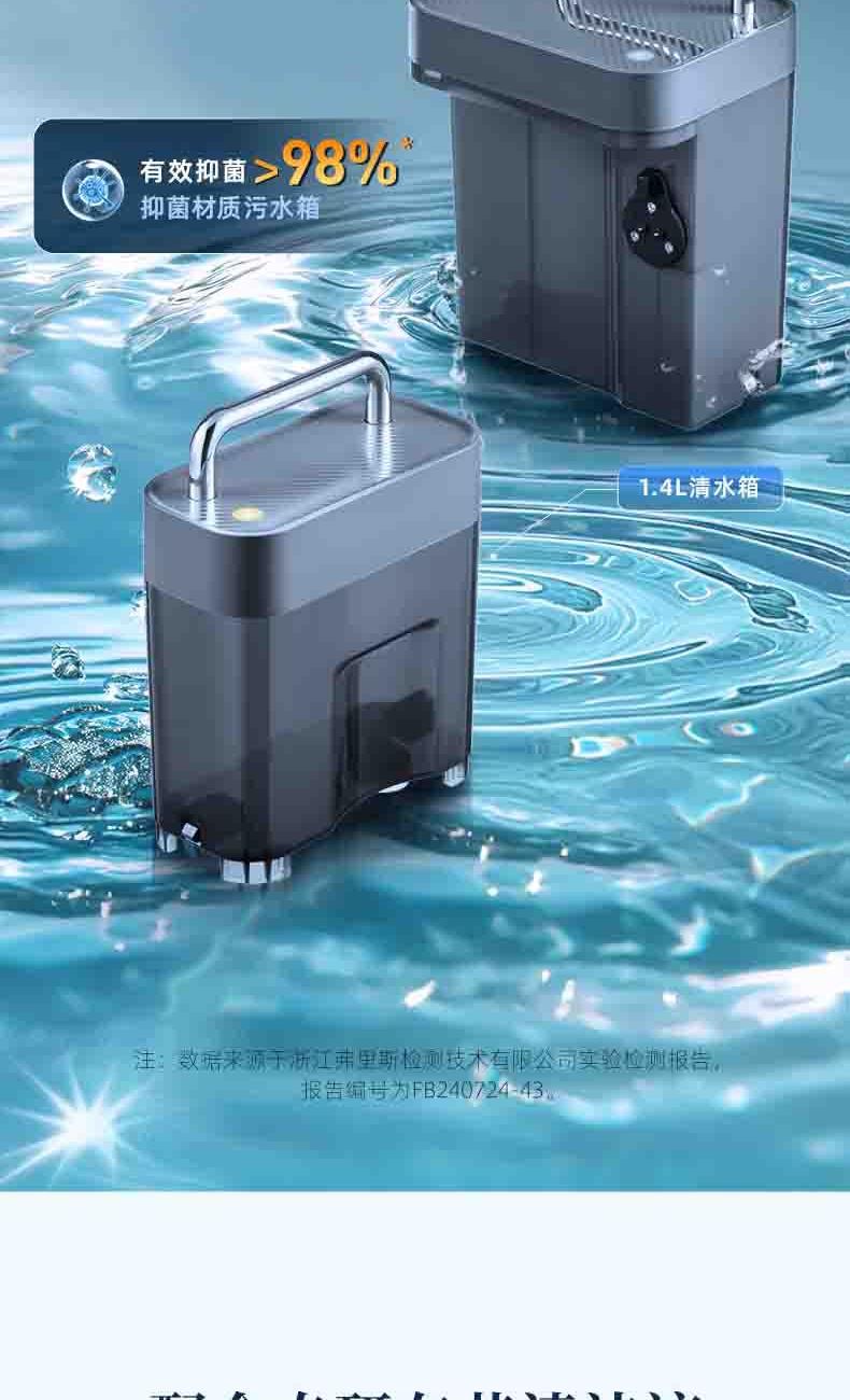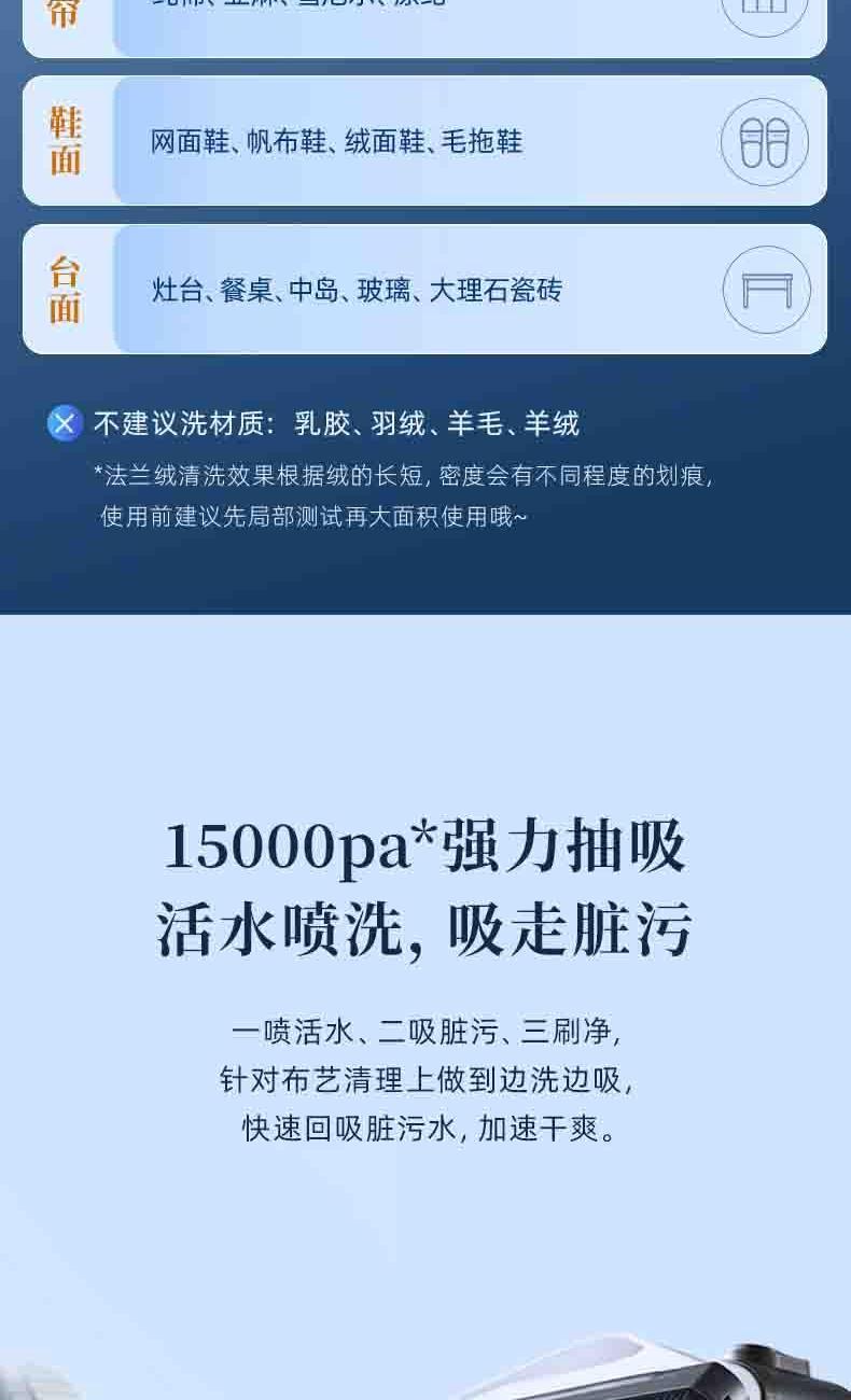 容量:净水箱1.4L、污水箱1.3L 吸力强度:15000PA 功率:2000W 毛重:10.34kg 产品尺寸:374*242*421mm 包装尺寸:455*332*502mm 高温蒸汽强清洁 专刷专用全屋净