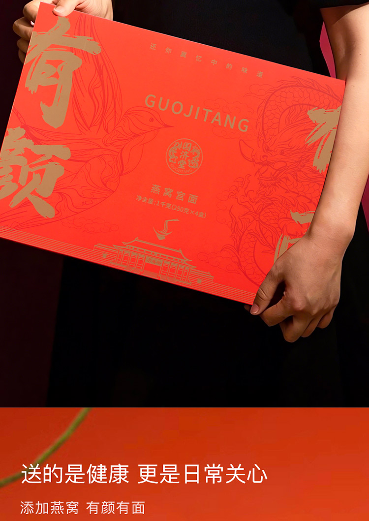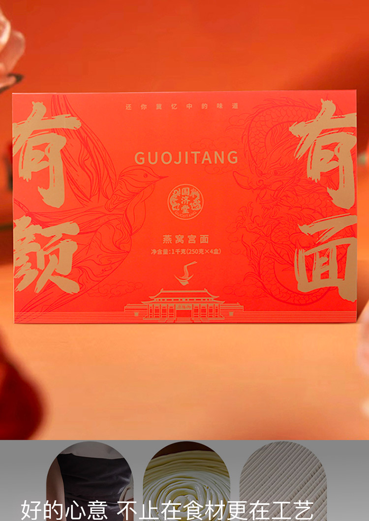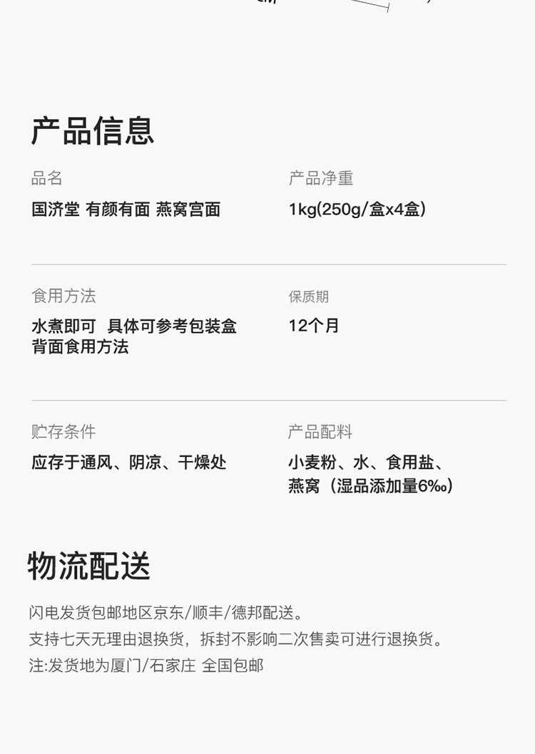 皇家御用宫廷风,龙年大吉,尊贵之享; 有颜又有面,”颜“同”燕“ 有颜值 高适配 不拘泥于传统模式, 添加燕窝,滋补有礼 养生御用燕窝; 配置:250克/盒×4盒 净含量:1千克 配料:小麦粉、水、食用盐、燕窝(湿品添加量6‰) 食用方法:水煮即可,具体可参考包装盒背面食用方法。 贮存条件:应存于通风、阴凉、干燥处。 保质期:12个月 礼盒尺寸:35.8*24.3*5.5cm 注:【需整箱拿货】