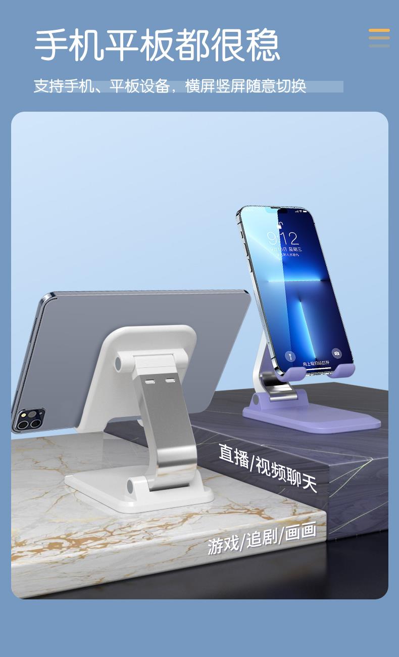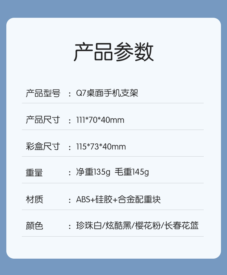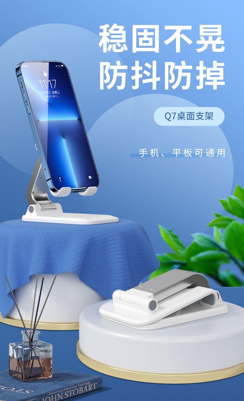 手机平板桌面支架Q7 型 号: Q7 产品尺寸 :110*70*38mm 包装尺寸 :115*74*42mm 产品净重 :128g 产品毛重 :138g 材质 :ABS+PC+硅胶+金属配重块 颜色 :黑色,白色,紫色,粉色 【功能特点】: 硅胶配重升级款更稳定可折叠可伸缩 90°角度调节ABS面板防滑条纹 手机、平板均可使用预留充电位,边看边充 手机平板追剧办公学习稳如泰山