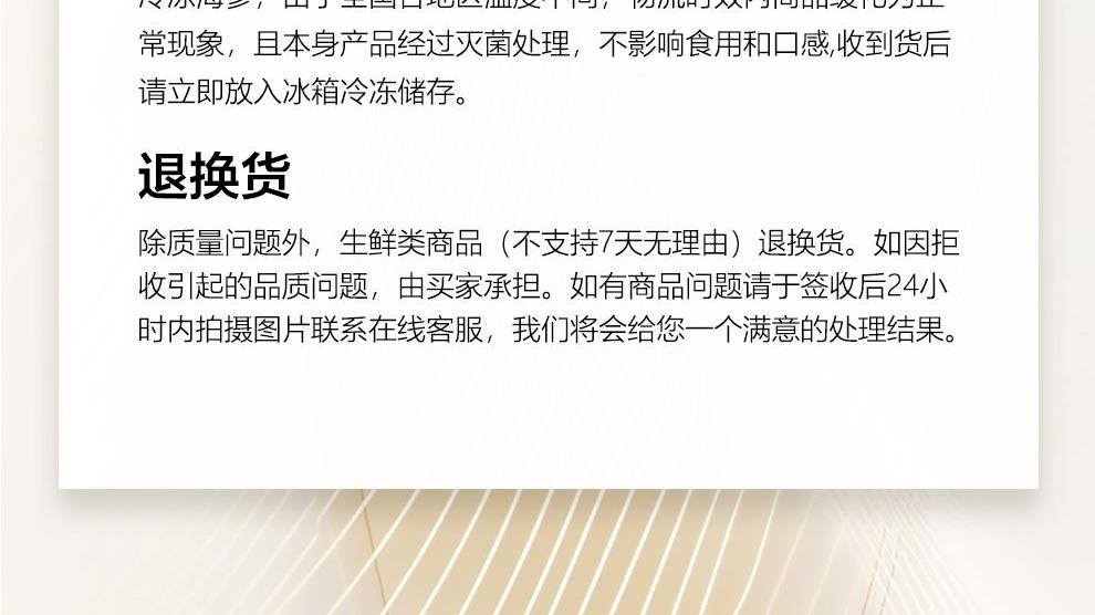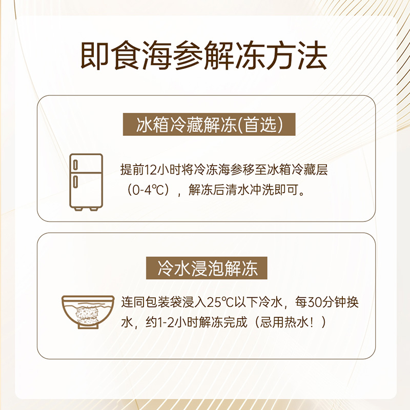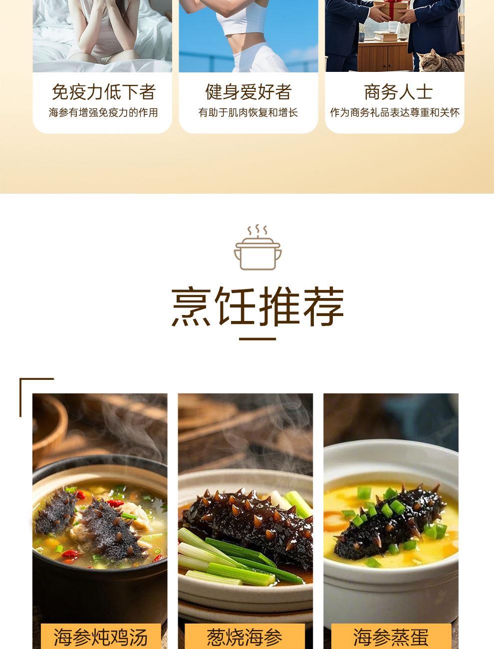 规格:1000克/(16-24头) 卖点: 京润堂大连即食海参选自黄金海域北纬39°的辽参,海域环境好,水质清洁、温度适宜,海参品质高。选取参龄5年以上的辽参,富含多种营养成分,如高蛋白含量,海参粘多糖, 维生素和多种微量元素,具有调节体质、抗疲劳、抗肿瘤等潜在功效。