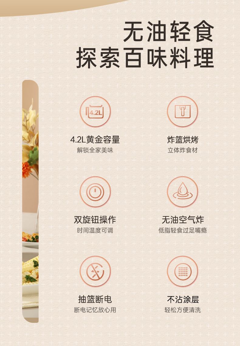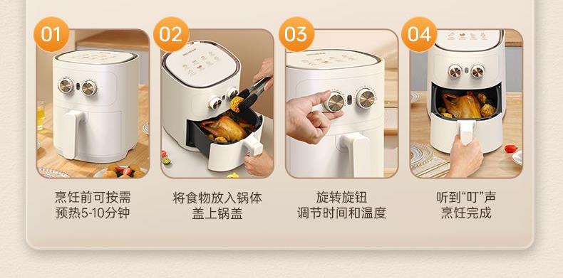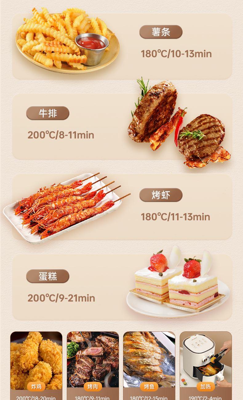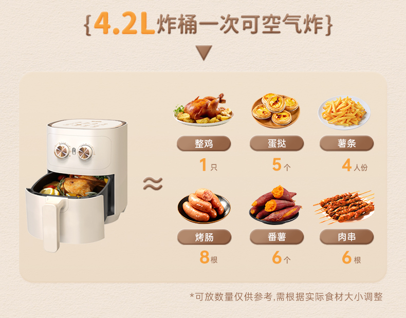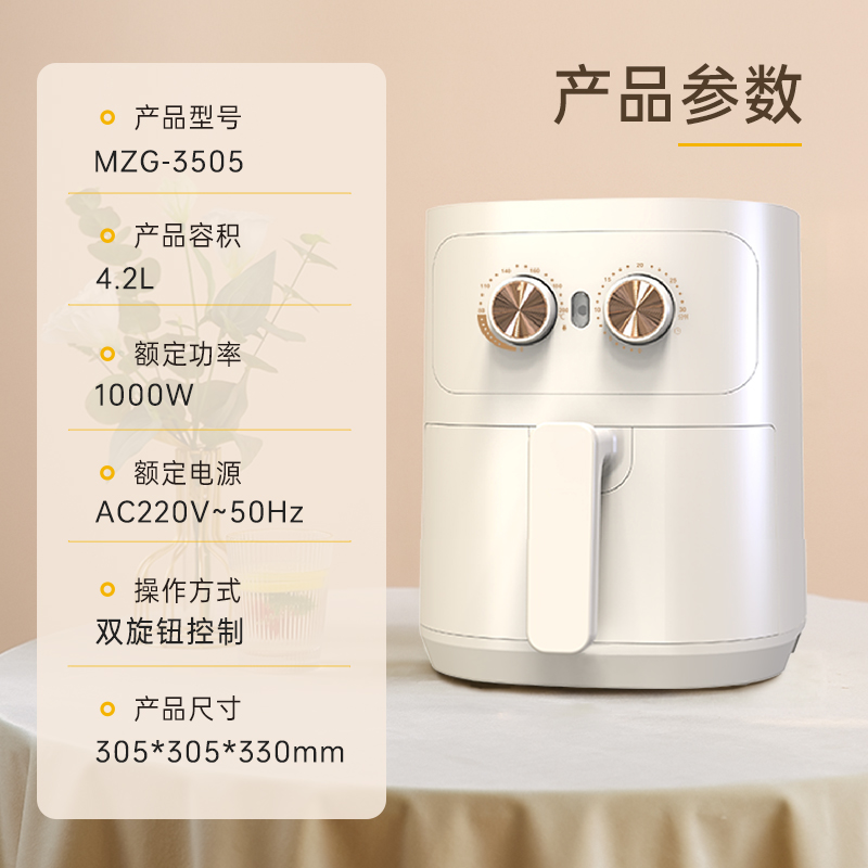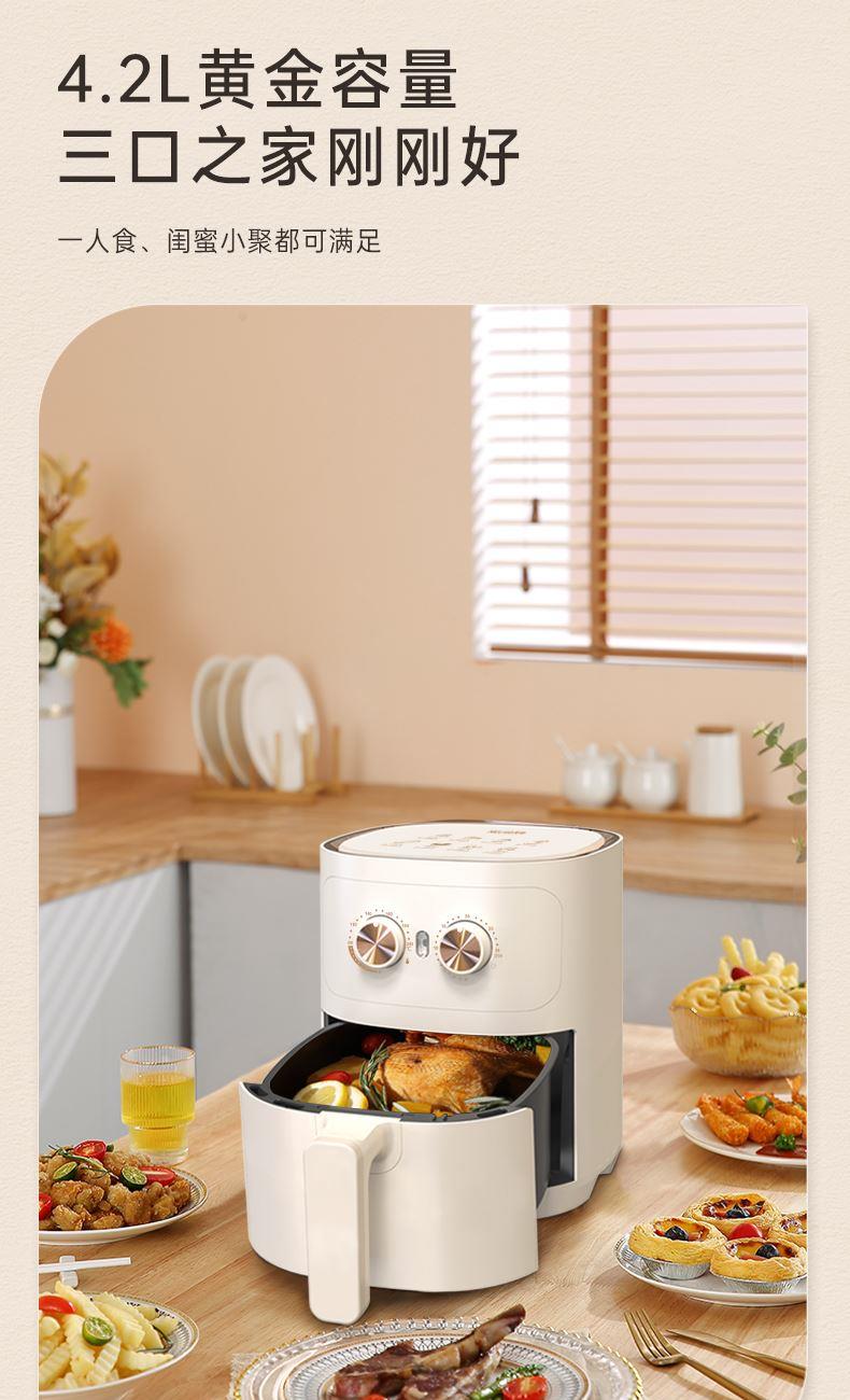 产品参数: 容积:4.2L 额定功率:1000W 操作方式:双旋钮操作 产品尺寸:305*305*330mm 产品卖点: 1.无油炸,脱脂烤,不烤焦,更健康 2.4.2L黄金容量,双旋钮操作 3.抽篮断电,不粘涂层 分离式炸篮,轻松清洁油渍