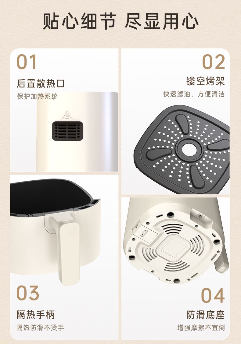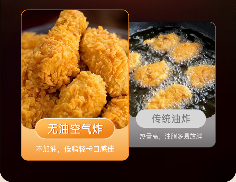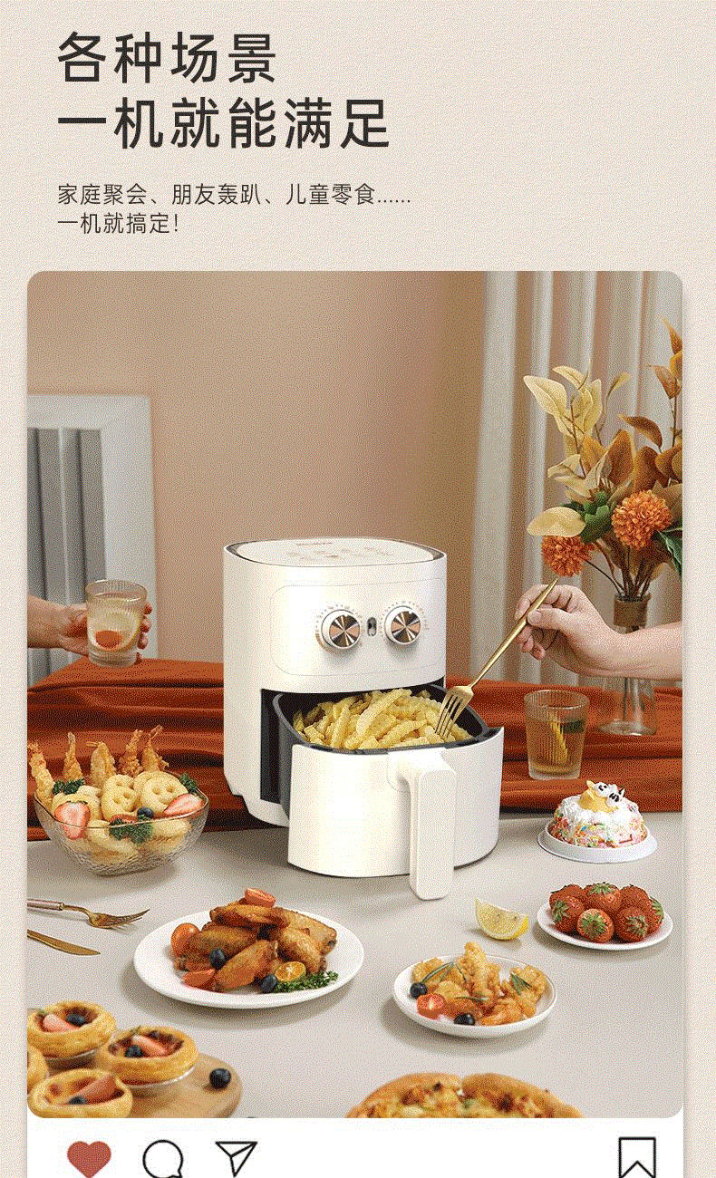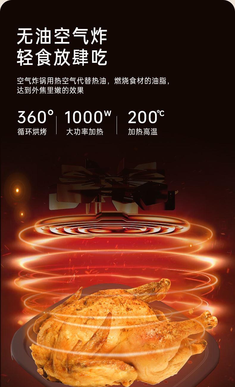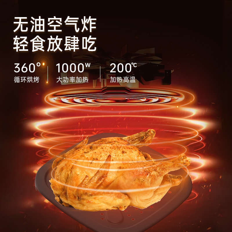 产品参数: 容积:4.2L 额定功率:1000W 操作方式:双旋钮操作 产品尺寸:305*305*330mm 产品卖点: 1.无油炸,脱脂烤,不烤焦,更健康 2.4.2L黄金容量,双旋钮操作 3.抽篮断电,不粘涂层 分离式炸篮,轻松清洁油渍
