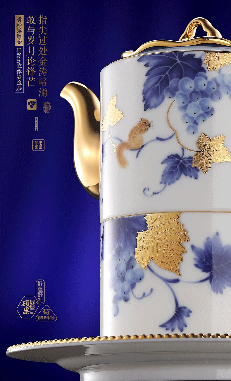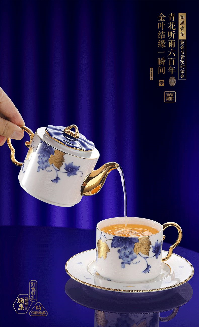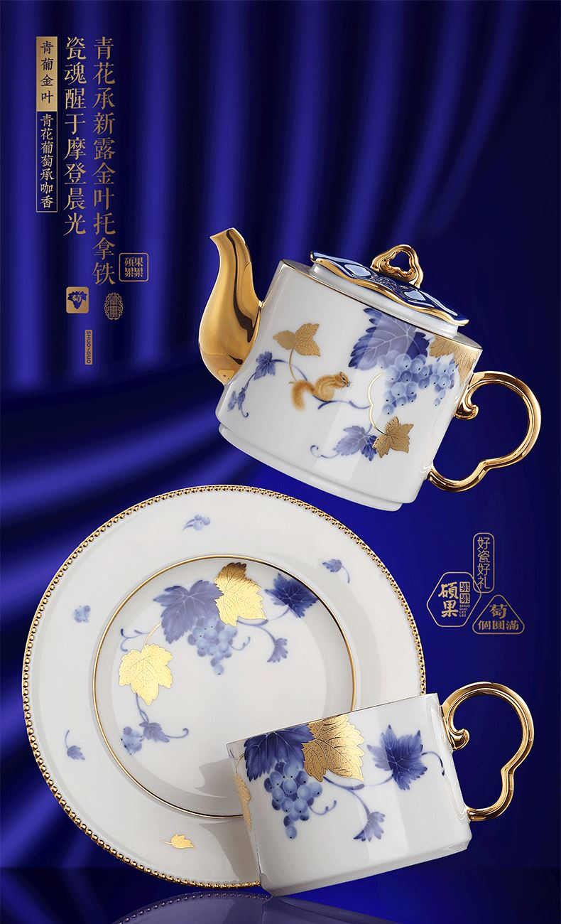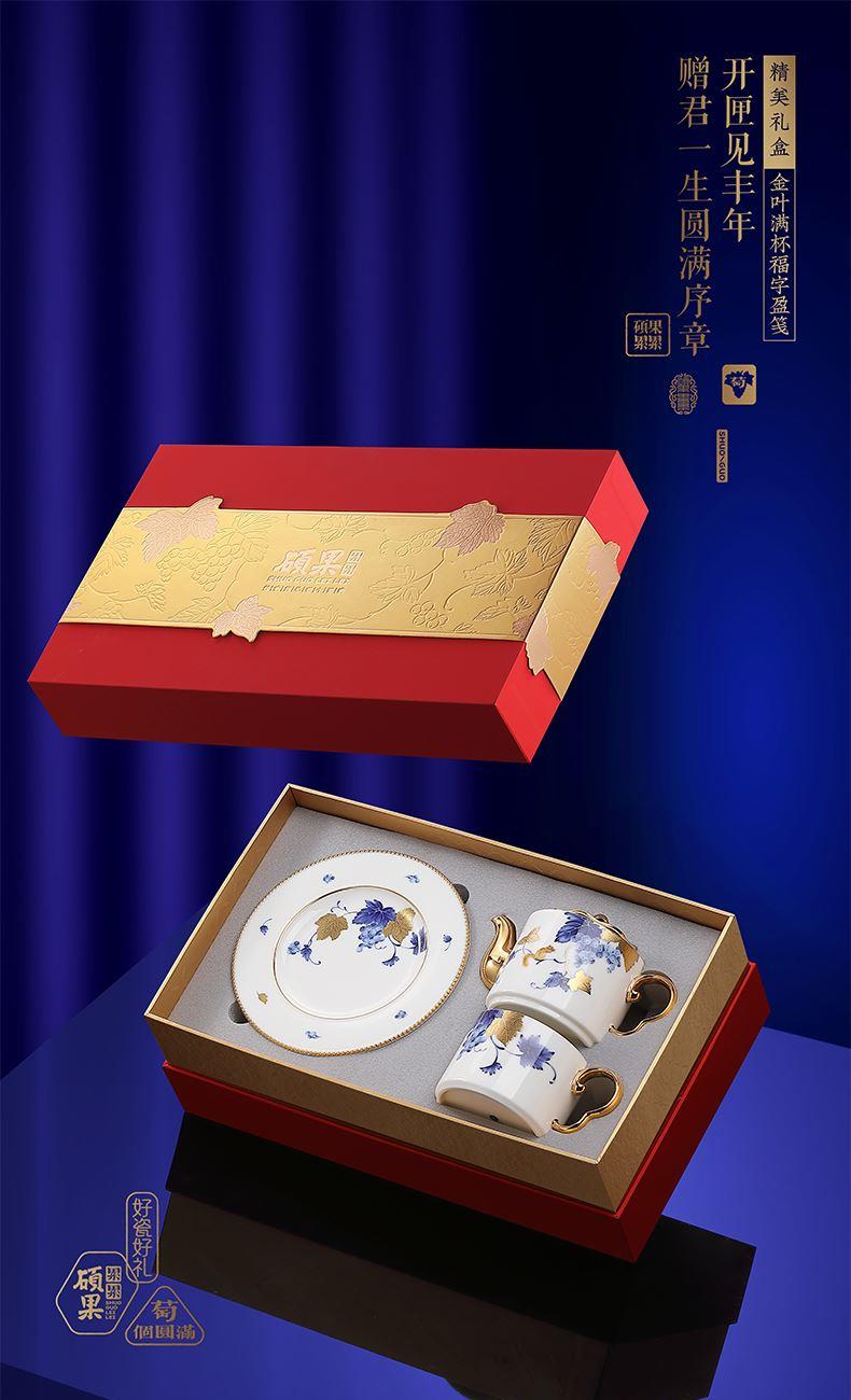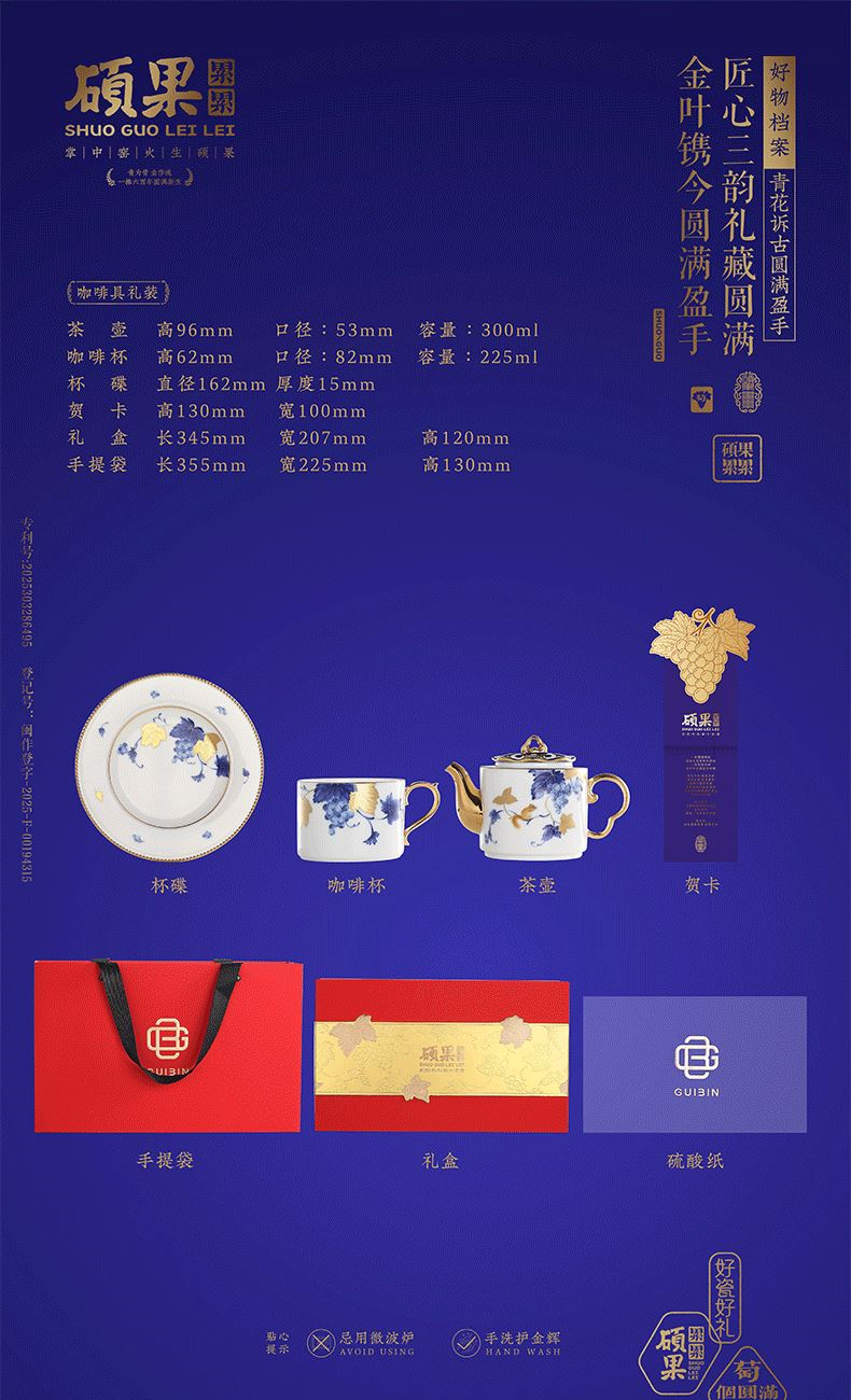 硕果累累茶咖具礼装 1.茶壶:高96mm、口径:53mm、容量:300ml 2.咖啡杯:高62mm、口径:82mm、容量:225ml 3.杯碟:直径162mm、 厚度15mm 4.贺卡:高130mm、宽100mm 5.礼盒:长345mm、宽207mm、高120mm 6.手提袋:长355mm、宽225mm、高130mm