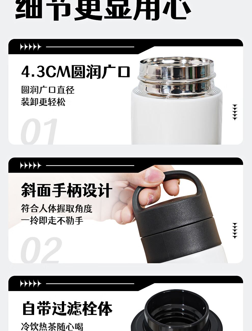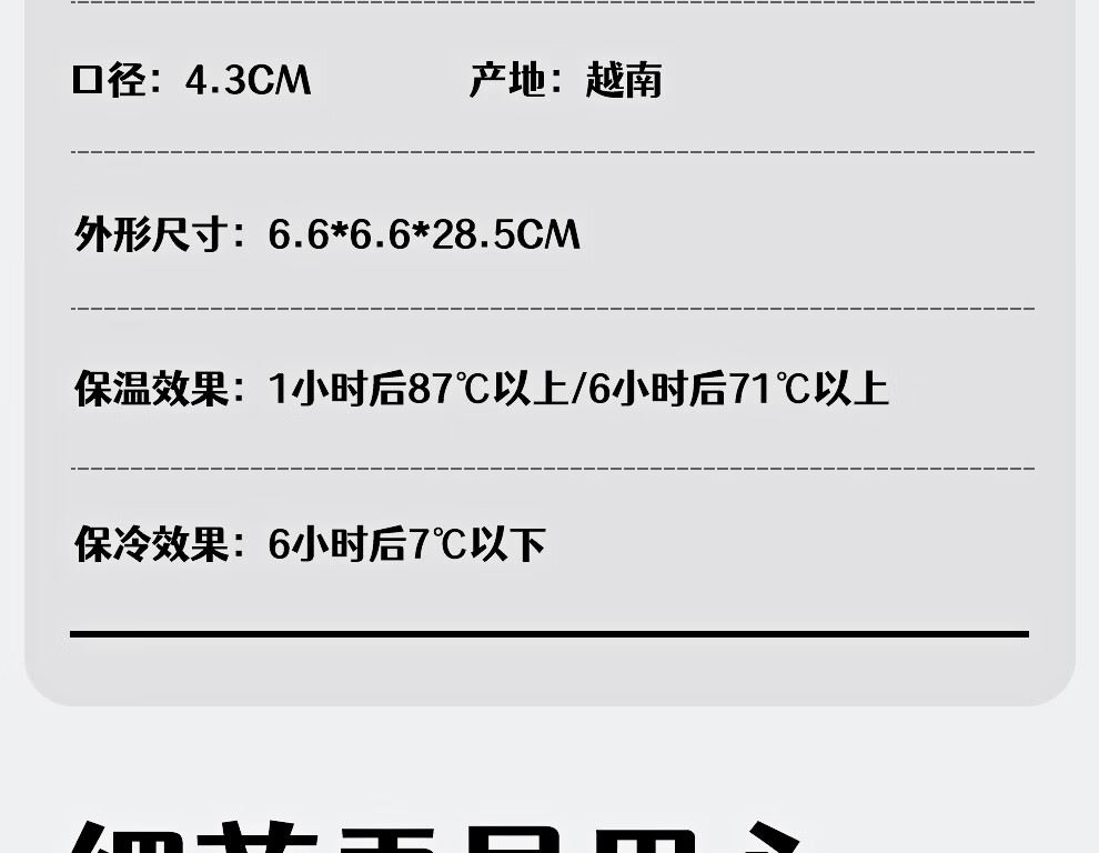 商品毛重:0.24kg 口径:4.3cm 容量:600ml 保温效果:1小时后85°C以上/6小时后63°C以上保冷效果:1小时后9°C以下(保温:95°C沸水/保冷:4℃冰水倒入) 便携提手 保温保冷 可用洗碗机清洗 304不锈钢 出门便携