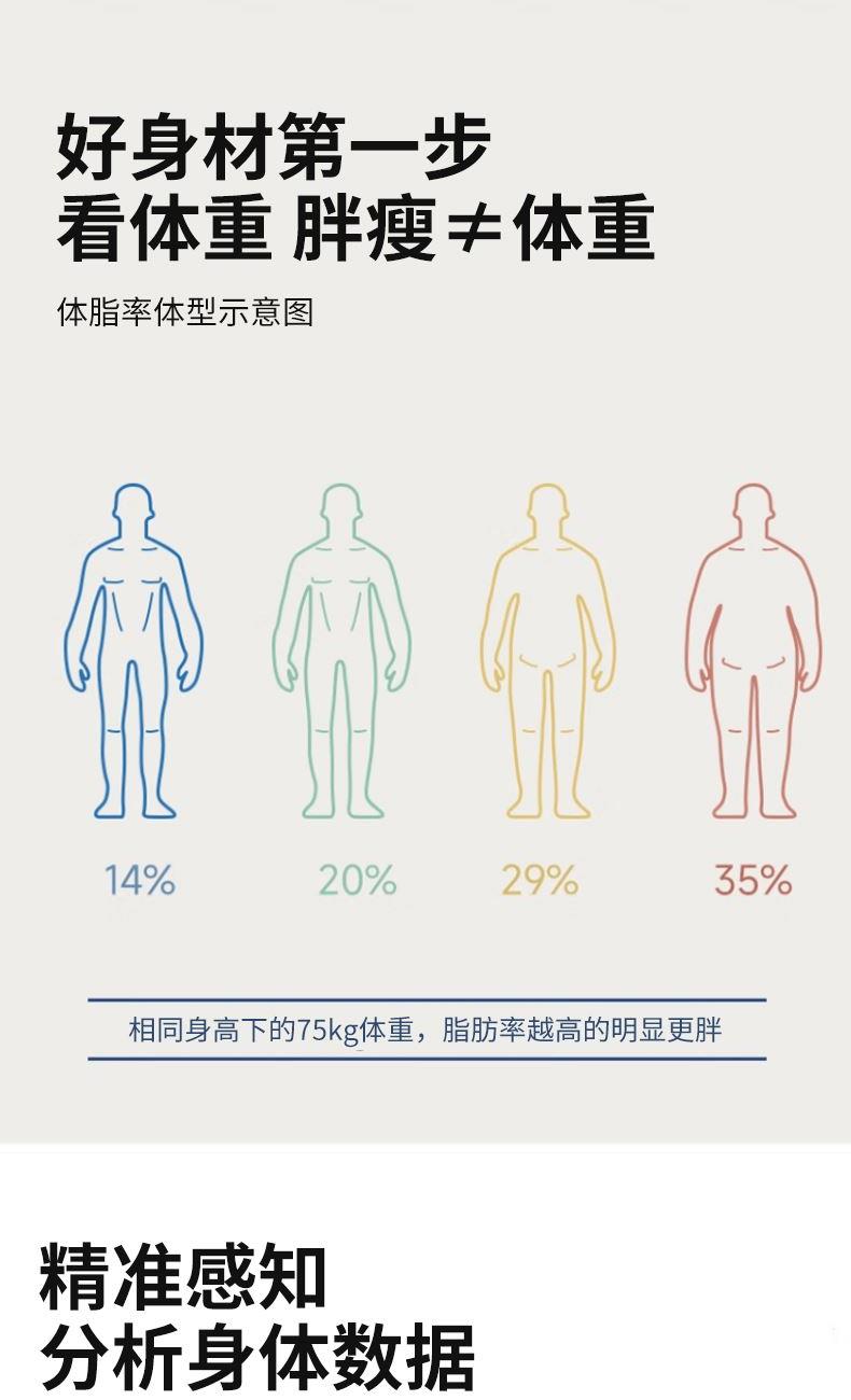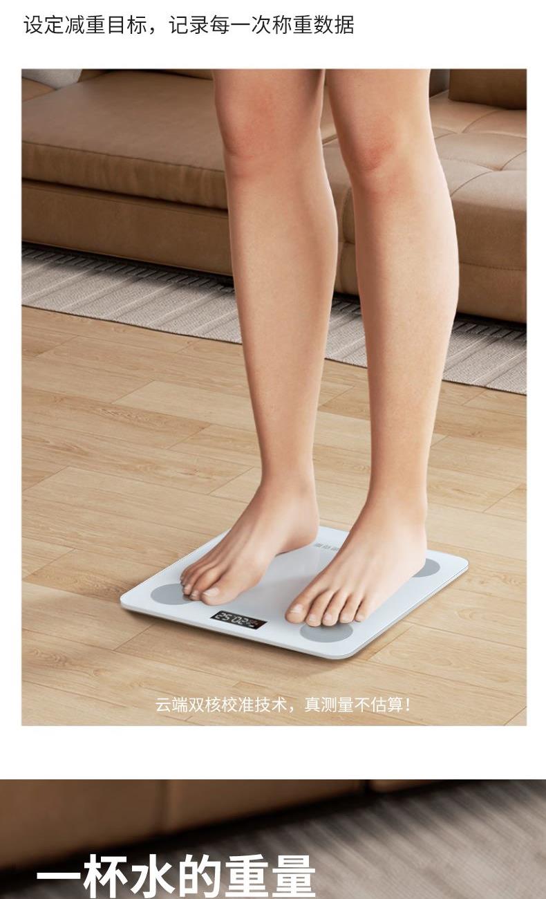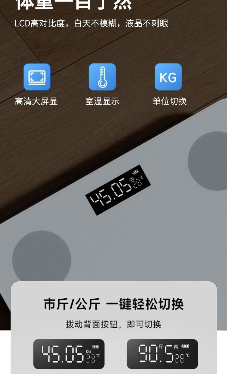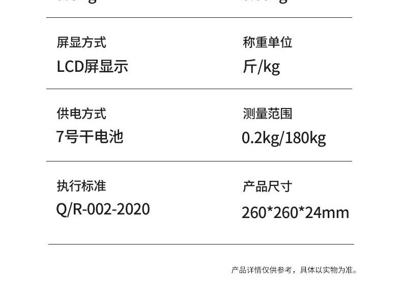额定输出:3.7V⎓ 分度值:0.05KG 屏幕显示:LCD 智能链接:APP 称重:180kg/360斤 供电方式:2节7号电池 材质:面板钢化玻璃 底座ABS 0.05KG区分一杯水差异 上秤5秒即可分析身体数据 360斤承重上秤自动感应 智能APP云端查看 同步健康数据 超长续航/加厚化玻璃经久耐用