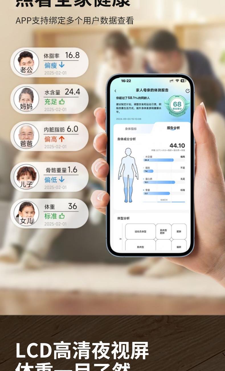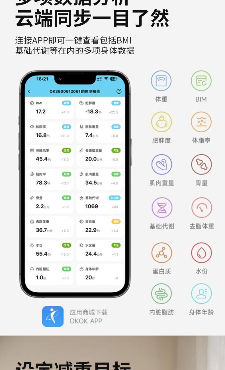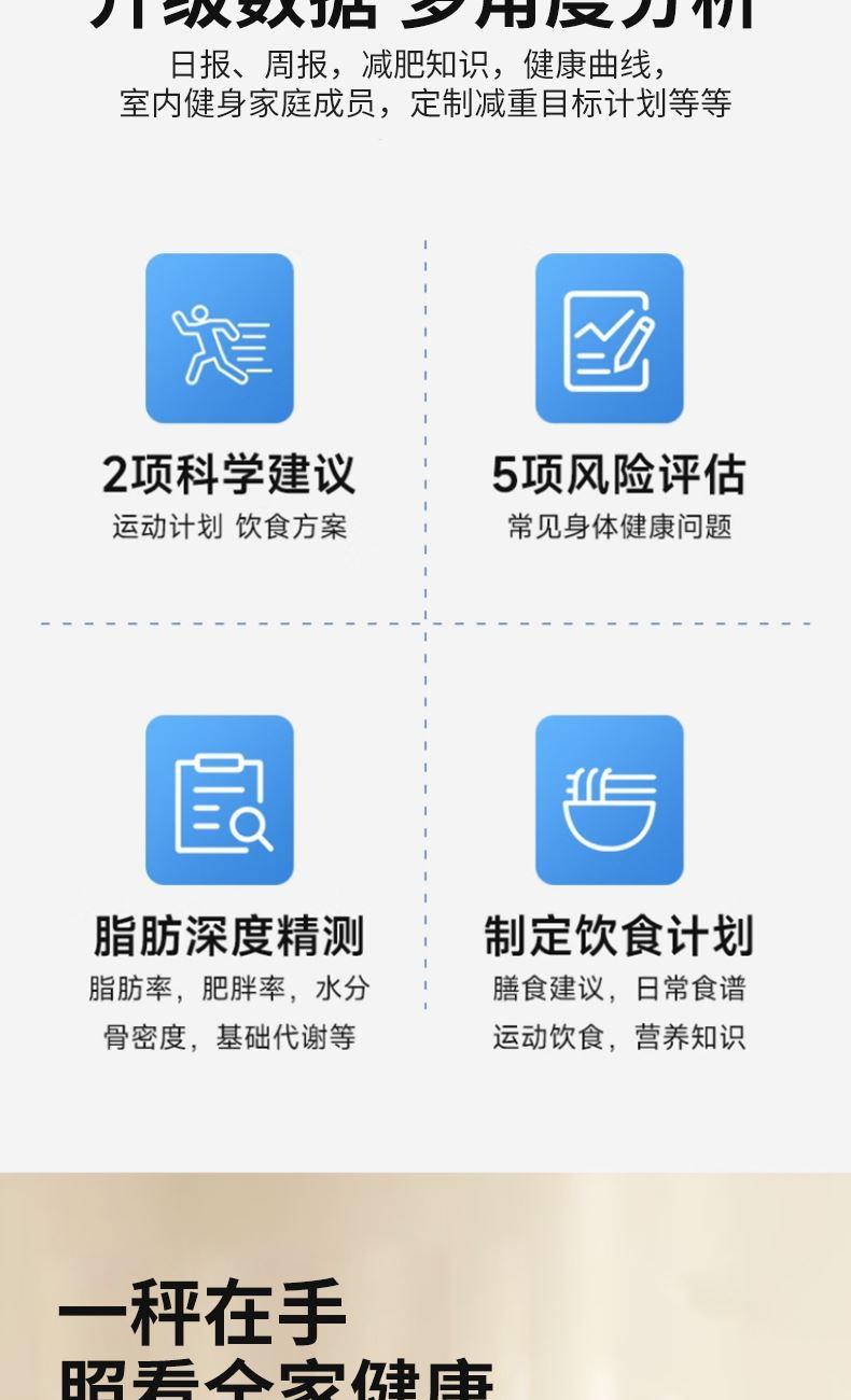 额定输出:3.7V⎓ 分度值:0.05KG 屏幕显示:LCD 智能链接:APP 称重:180kg/360斤 供电方式:2节7号电池 材质:面板钢化玻璃 底座ABS 0.05KG区分一杯水差异 上秤5秒即可分析身体数据 360斤承重上秤自动感应 智能APP云端查看 同步健康数据 超长续航/加厚化玻璃经久耐用
