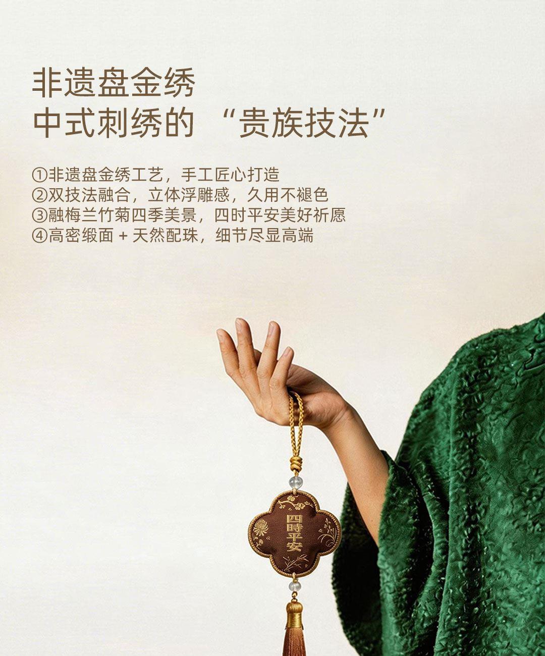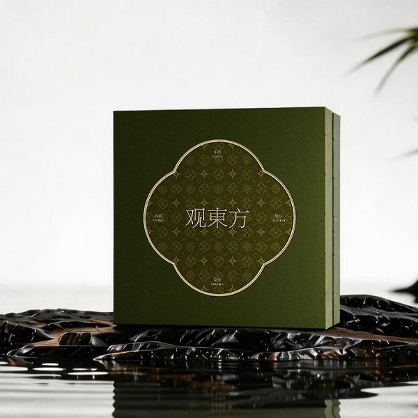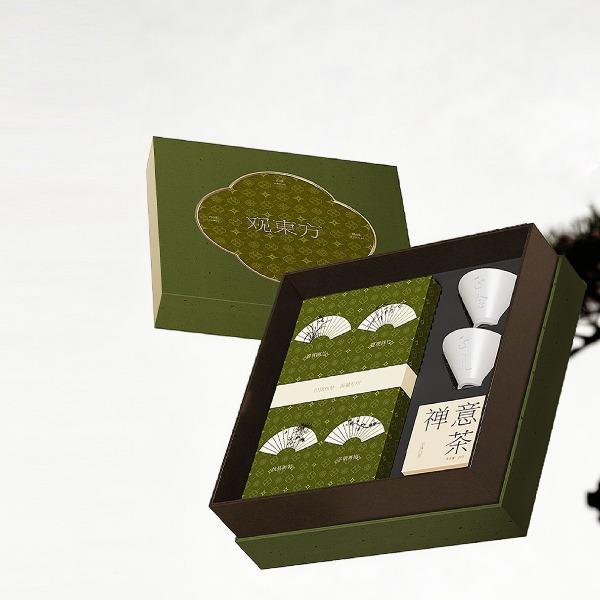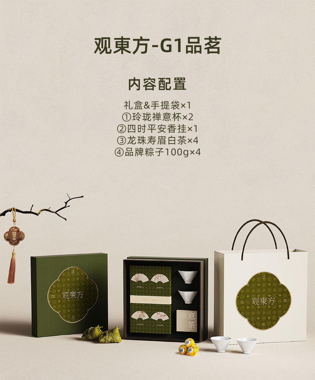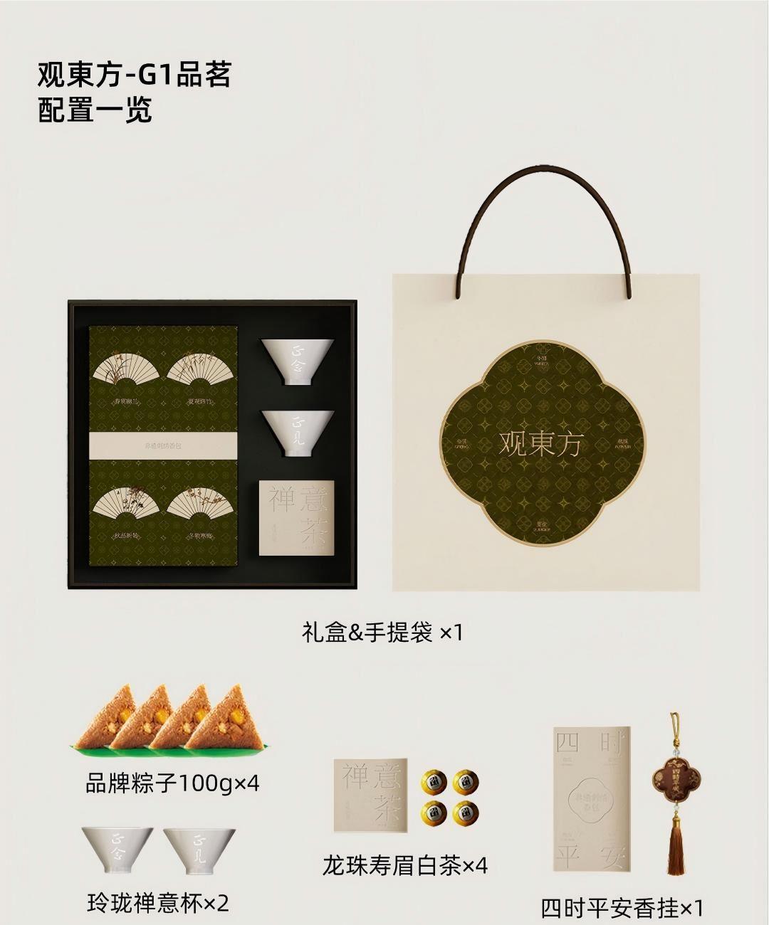 礼盒套装配置如下: 1、精致礼盒包装,尺寸: 278*278*100mm 卖点:礼盒底纹以中式四方连续锦纹为核心视觉载体,选用沉稳墨绿为底色,铺陈同色系低对比纹样,复刻宋锦与古纸的温润肌理质感。 2、玲珑禅意杯×2 卖点:能透光的玲珑杯,采用玲珑瓷繁复工艺,每寸镂空皆需精心雕琢。 3、龙珠寿眉白茶×4 卖点:福鼎寿眉白茶原产,太平洋保险承保,品质保证。 4、四时平安香挂,尺寸:70*70mm 卖点:非遗盘金绣工艺,高密缎面 + 天然配珠,久用不褪色 5、荃盛粽子 (红袍豆沙粽子*100g、原味糯香粽子*100g、火腿鲜肉粽子*100g、精典鲜肉粽子*100g) 卖点:低糖、低脂,荃盛创立于2004年,是国内粽子生产基地之一,是锋味、广酒等代加工厂。