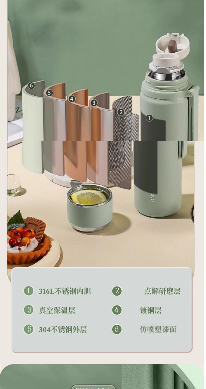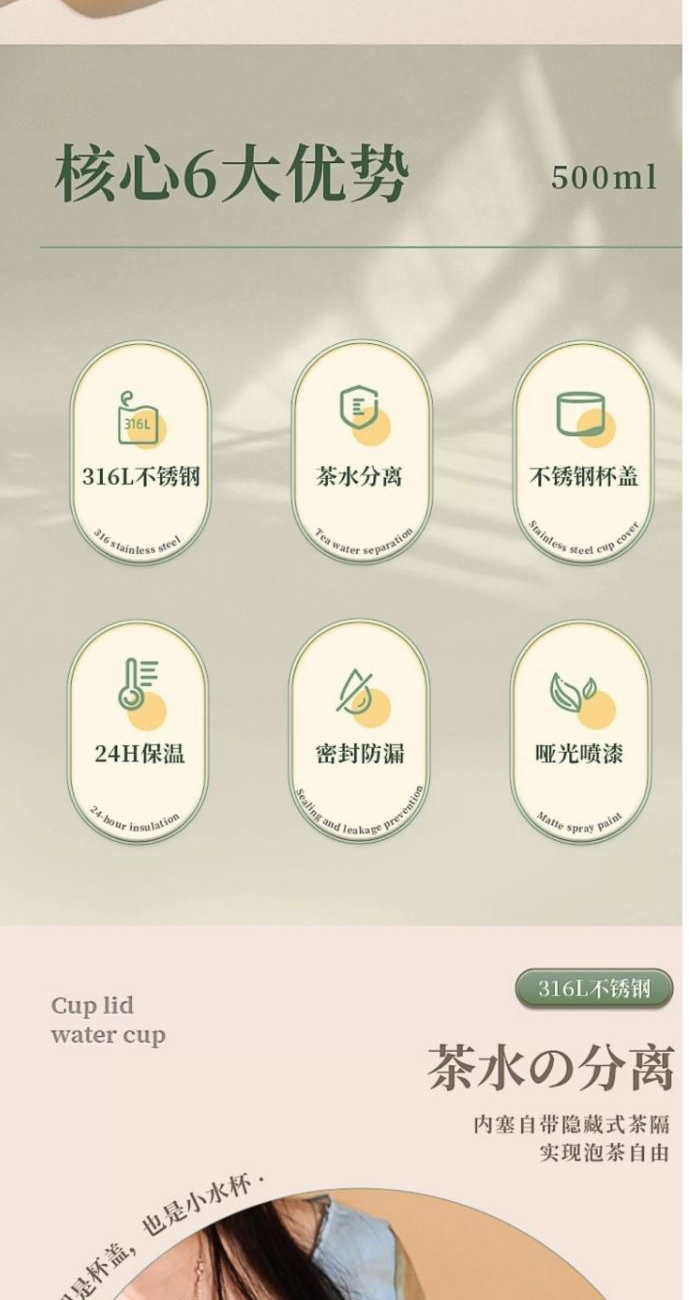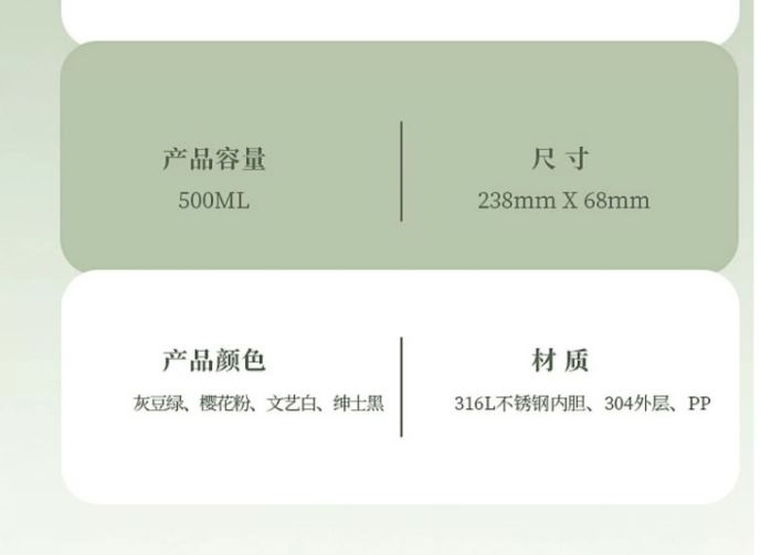 颜色:绿色 白色 粉色 黑色 尺寸:68*238 材质:316L奥氏体不锈钢内胆、食品级PP,PC配件。 不锈钢分享盖子,按压式内袋,隐藏式不锈钢茶漏。 包装:单瓦盒