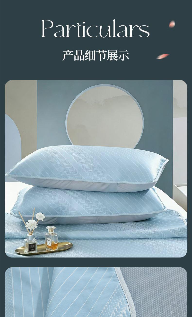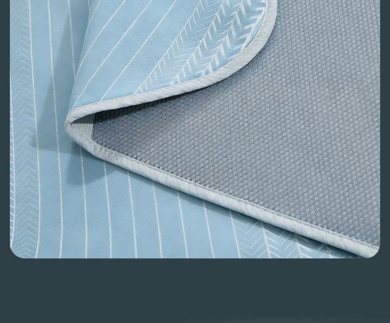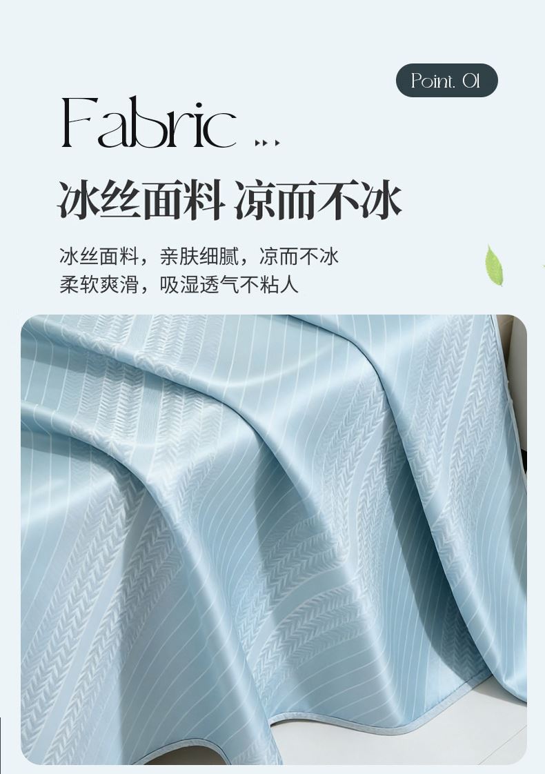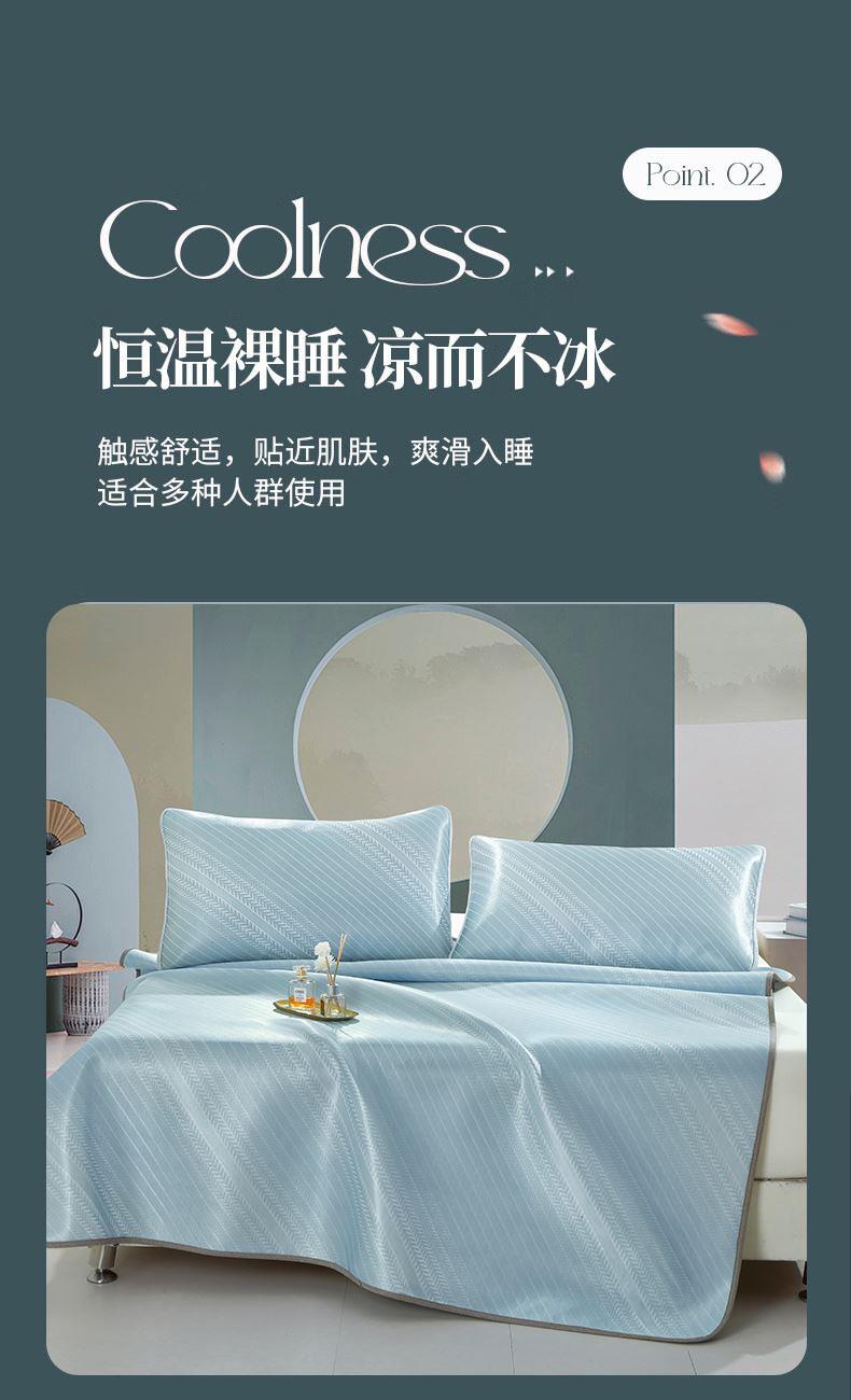 规格:180*200cm 枕套:48*74cm*2 面料:植物冰丝 复合料:华夫格 执行标准:Q/TDY 01-2016 安全类别:GB18401-2010 B类 1.萃取植物冰丝,自然清凉,凉而不冰,久睡不粘。 2.凉感冰丝纤维织物本身经过处理,可以破坏细菌的寄生环境,有效防止细菌滋生进入,切断它们的食物链,洁净卫生,适合裸睡。